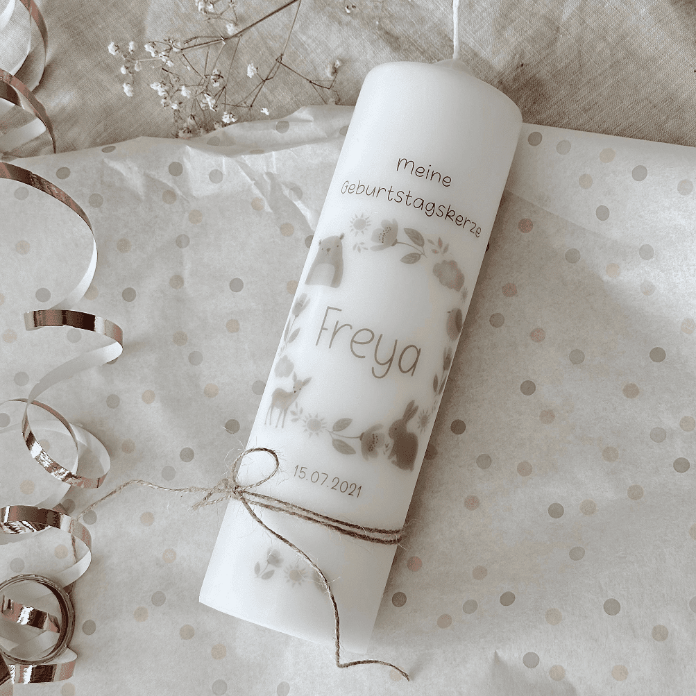 Damit dein Fest rundum stimmig und harmonisch wird, bieten wir passende Accessoires zu deiner Kerze an – perfekt aufeinander abgestimmt und im typischen Freudenkaefer-Stil, wie z.B. Serviettenanhänger, Kerzenuntersetzer und Kerzenboxen für die perfekte Aufbewahrung, die nebenbei auch ein wunderschönes Dekostück fürs Kinderzimmer sind.