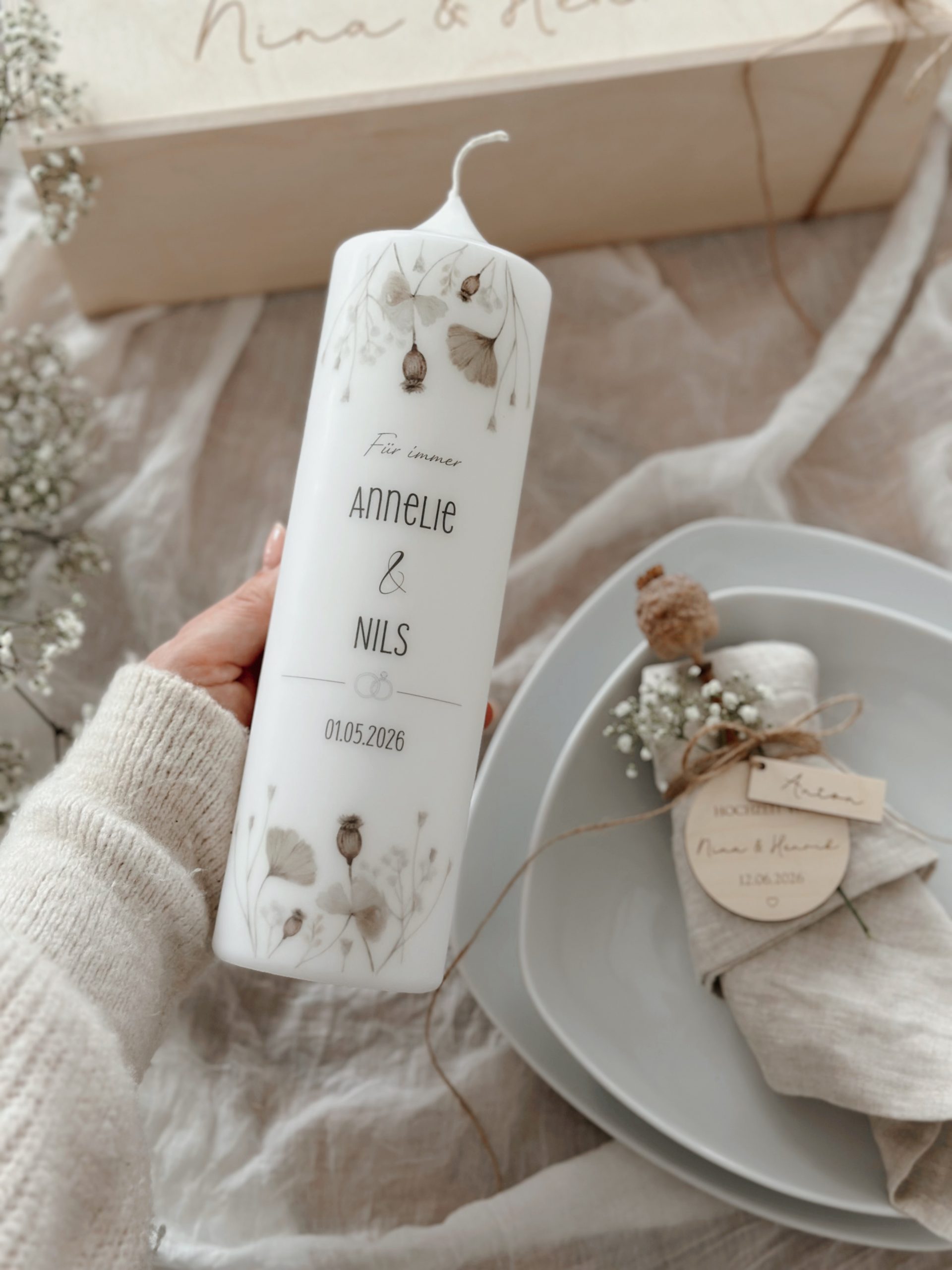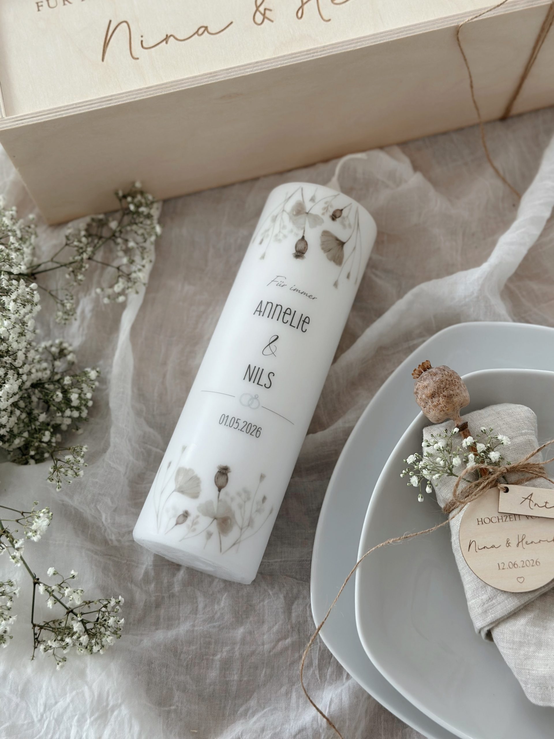 Jede Kerze wird individuell für euch gefertigt und kann mit Namen und Hochzeitsdatum personalisiert werden. Vor der Fertigung senden wir einen digitalen Entwurf zu, damit alles passt und gefällt.