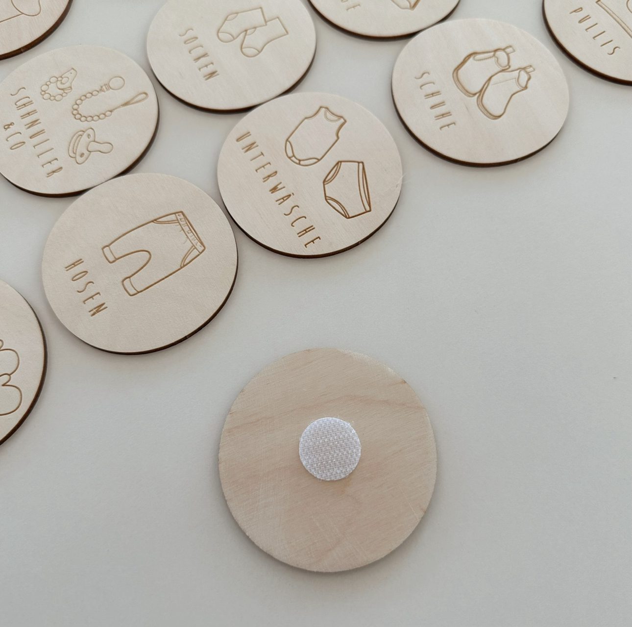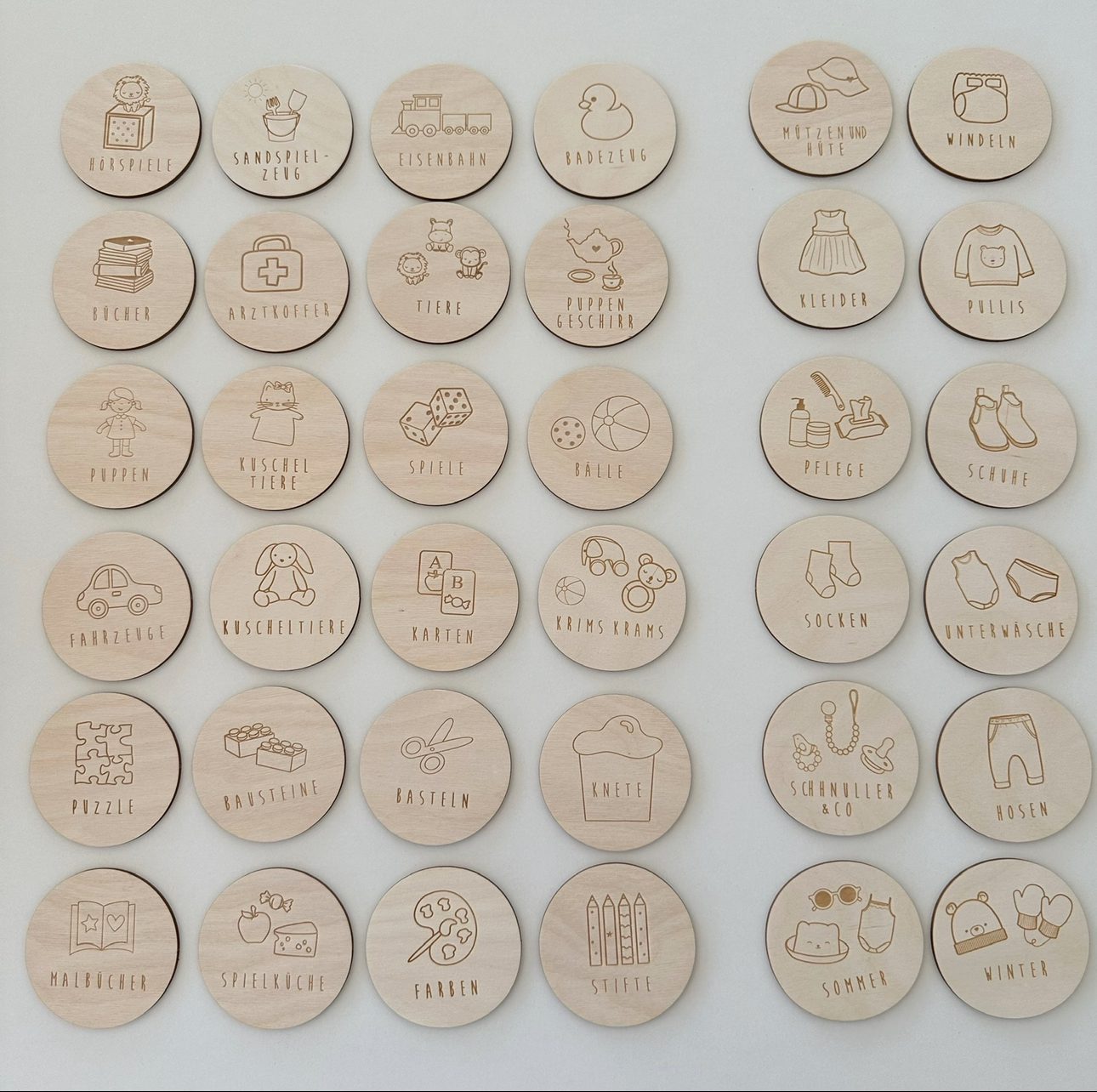 Mit ihren klar erkennbaren Symbolen aus unterschiedlichsten Kategorien machen die Holzschildchen das Sortieren und Aufräumen kinderleicht. Kinder finden sich intuitiv zurecht und können – ganz im Sinne der Montessori-Philosophie – spielerisch lernen, sich selbst zu organisieren, mitzuhelfen oder sich sogar eigenständig anzuziehen (z. B. eine klar markierte Sockenschublade).