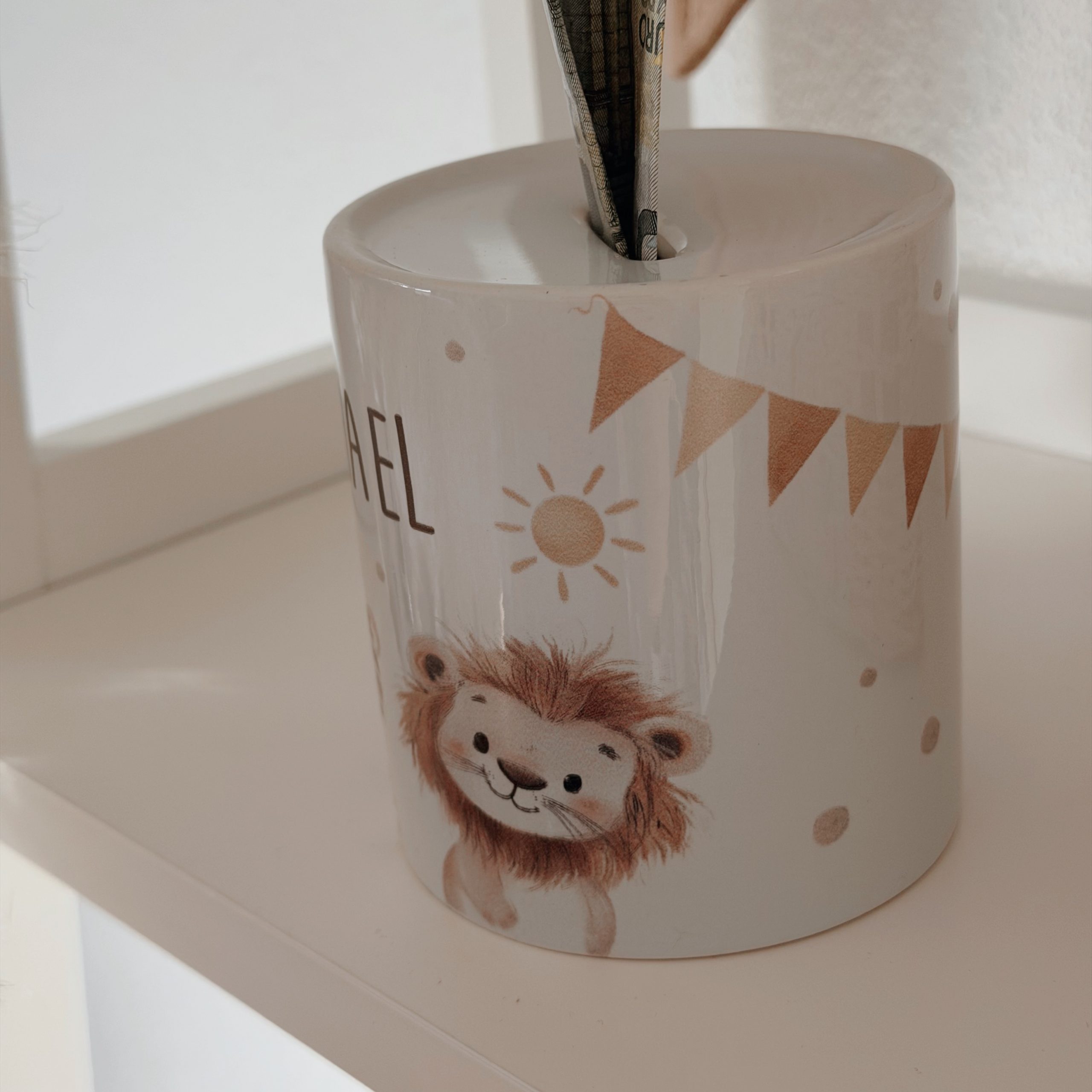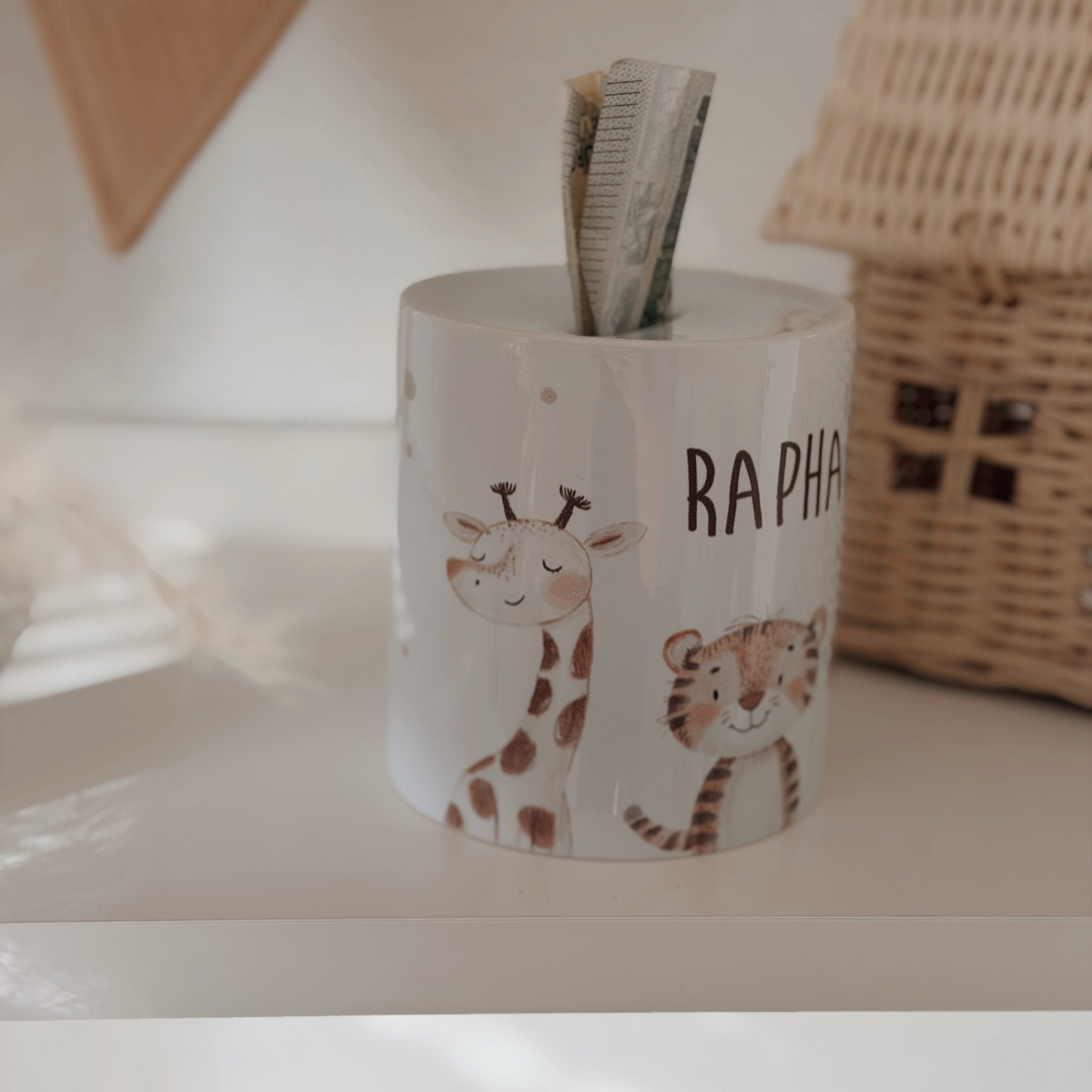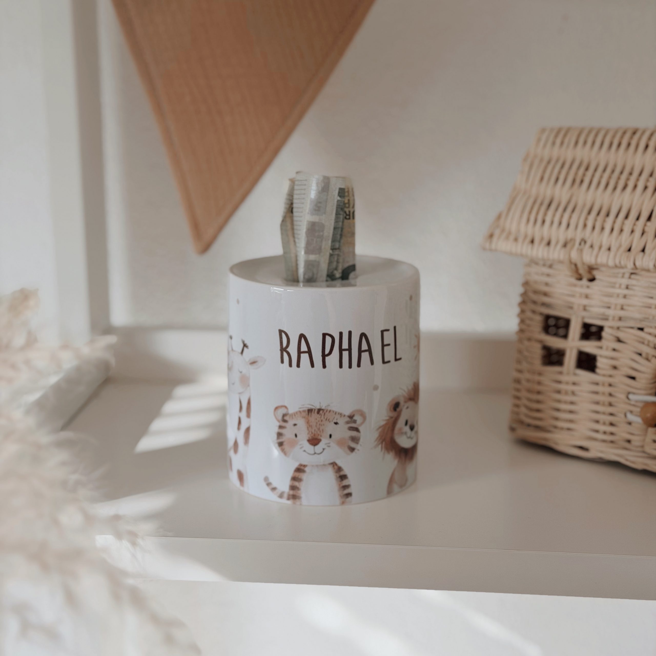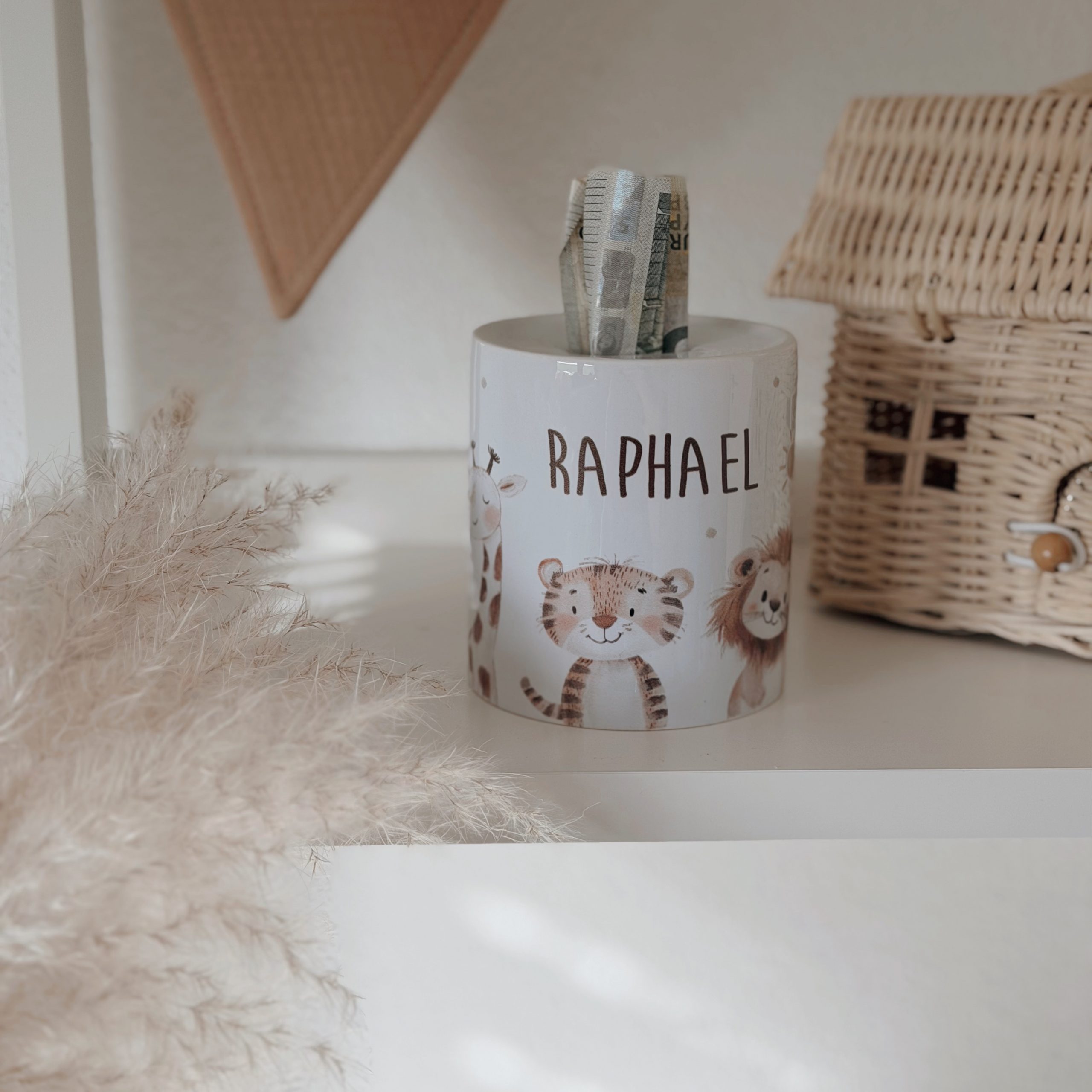 Unsere süße personalisierbare Spardose „Zoo-Tiere“ mit süßen schlichten Tiermotiven (Giraffe, Tiger und Löwe) bedruckt, individuell mit Name, ist das perfekte Geschenk für die ersten Münzen zur Geburt, zur Taufe oder zum Kindergeburtstag.