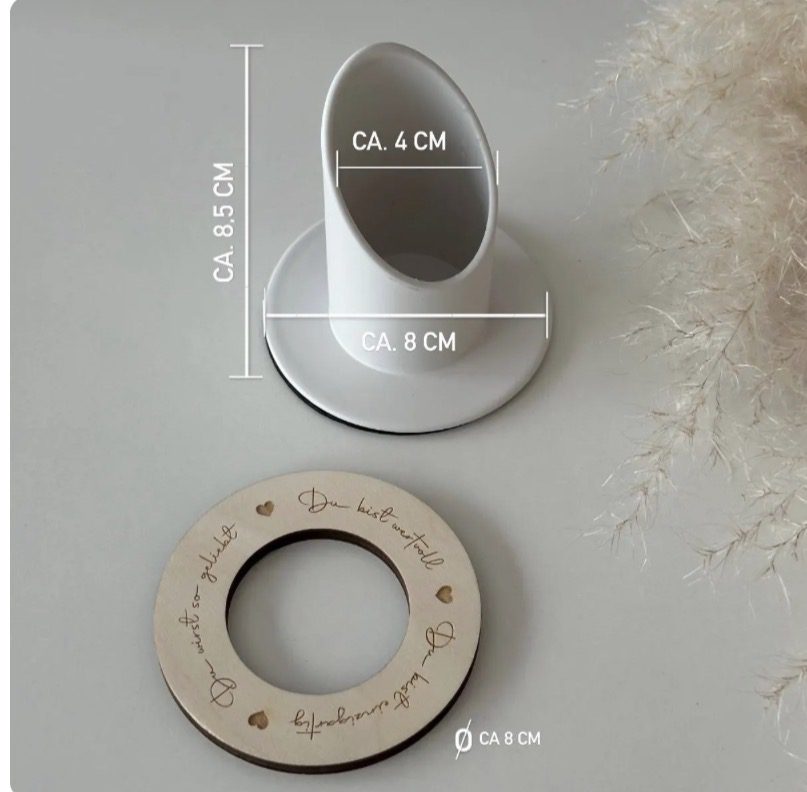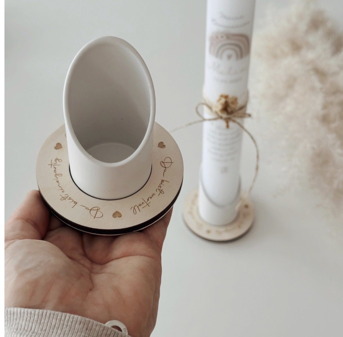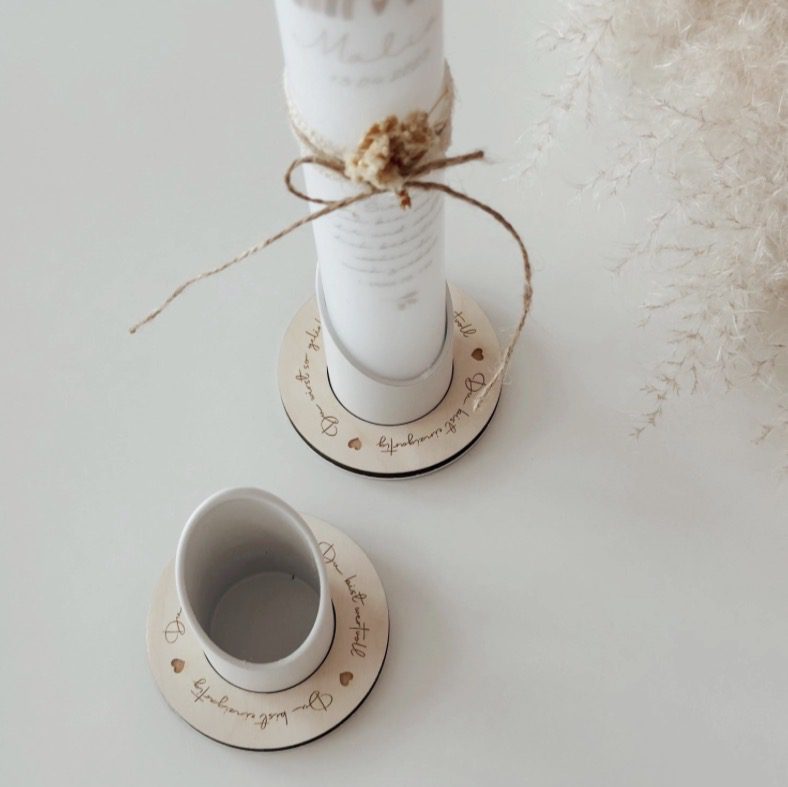 Unser wunderschöner Kerzenhalter in weiß aus Metall sorgt für den sicheren Stand der Kommunionkerze (Taufkerze etc.). Durch den liebevoll gravierten Holzring „du bist einzigartig“, „du bist wertvoll“, „du wirst so geliebt“ wird der Kerzenhalter zu etwas ganz Besonderem.