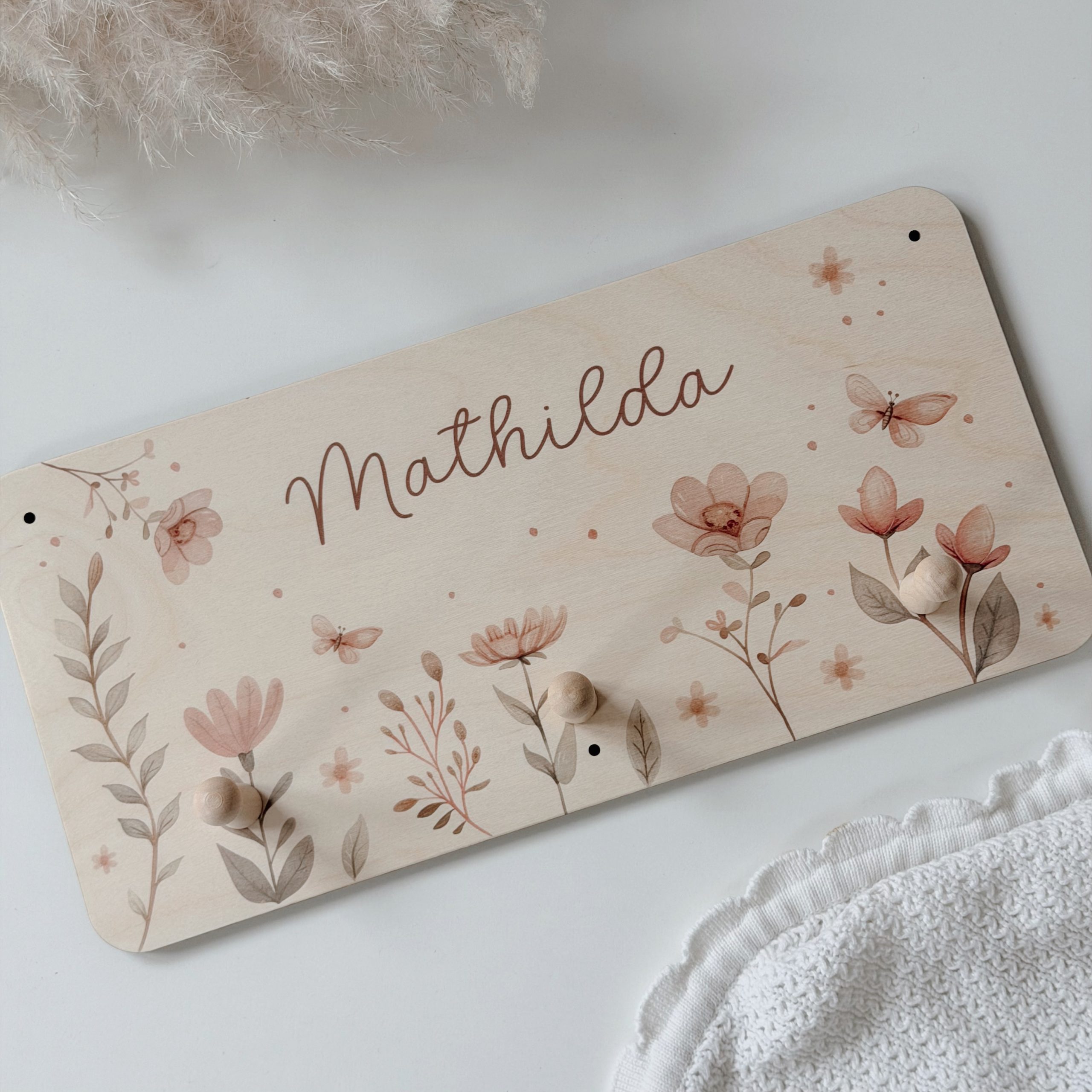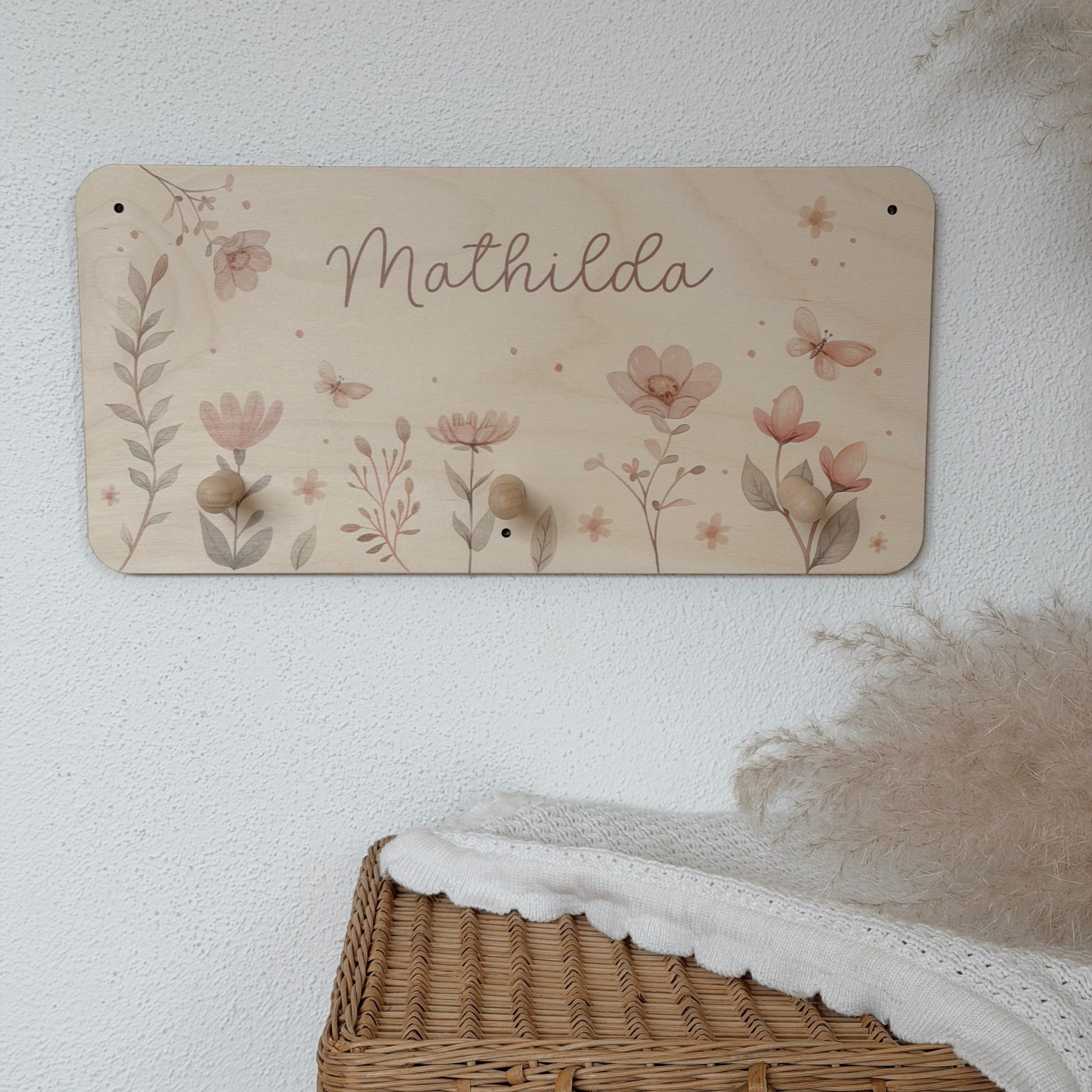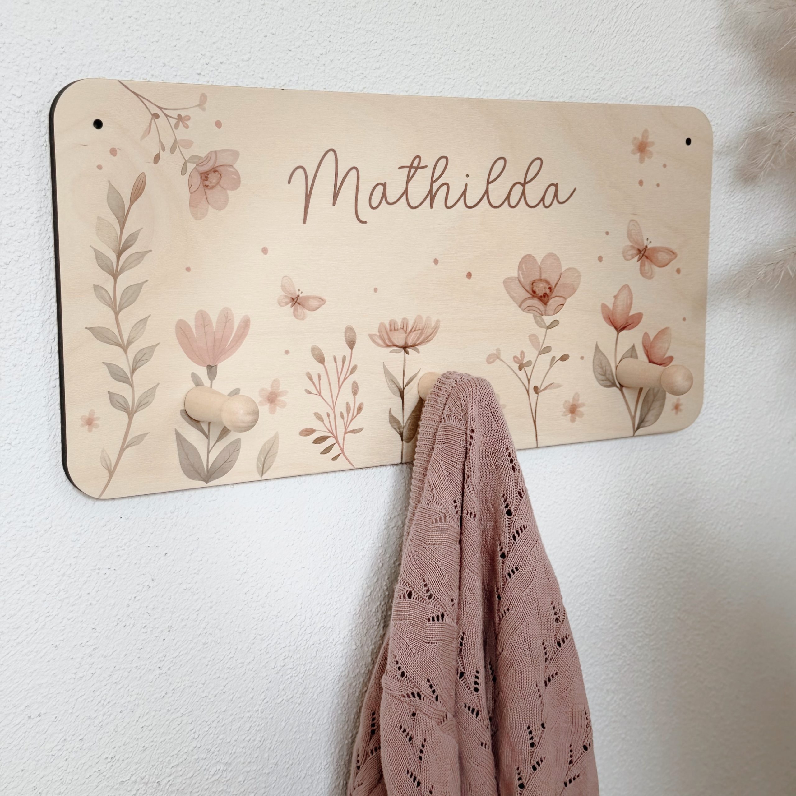 Unsere personalisierte Kindergarderobe – ein langlebiges Lieblingsstück – das Kinder über Jahre begleitet. Das florale Design in sanften Rosé- und Naturtönen fügt sich harmonisch in moderne Kinderzimmer ein – egal ob skandinavisch, verspielt oder zeitlos elegant eingerichtet. Die Kombination aus dem warmen Holz und den pastelligen Blumen in zartrosa, verleiht der Garderobe eine ruhige, warm kindliche und dennoch schlichte Ausstrahlung.