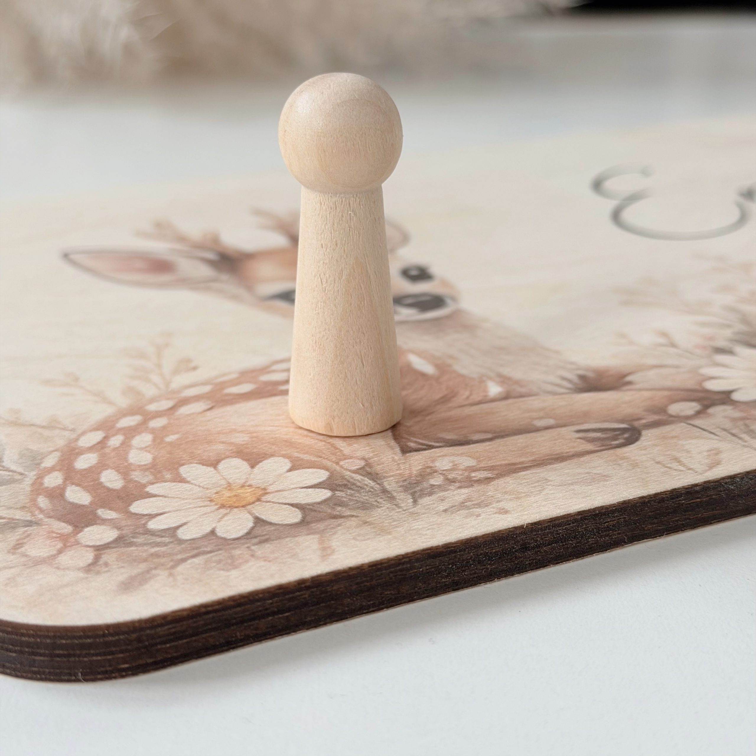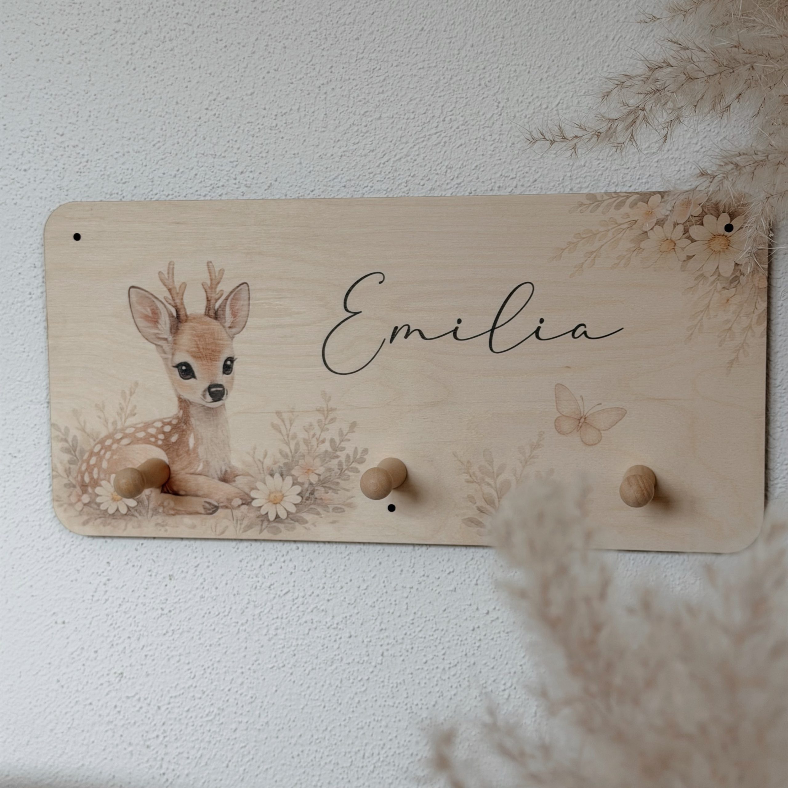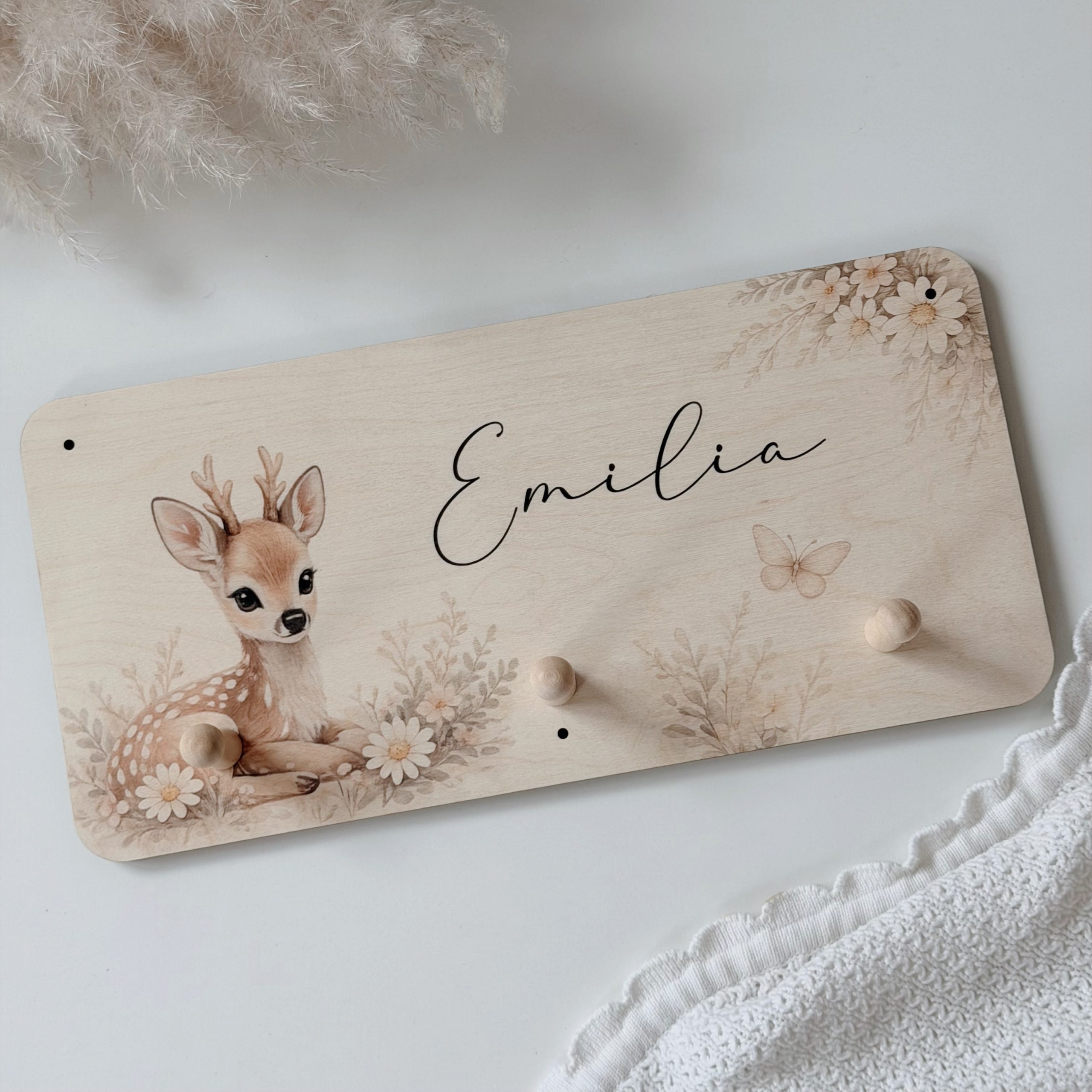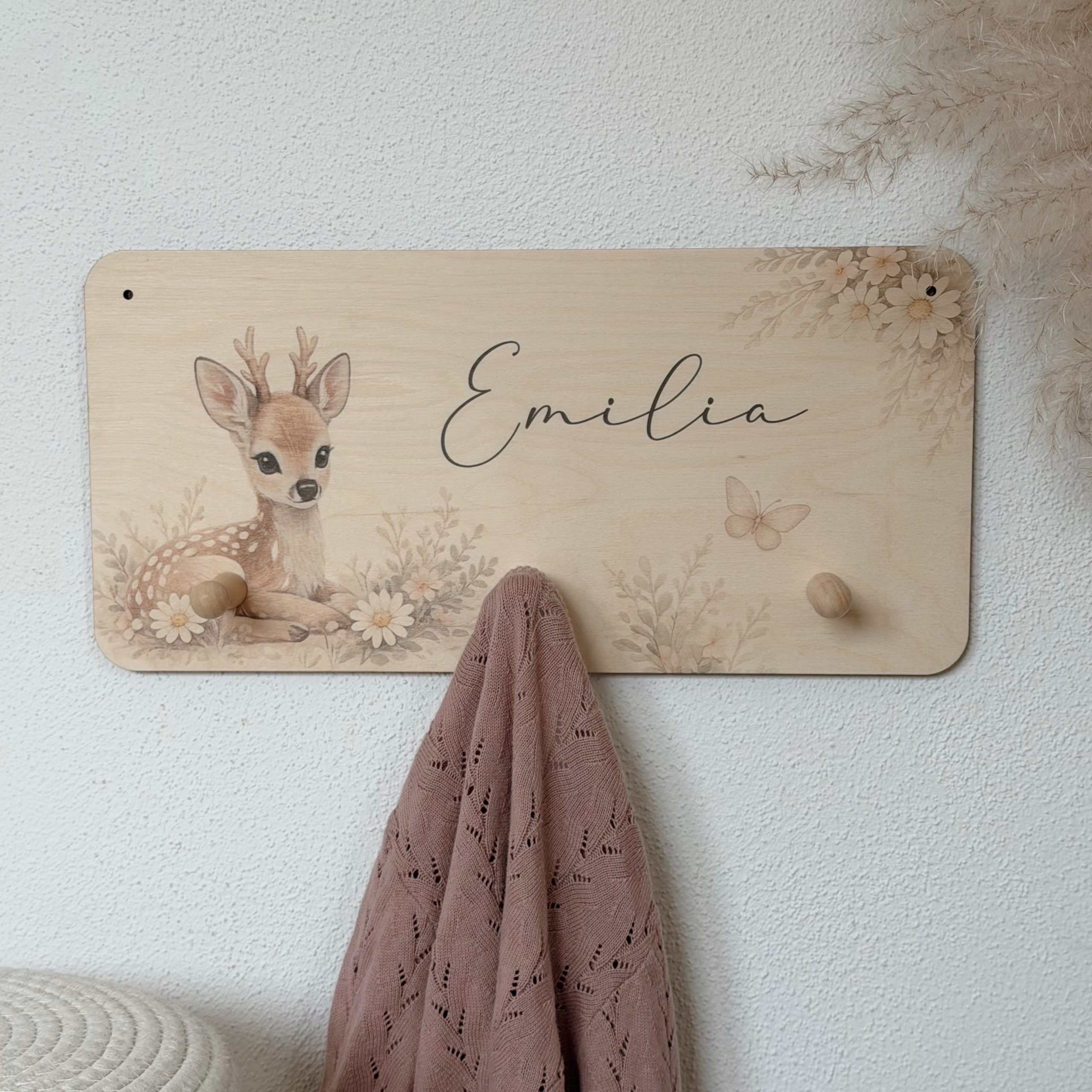 Unsere personalisierte Kindergarderobe – ein langlebiges Lieblingsstück – das Kinder über Jahre begleitet. Das florale Design in sanften Rosé- und Naturtönen fügt sich harmonisch in moderne Kinderzimmer ein – egal ob skandinavisch, verspielt oder zeitlos elegant eingerichtet. Die Kombination aus dem warmen Holz, dem süßen Reh und den sanften pastelligen Blumenmotiven, verleiht der Garderobe eine ruhige, warm kindliche und dennoch schlichte Ausstrahlung.