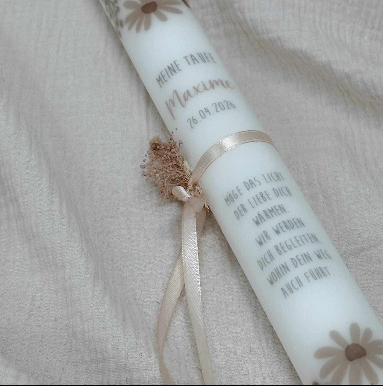Mit unserer Kerze „Blumenwiese“ hältst du ein ganz besonderes Stück in den Händen: einen handgefertigten Begleiter, der den Zauber dieses einmaligen Tages festhält. Die schmale Tauf- bzw. Kommunionkerze im Format 40x4cm mit gespiegeltem Blumenmotiv in wunderschönen pastelligen Farben wie z.B. altrosa, hellrosa, grün und senf und freiem Text/Taufspruch auf der Vorderseite. Das zarte rosa Satinband und die Trockenblümchen machen die Kerze zu etwas ganz Besonderem. Ein digitaler Kerzenentwurf wird vorab zur Ansicht/Freigabe gesendet.