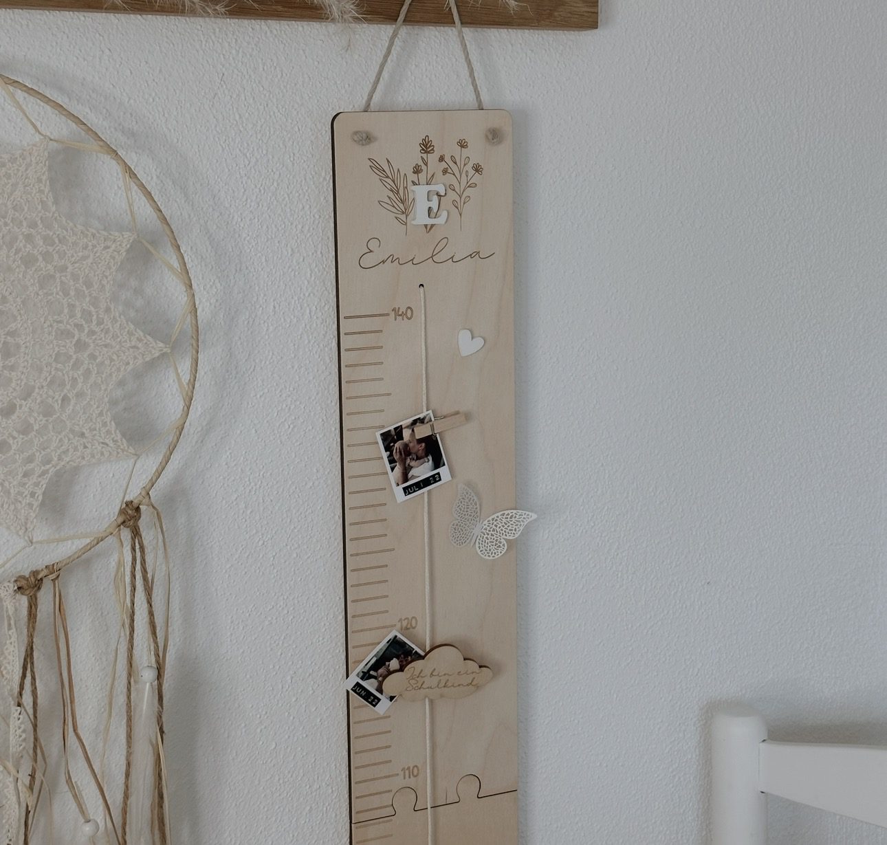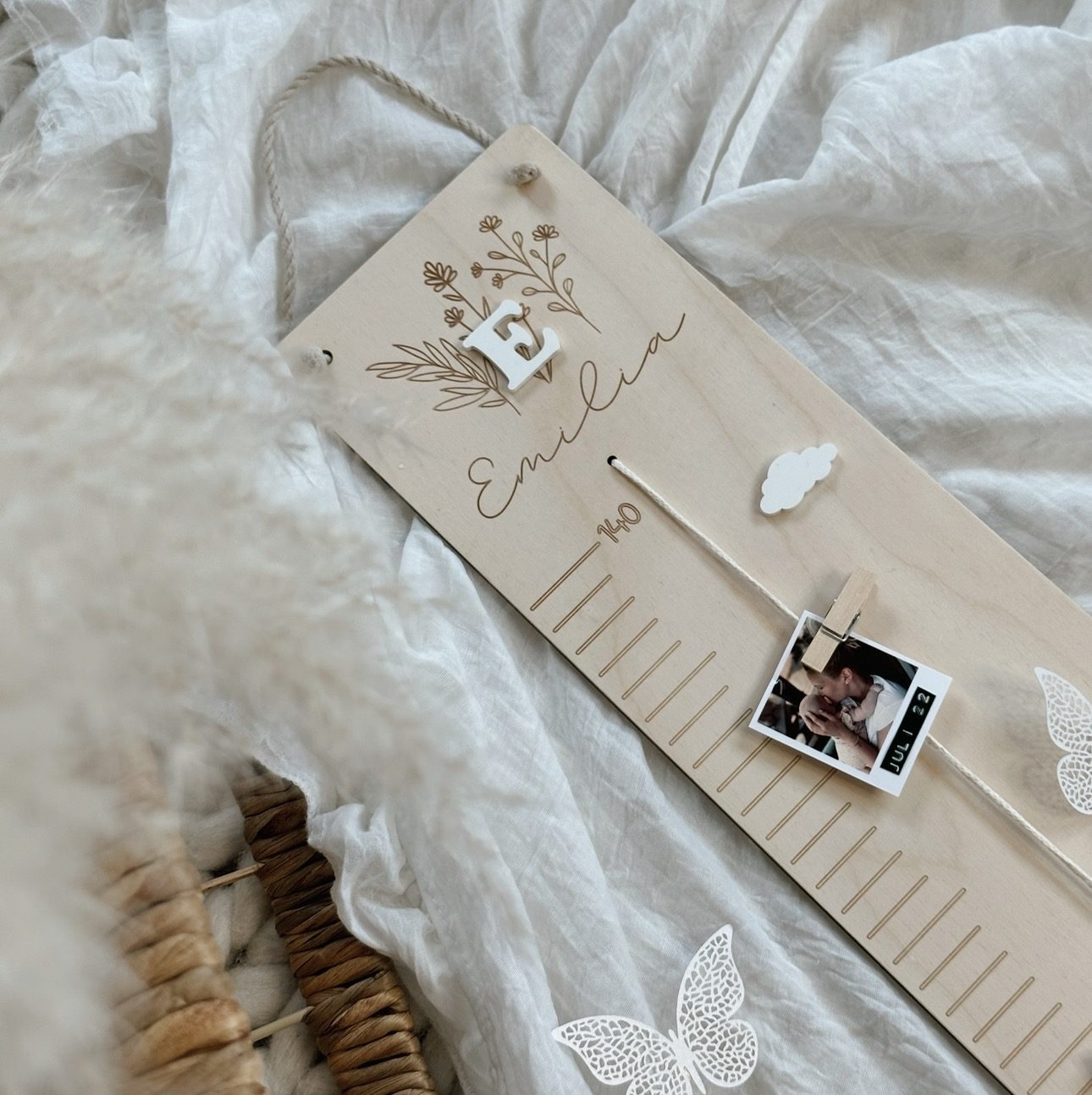 Das Basismodell besteht aus der Messlatte mit zart gravierten Blumen, dem personalisierten Namen sowie einem passenden Acrylbuchstaben. Zwei kleine Holzklämmerchen gehören ebenfalls dazu – perfekt, um Fotos, Erinnerungen oder kleine Botschaften und Fotos zu befestigen.