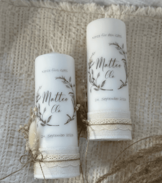 Die Kerze wird harmonisch passend zur Taufkerze gestaltet und greift das gewählte Motiv in ruhiger, stimmiger Weise auf – für ein rundes Gesamtbild an diesem bedeutungsvollen Tag. So entsteht ein bleibendes Erinnerungsstück, das den Paten auch über die Taufe hinaus begleitet.
