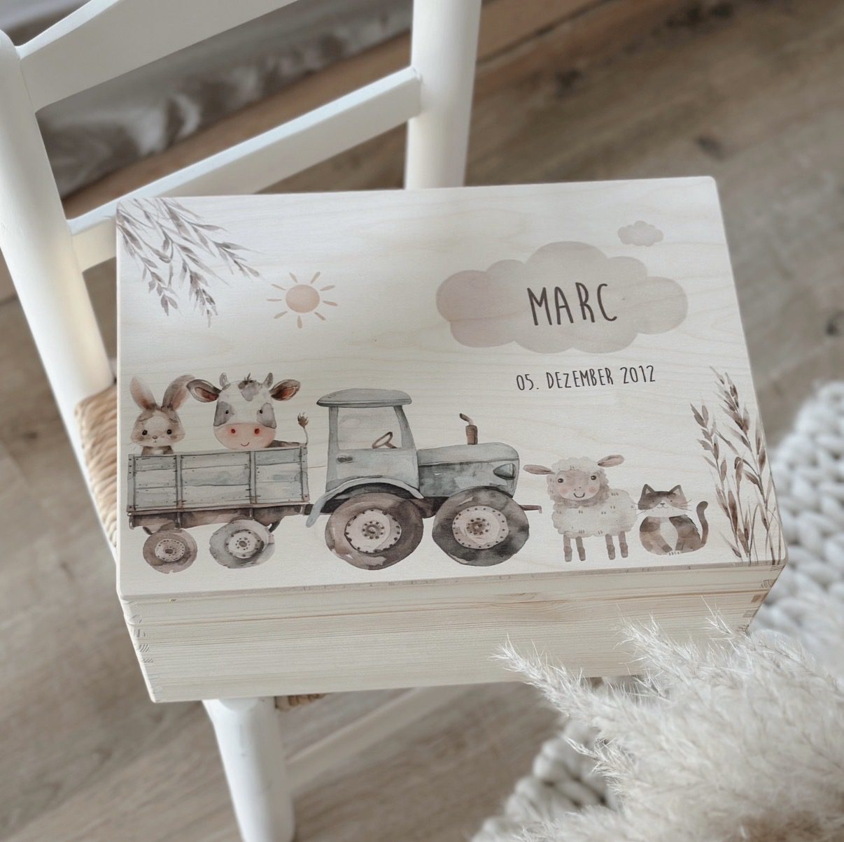 Die zarten Bauernhofmotive wie Traktor, Tier und Gräser machen die Erinnerungskiste zu einem echten Hingucker im Kinderzimmer.