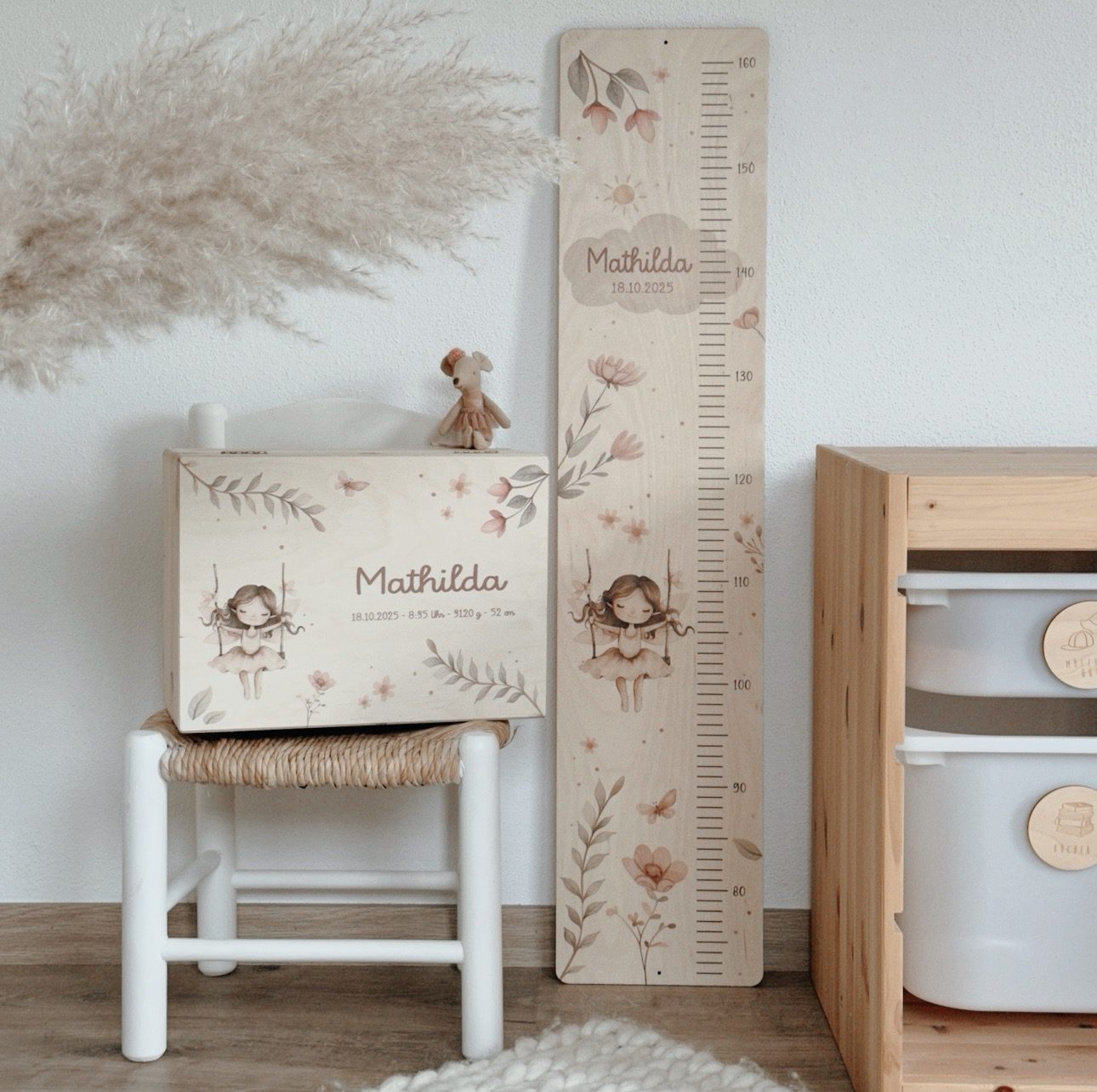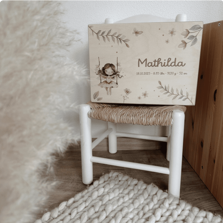 Die zarte Fee, kombiniert mit einem wunderschönen Blumenmotiv in rosafarbenen Aquarelltönen und feinen grünen Zweigen, verleiht der Box ihren ganz besonderen, märchenhaften Charme. Ein Design, das kleine Augen strahlen lässt und Eltern tief berührt.