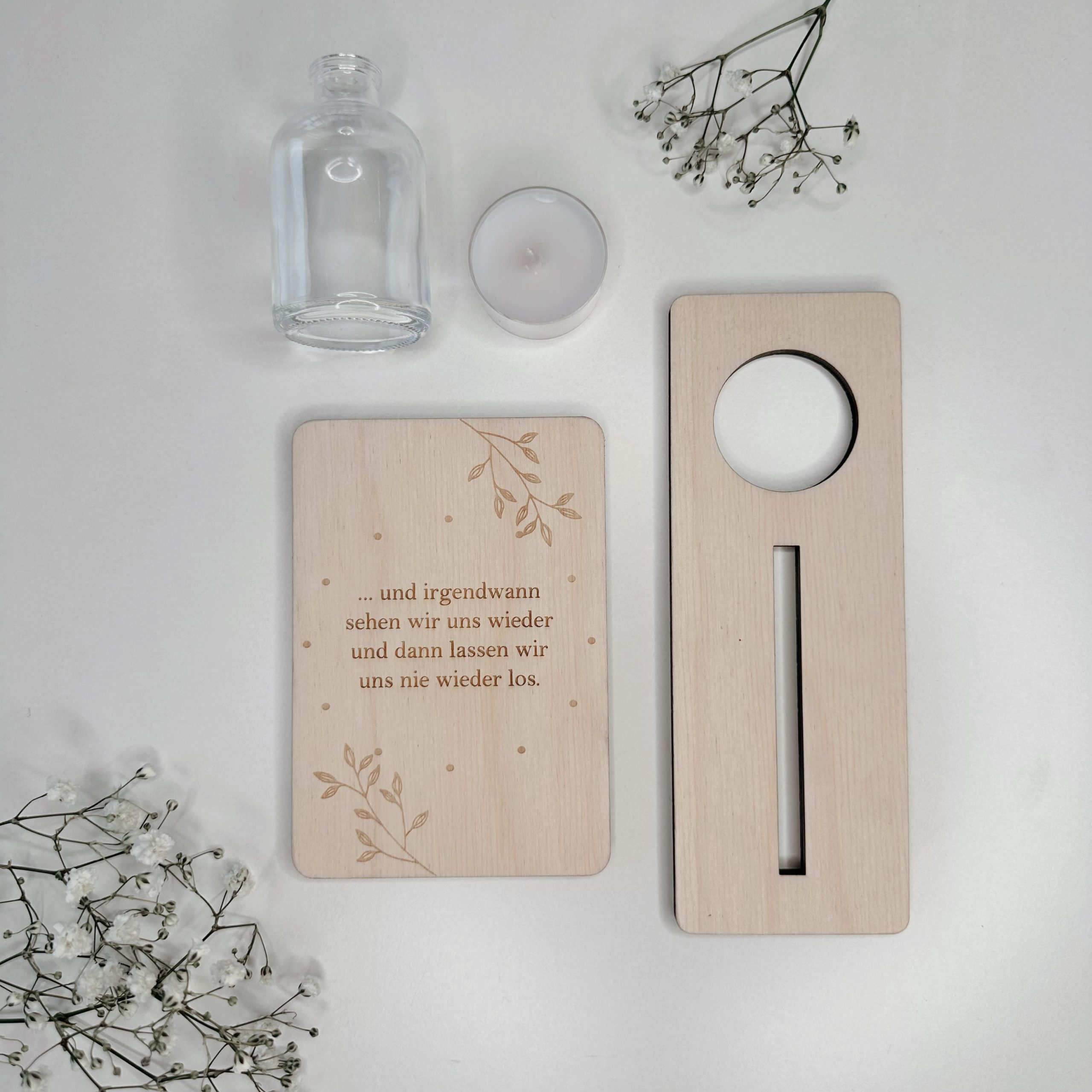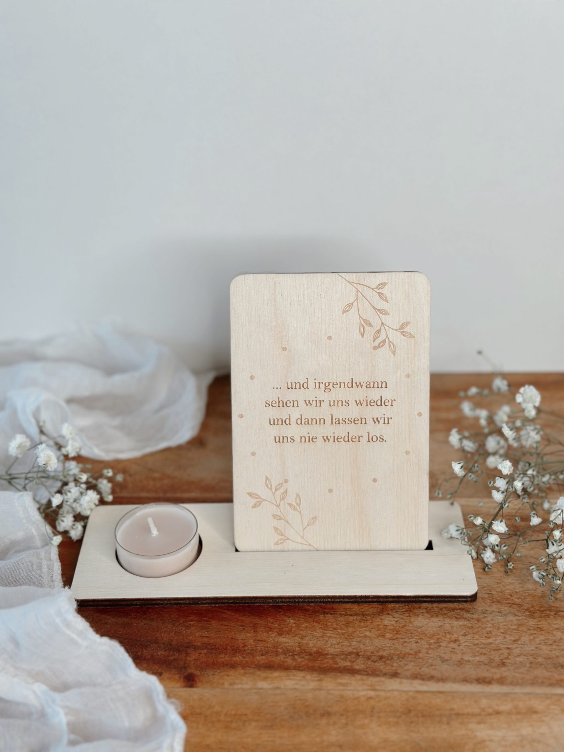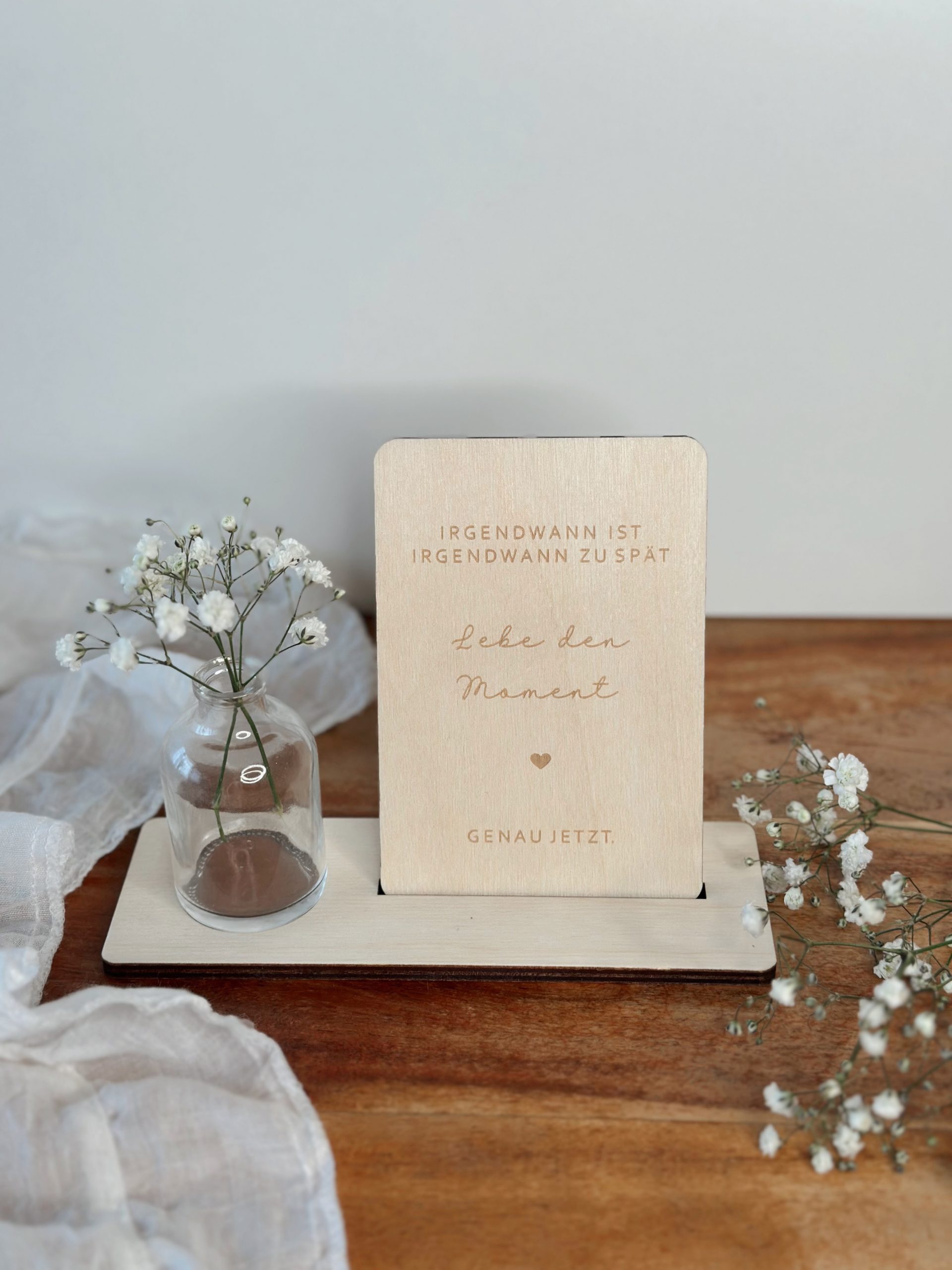 Gefertigt aus hochwertigem Naturholz und präzise graviert, wird sie mit einem passenden Aufsteller geliefert. Optional kannst du zwischen einer kleinen Vase für Trockenblumen oder einem Teelicht wählen – für noch mehr Wärme und Persönlichkeit.