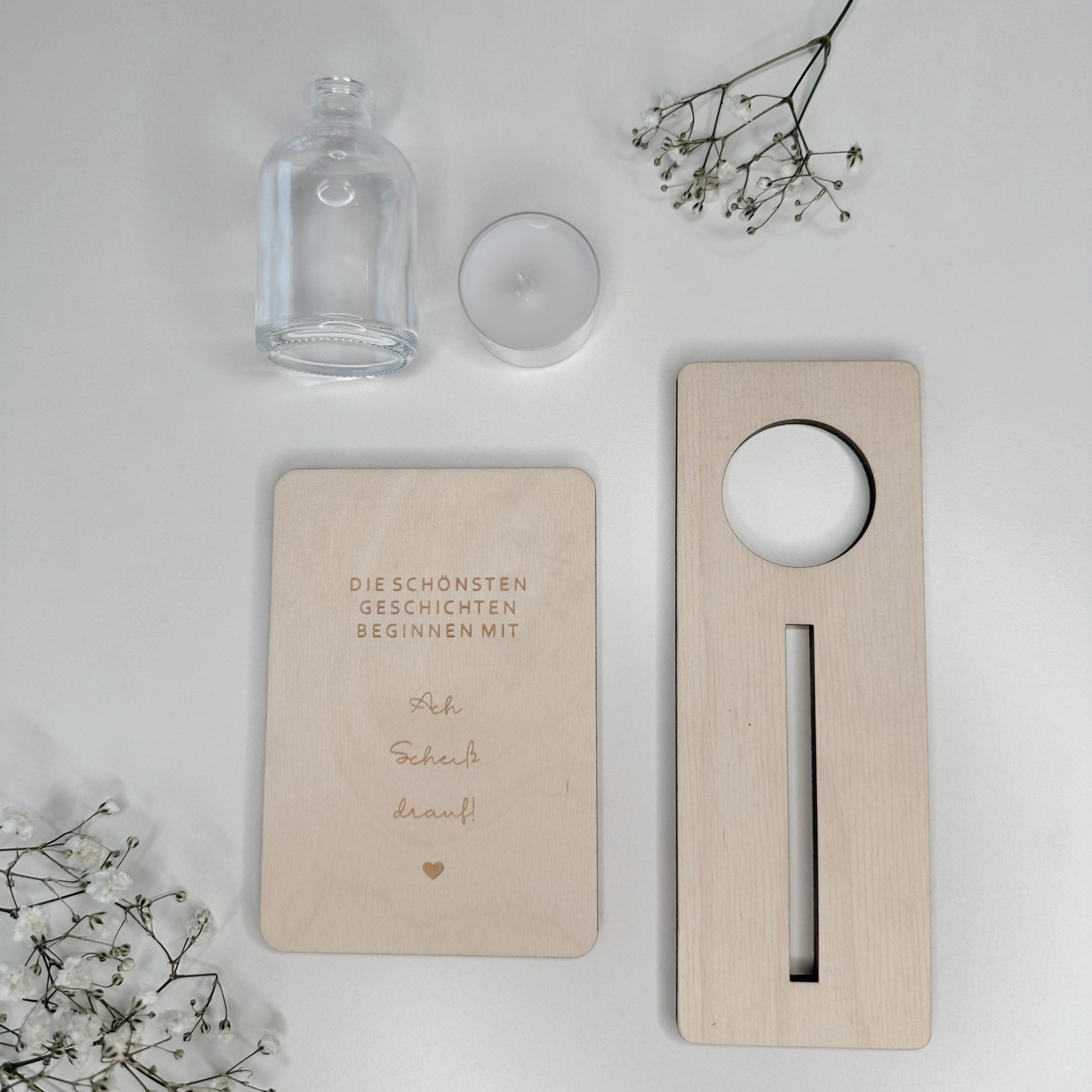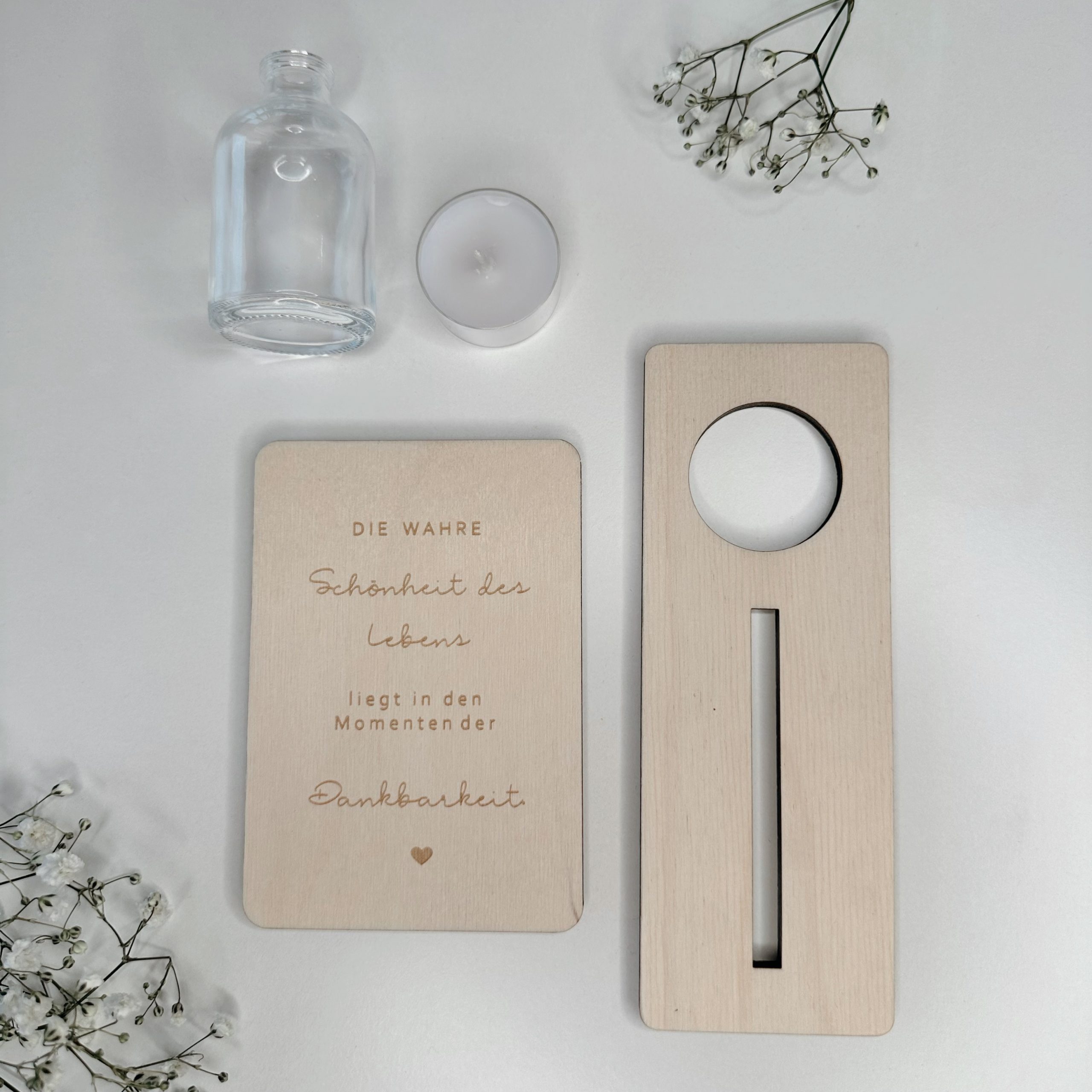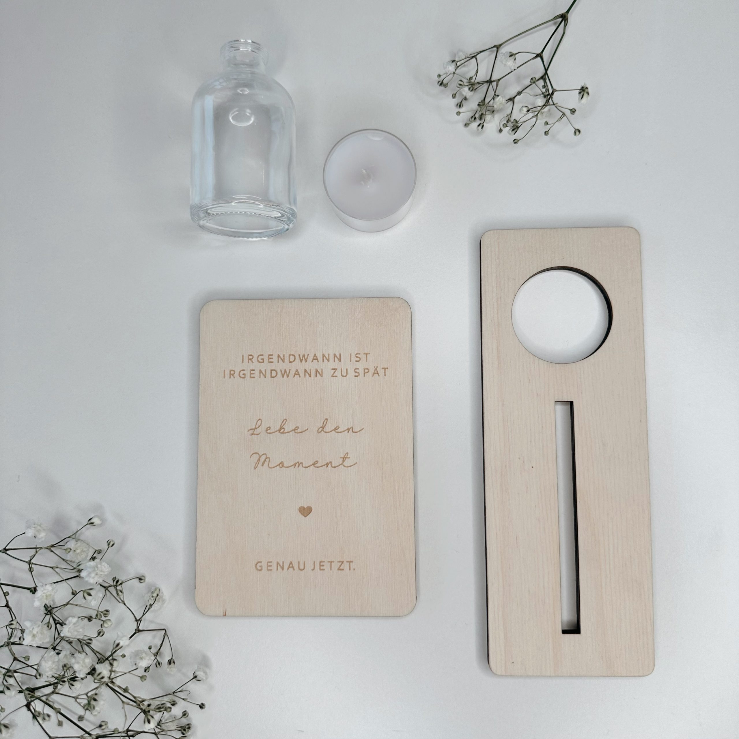 Gefertigt aus hochwertigem Naturholz und präzise graviert, wird sie mit einem passenden Aufsteller geliefert. Optional kannst du zwischen einer kleinen Vase für Trockenblumen oder einem Teelicht wählen – für noch mehr Wärme und Persönlichkeit.