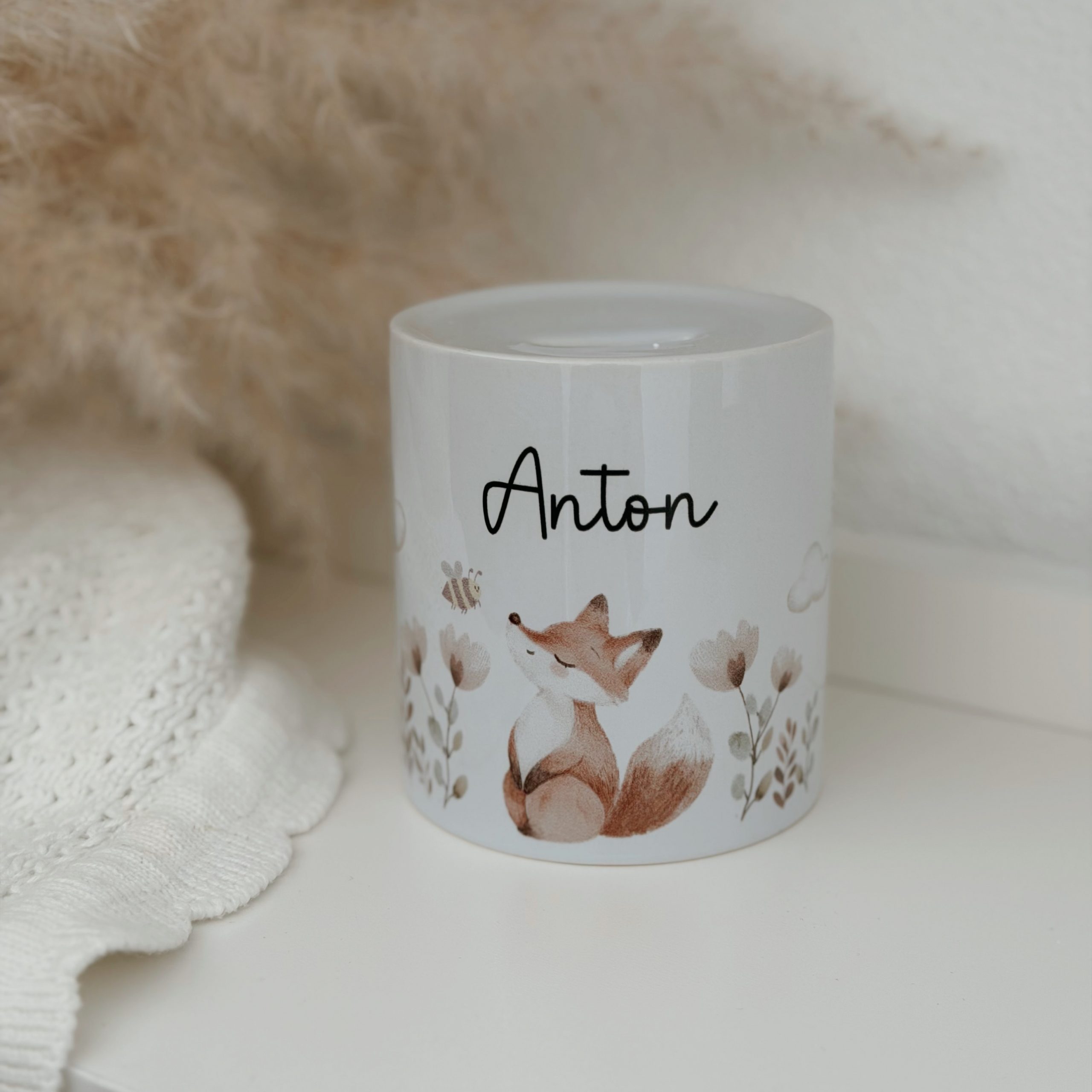 Die hochwertige Spardose überzeugt mit ihrem sanften, hellen Design und den zarten Aquarellillustrationen von Reh, Bär oder Fuchs. Umgeben von kleinen Blüten, Gräsern und Wolken entsteht eine ruhige, harmonische Kinderzimmer-Atmosphäre im natürlichen Boho-Stil. Der Name deines Kindes wird in moderner, klarer Schrift aufgebracht und macht jede Spardose zu einem ganz persönlichen Unikat.