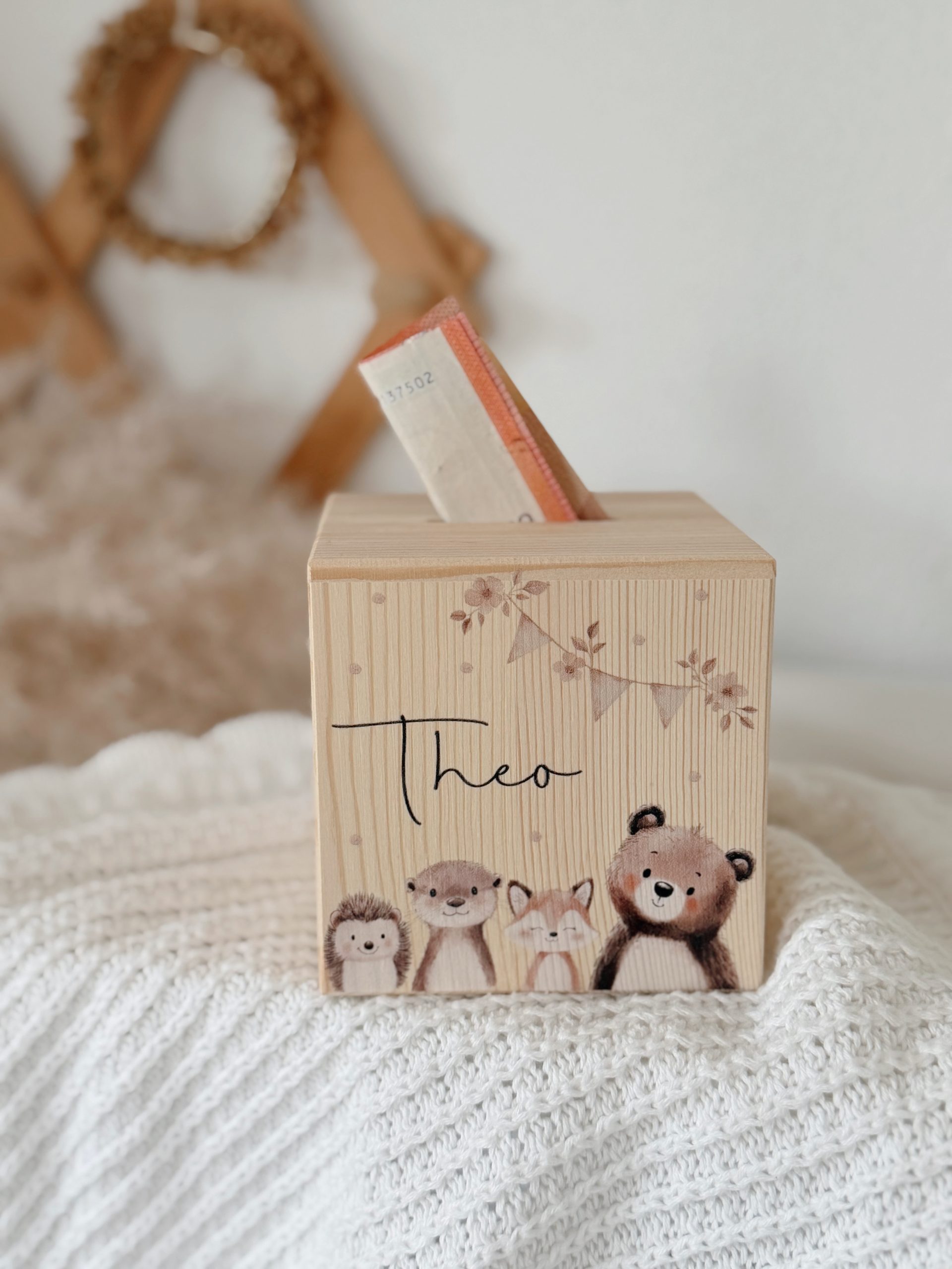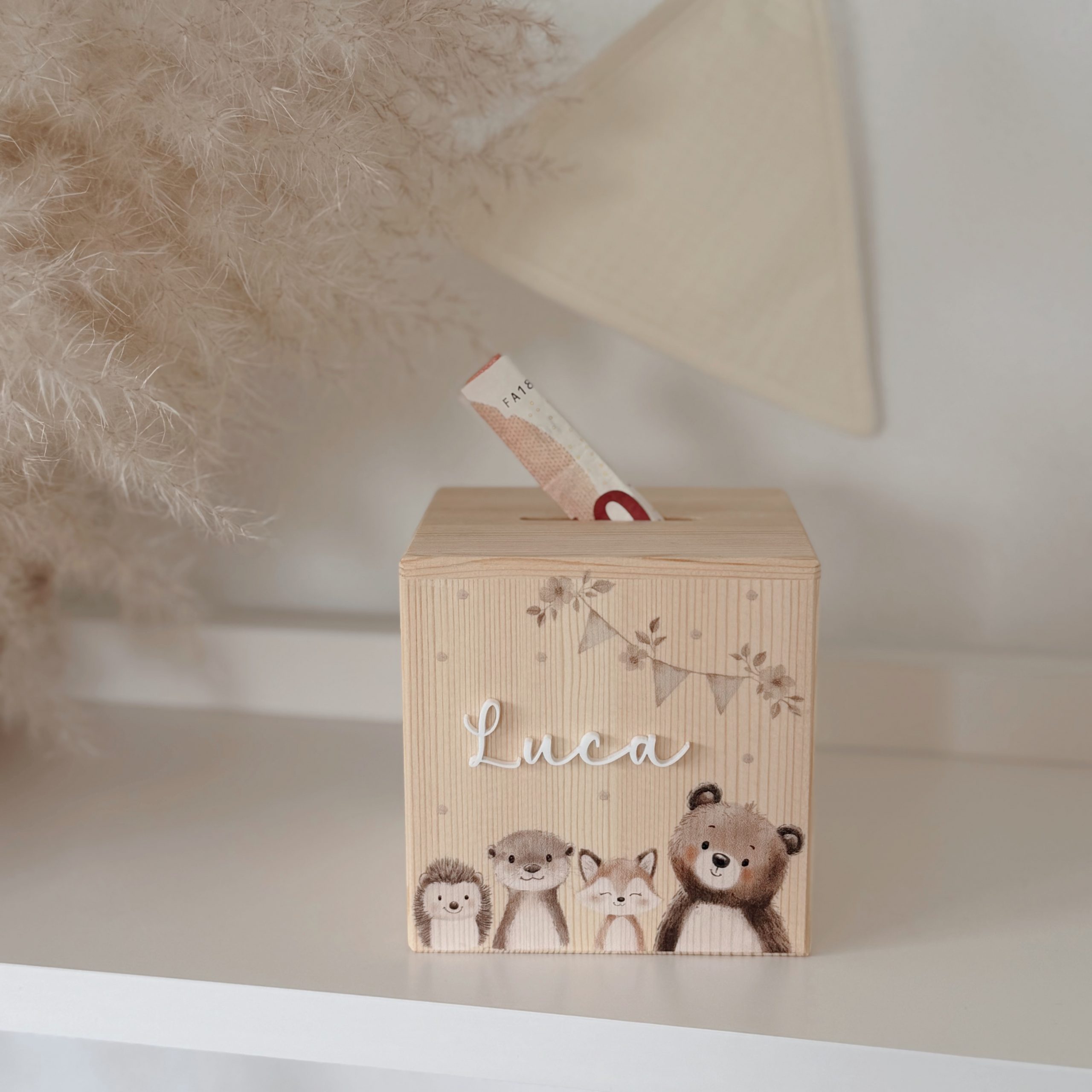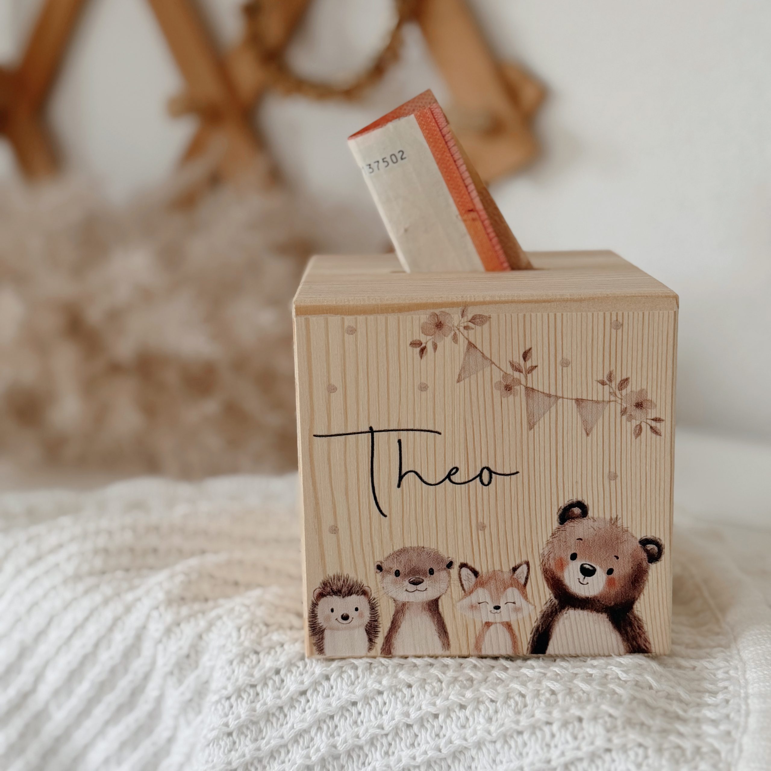 Unsere süße Spardose „Waldtiere“ aus naturbelassenem Kiefernholz ist das perfekte Geschenk zur Geburt, zur Taufe oder zum Kindergeburtstag.