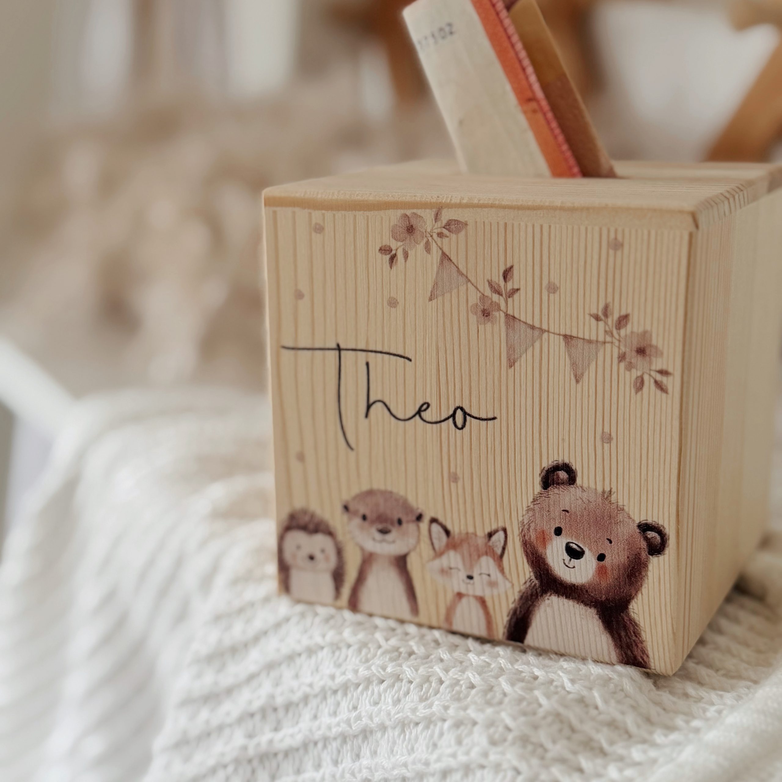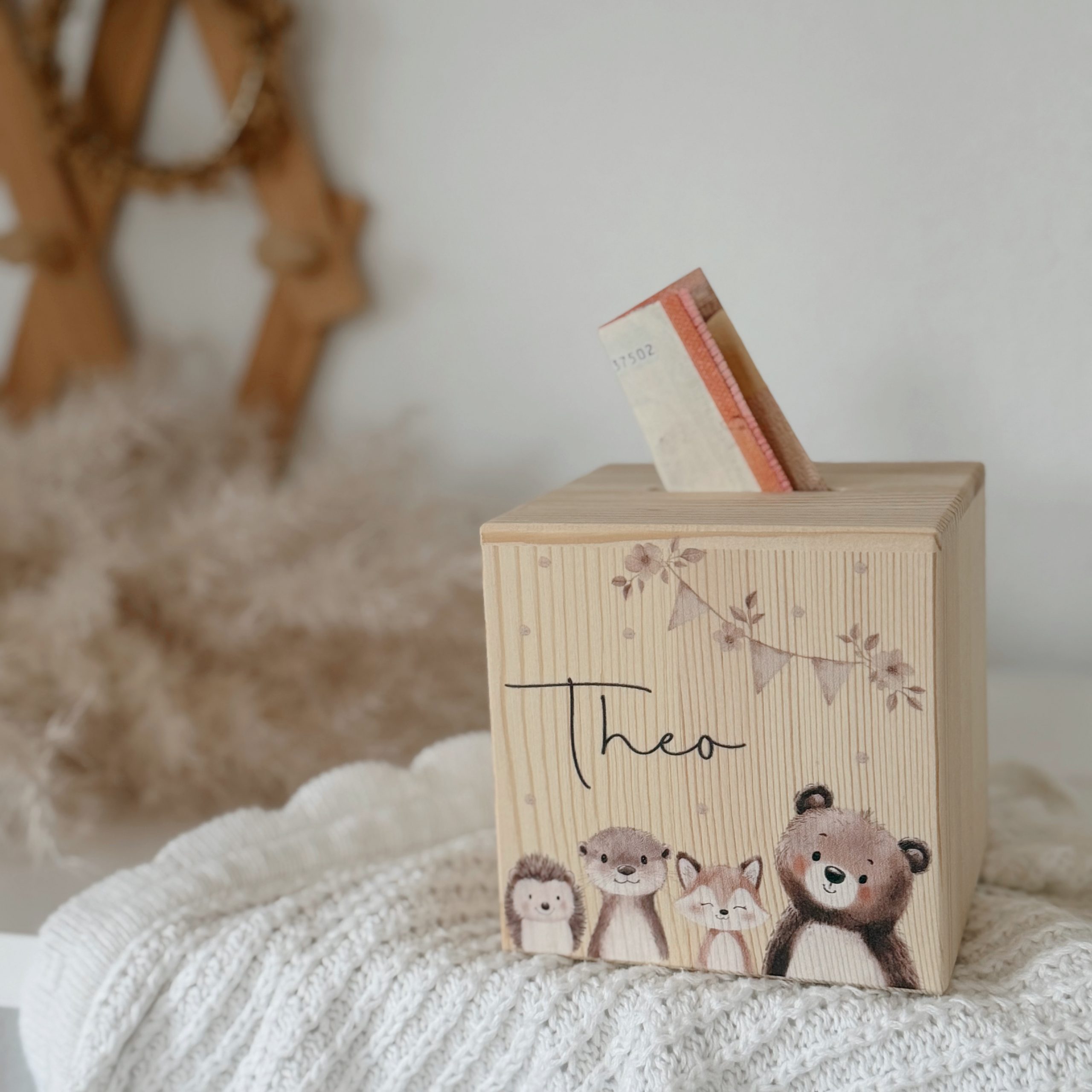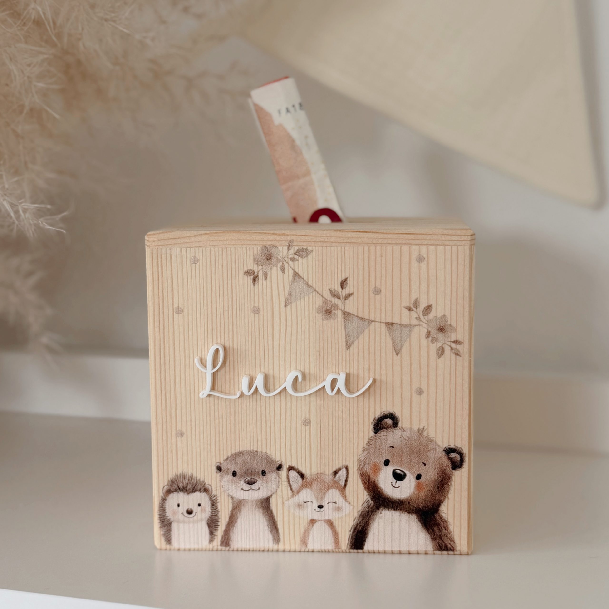 Unsere süße Spardose „Waldtiere“ aus naturbelassenem Kiefernholz ist das perfekte Geschenk zur Geburt, zur Taufe oder zum Kindergeburtstag.