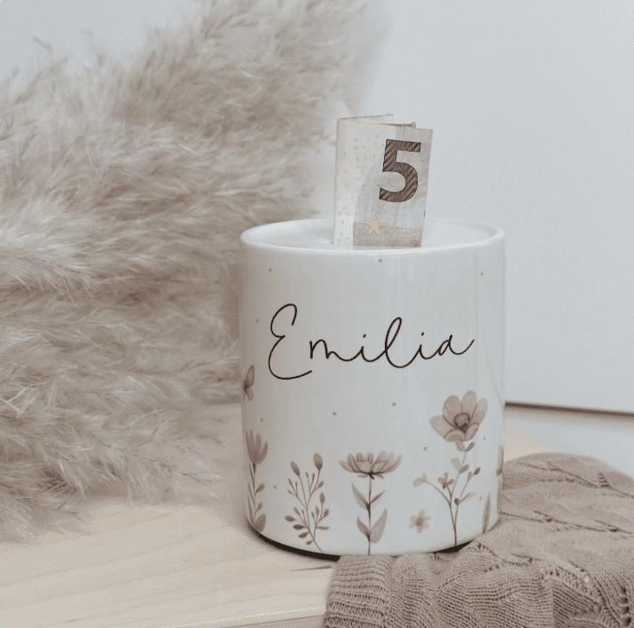 Unsere süße Spardose „Zauberwiese“ aus weißer Keramik ist das ideale Geschenk zur Geburt, Taufe oder zum Kindergeburtstag. Mit ihren rosa Blüten, zarten Blumen und der Möglichkeit zur Personalisierung wird sie im Kinderzimmer zu einem bezaubernden Blickfang.