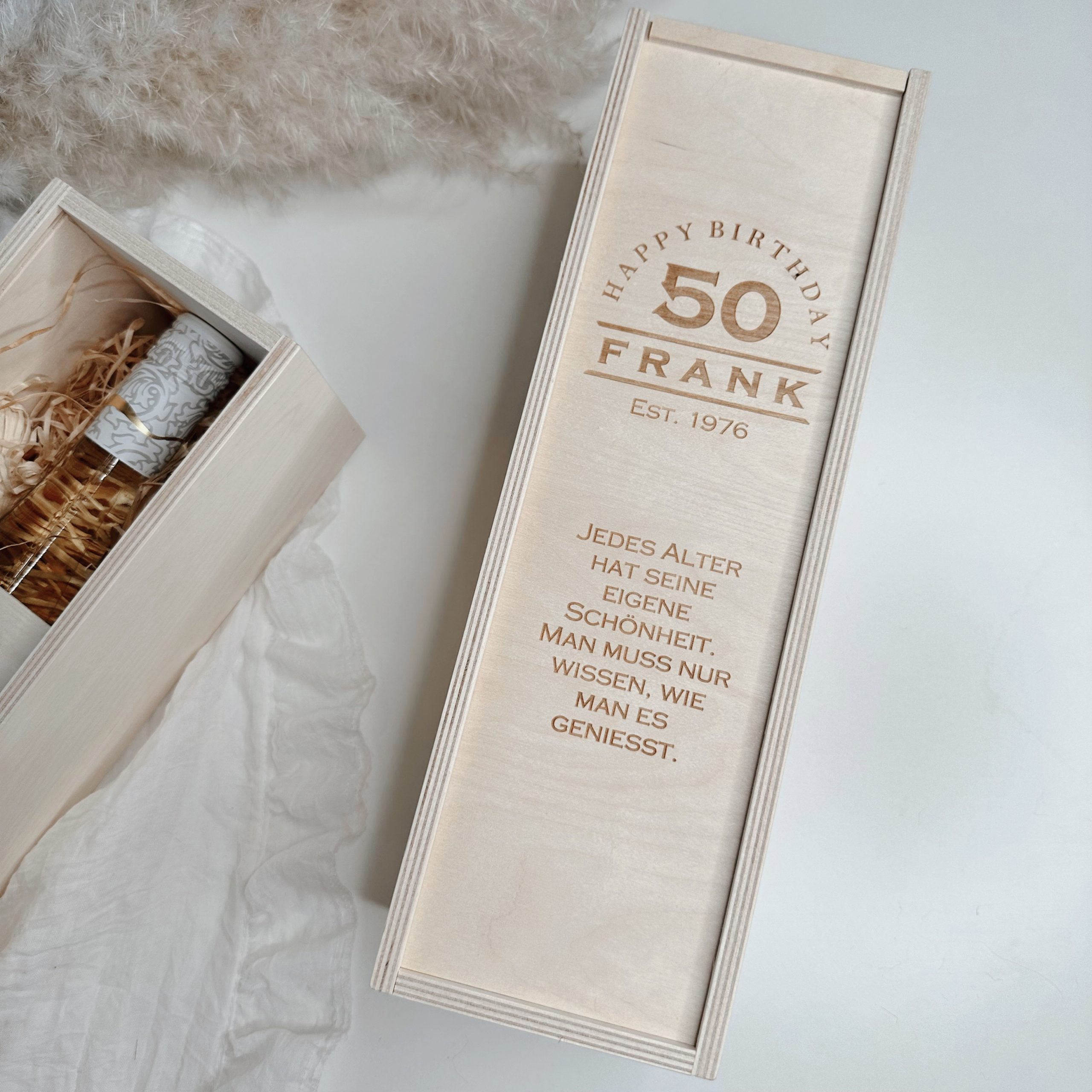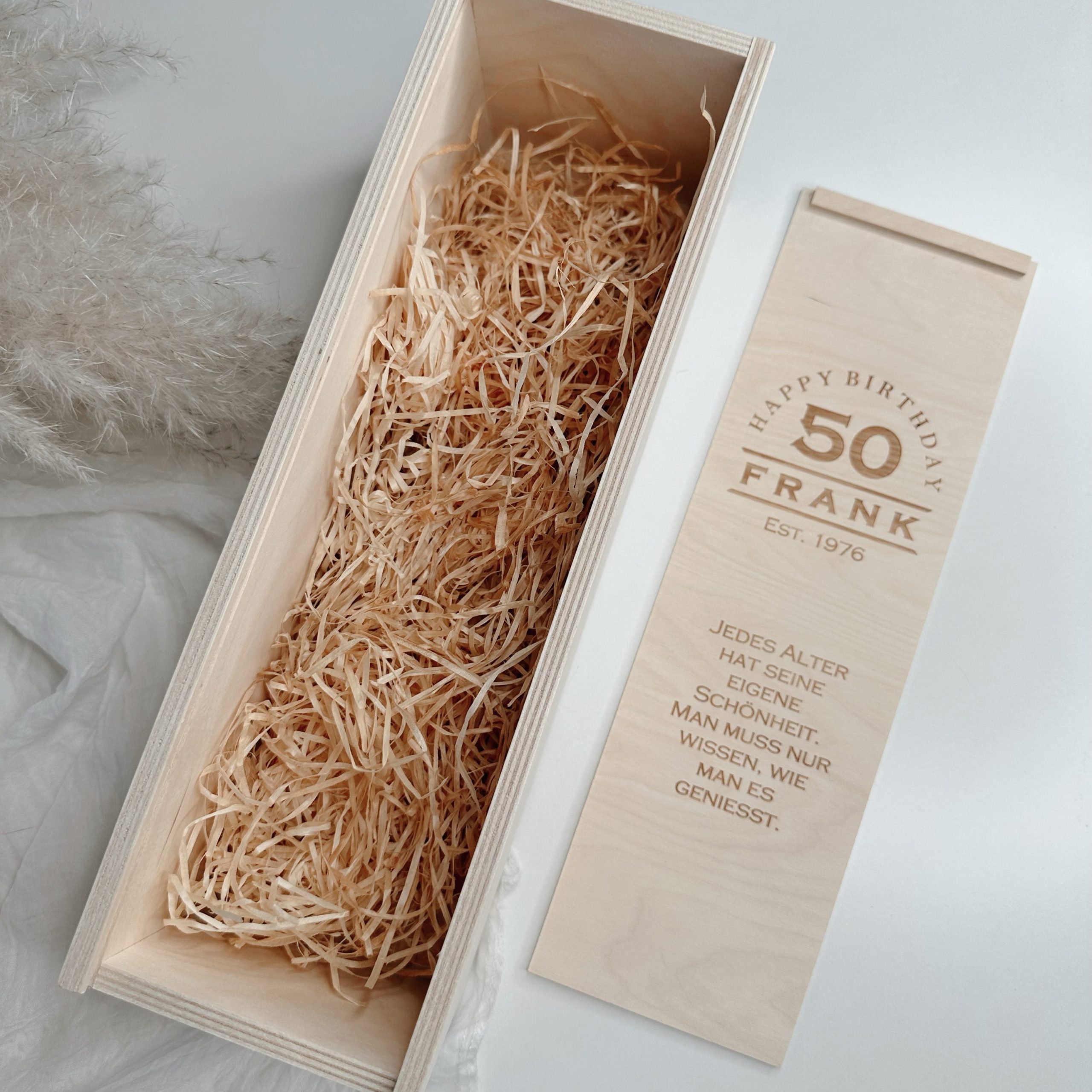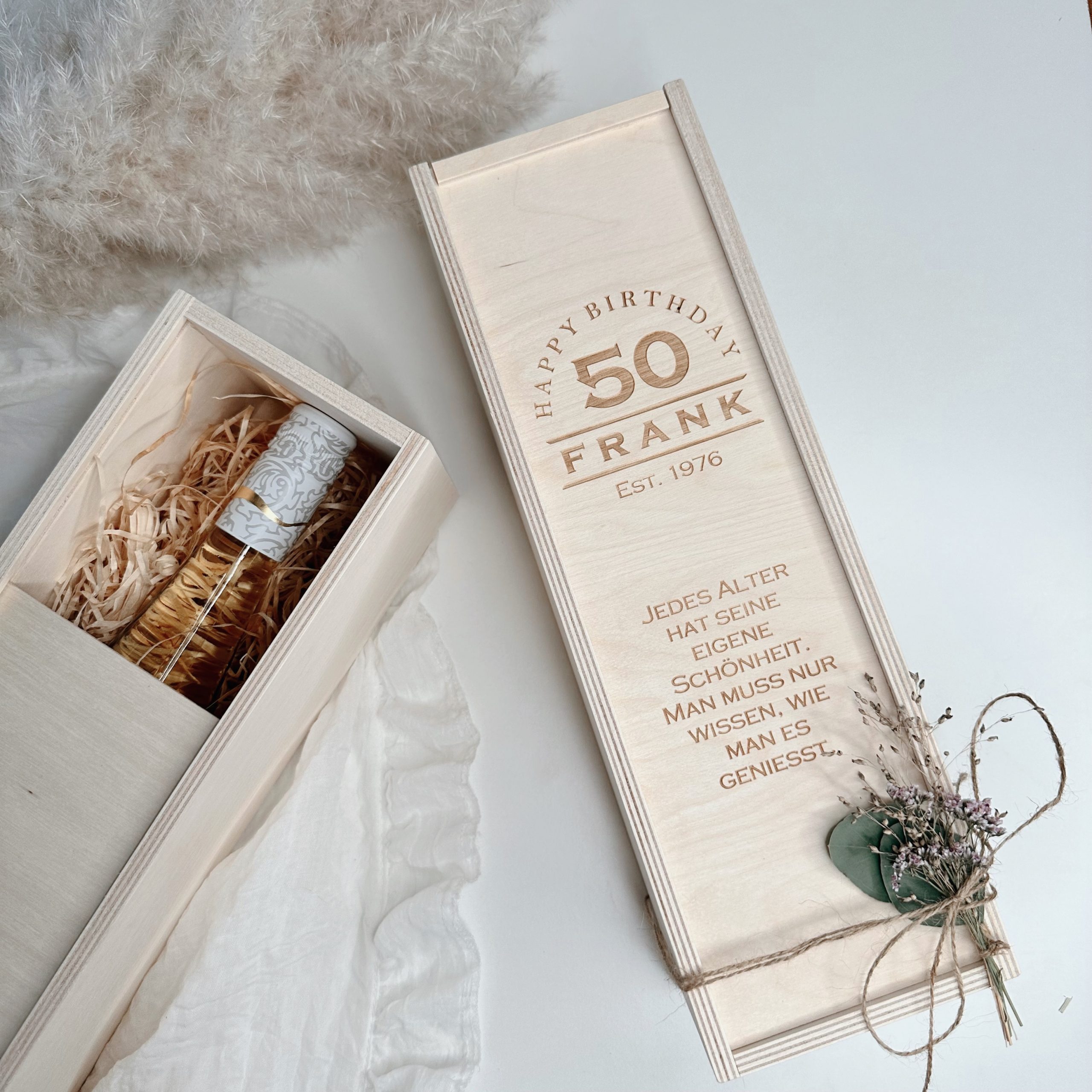 Du suchst ein besonderes Geschenk mit persönlicher Note? Unsere gravierte Weinkiste aus hochwertigem Holz verwandelt jede Flasche Wein in ein unvergessliches Highlight. Eine liebevolle und persönliche Idee, die garantiert Freude bereitet.