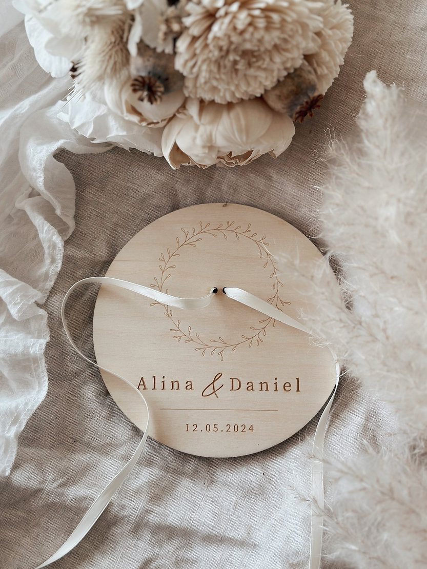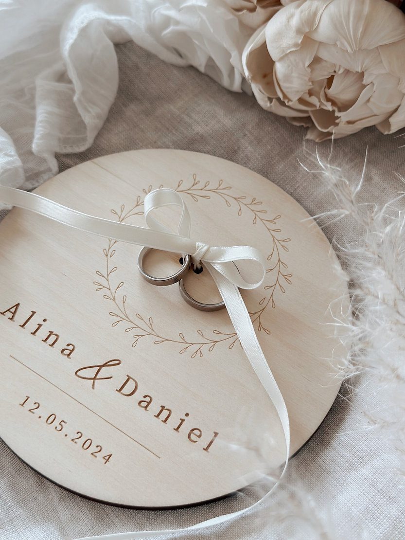 Lieferumfang: gravierter Holzuntersetzer mit Satinband in creme. Ringe sind nicht im Produkt enthalten.
