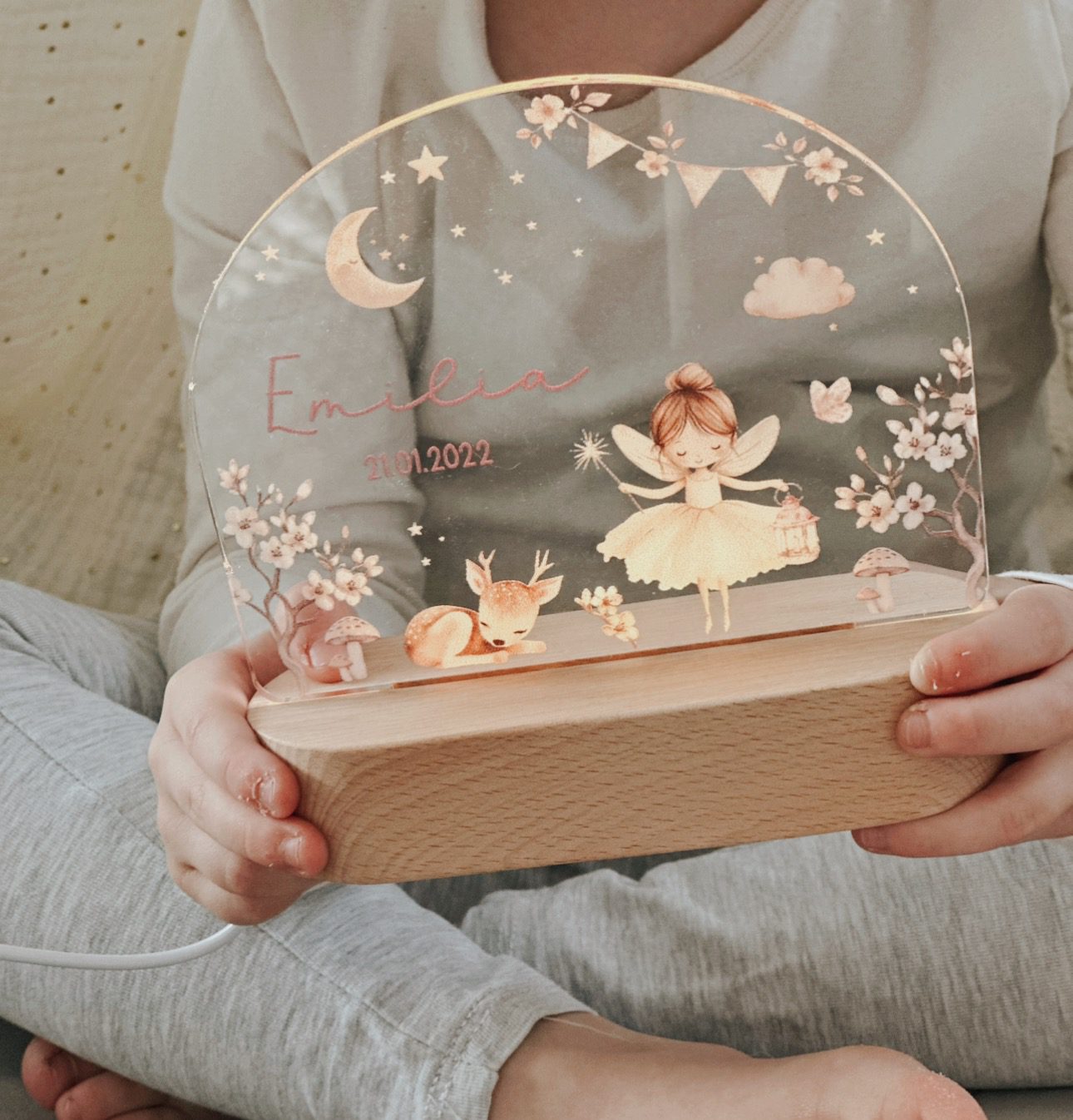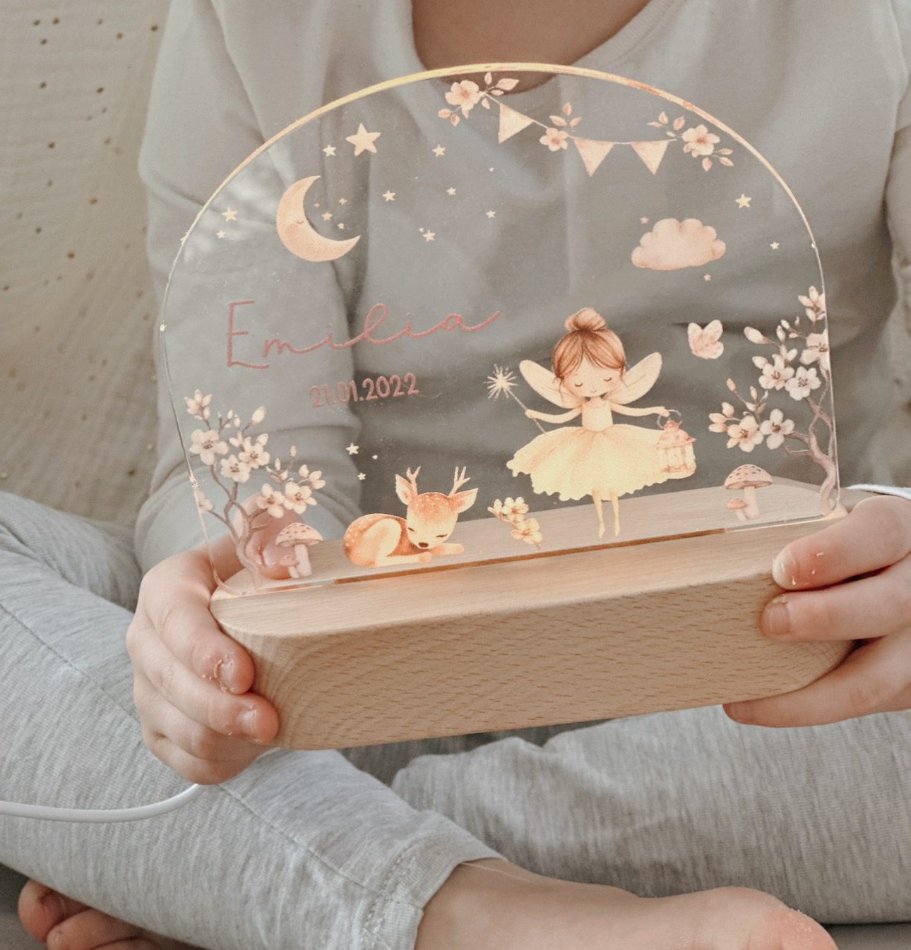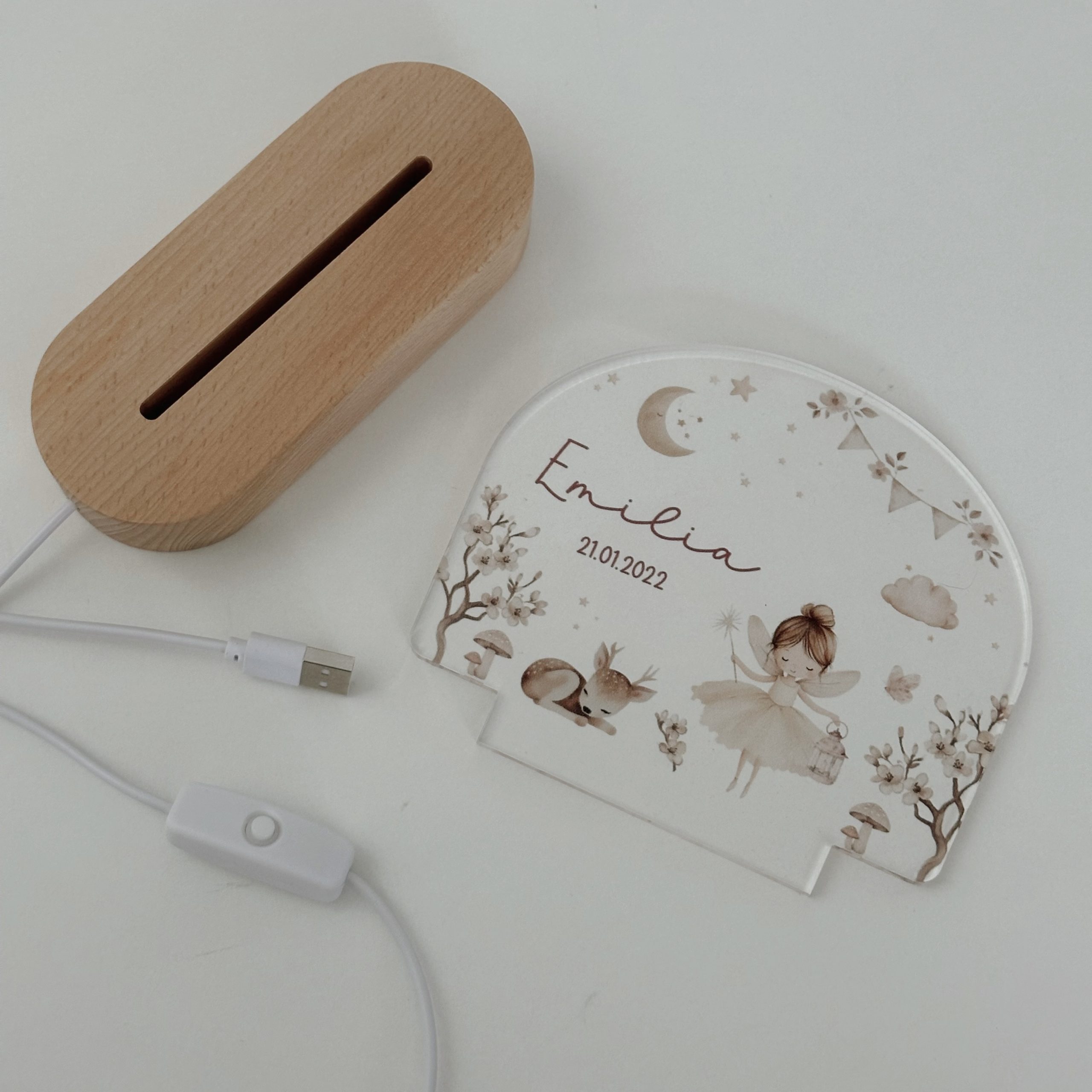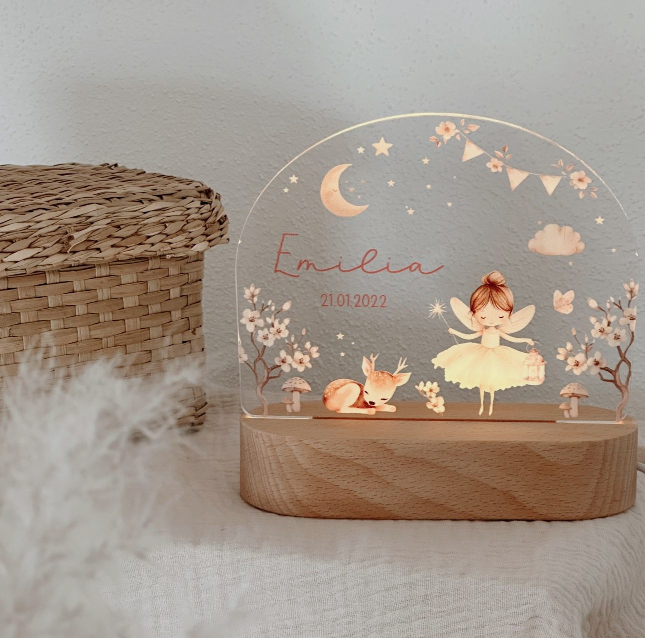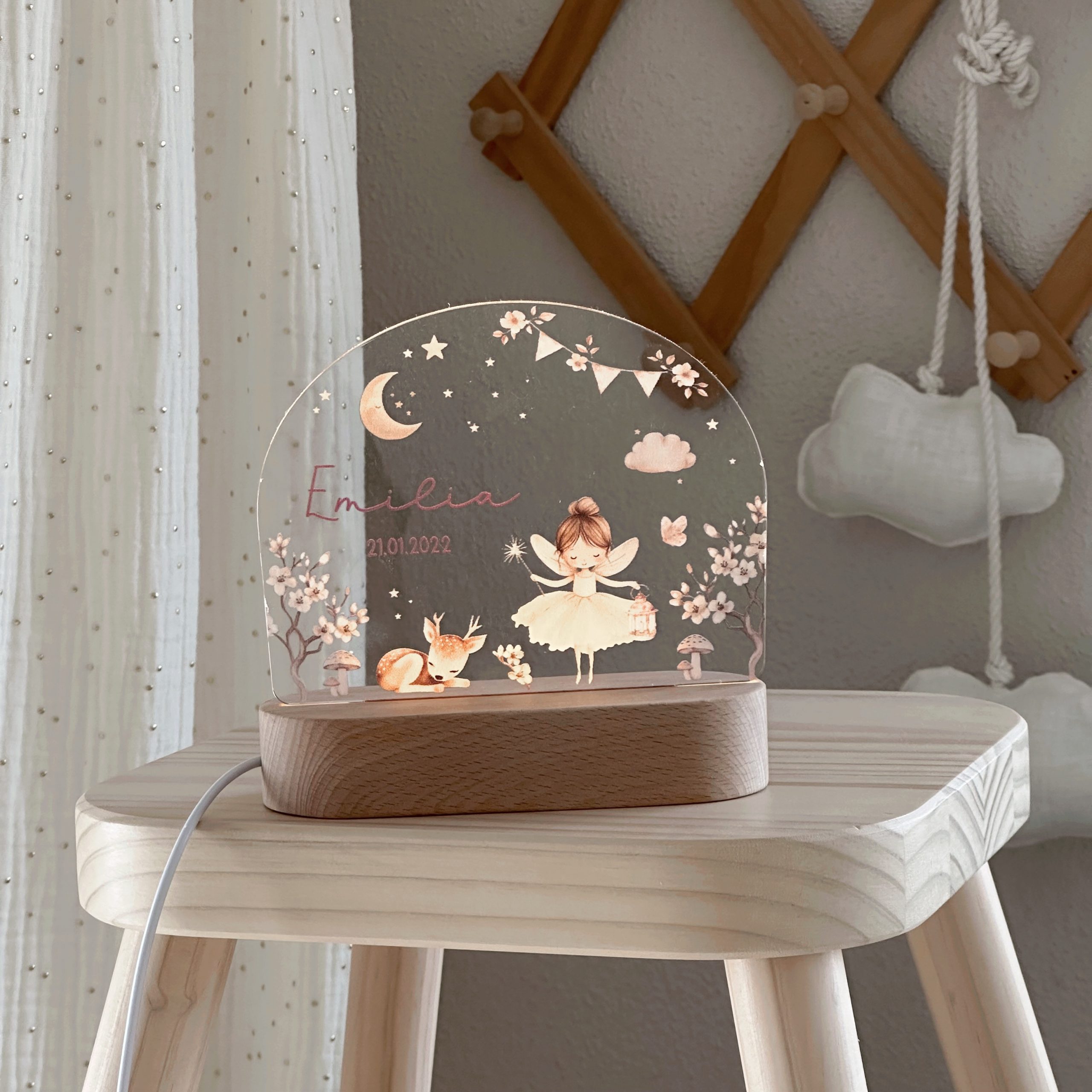 Die Nachtleuchte wird mit dem Wunschnamen und Geburtsdatum personalisiert und wird so zu einem ganz besonderen Lieblingsstück im Kinderzimmer. Ebenfalls ist es ein besonderes Herzensgeschenk zur Geburt, Taufe, zum Geburtstag oder ein liebevolles Geschenk für das eigene Kind.