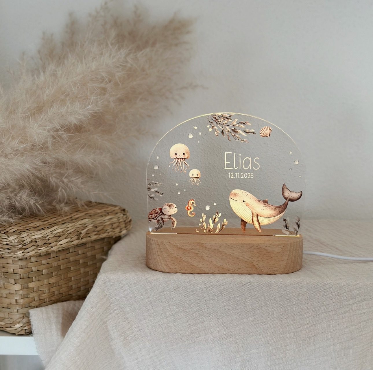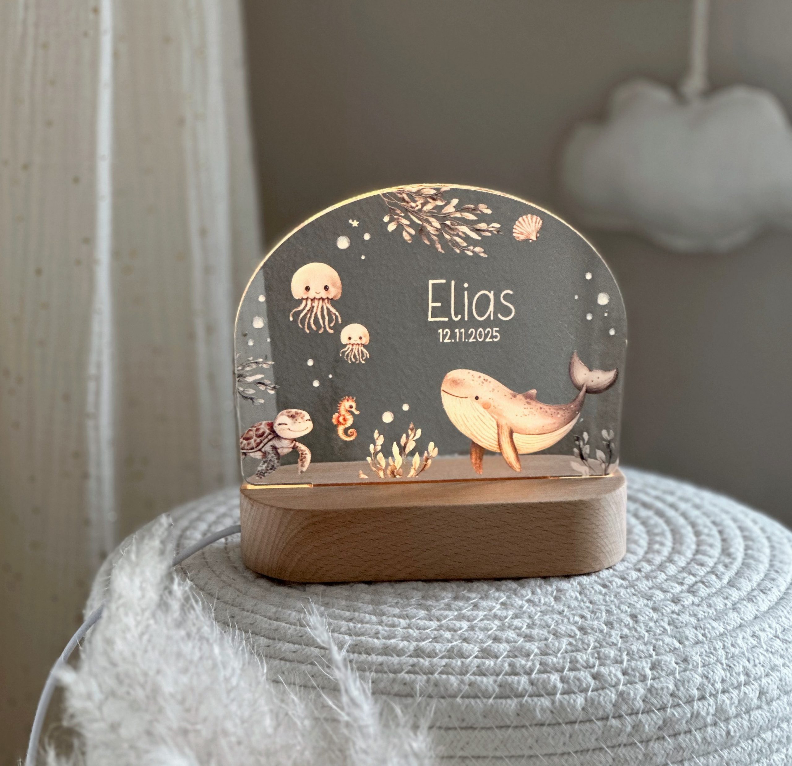Die Nachtleuchte wird mit dem Wunschnamen und Geburtsdatum personalisiert und wird so zu einem ganz besonderen Lieblingsstück im Kinderzimmer. Ob Wal, Seepferdchen oder Schildkröte – das zeitlose Unterwasserwelt-Design passt wunderbar zu Jungen und Mädchen und fügt sich harmonisch in jedes Kinderzimmer ein. Ebenfalls ein besonderes Herzensgeschenk zur Geburt, Taufe, zum Geburtstag oder als liebevolles Geschenk für das eigene Kind.