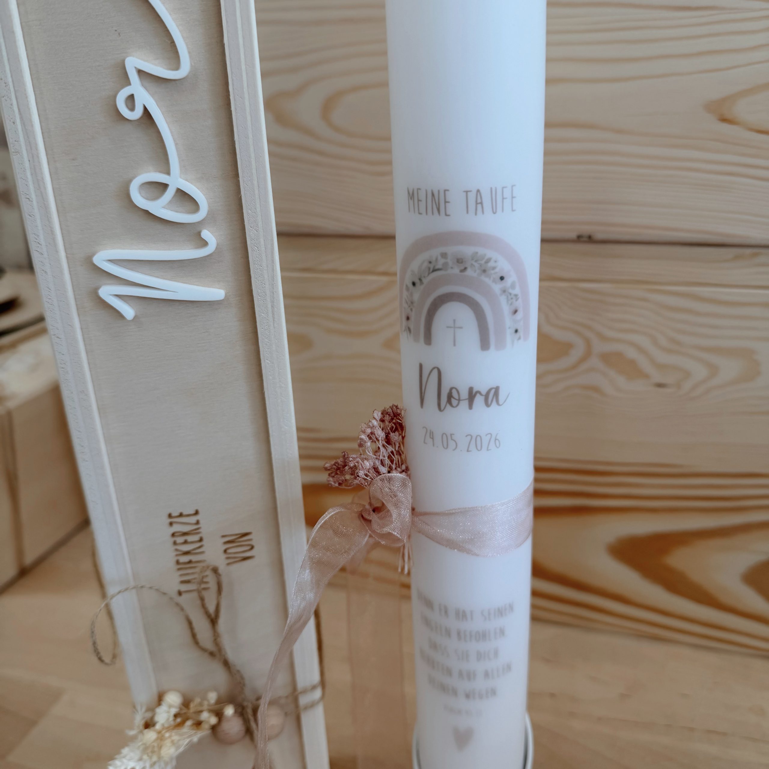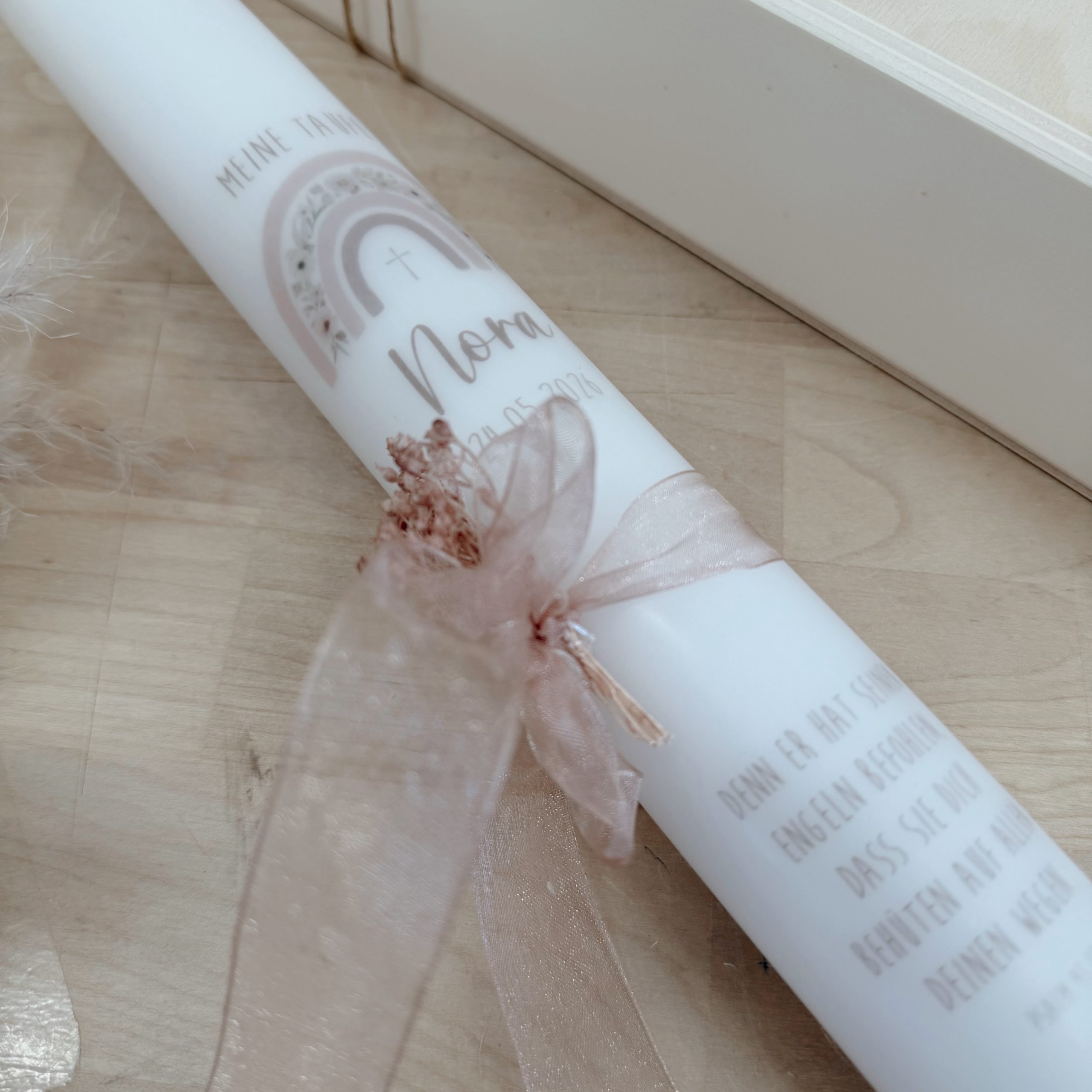 Super schöne und hochwertige Taufkerze, Kommunionkerze 40x4cm mit wunderschönem Regenbogen-Motiv in zarten Rosafarben und freiem Text/Taufspruch auf der Vorderseite. Das hellrosa Band und die Trockenblümchen machen die Kerze zu etwas ganz Besonderem.