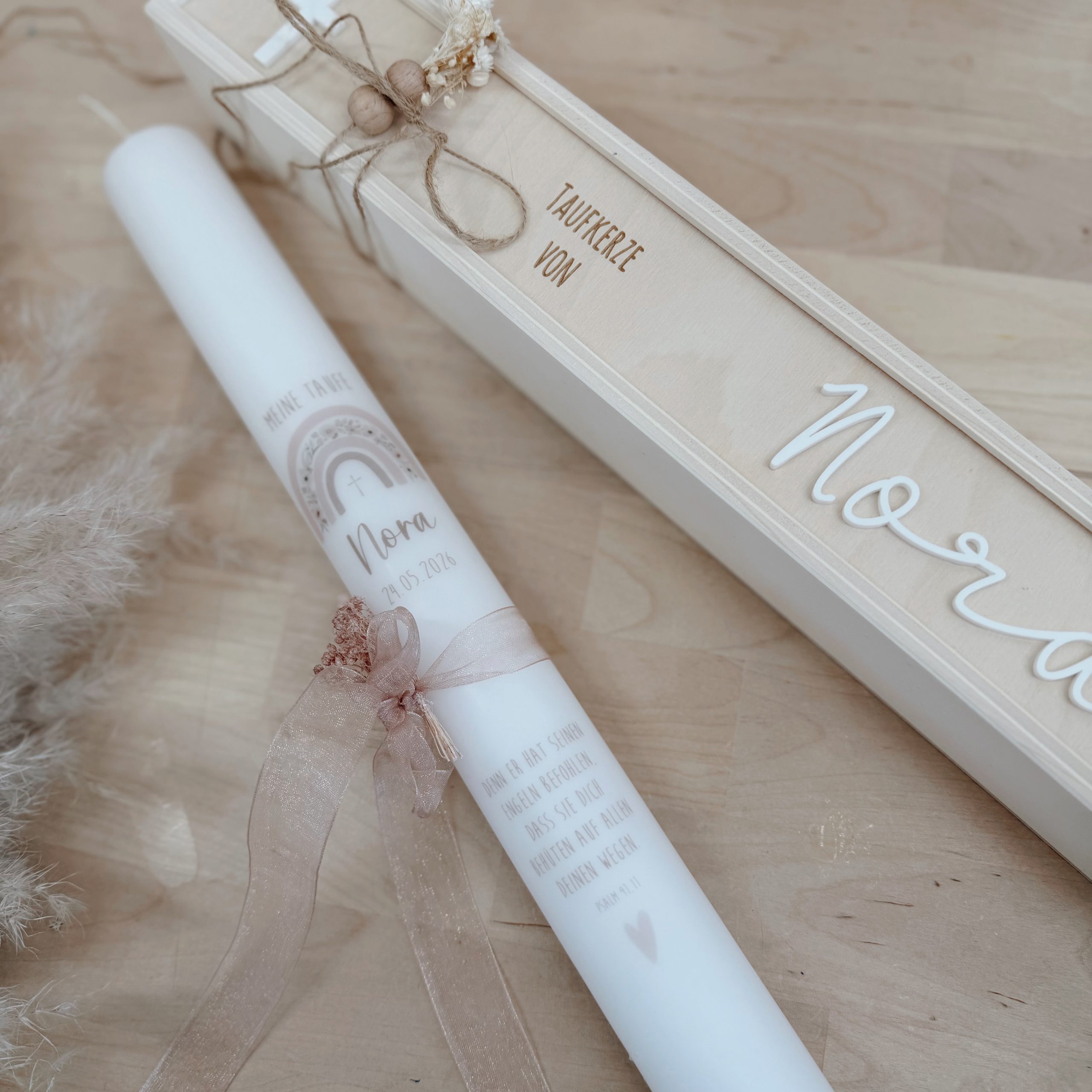 Mit viel Liebe gefertigt, hat die Kerze einen Durchmesser von ca. 4 cm und eine Höhe von ca. 40 cm. Die passende Kerzenbox misst ca. 46,5 cm in der Länge, 6,5 cm in der Breite und 6 cm in der Höhe – perfekt, um dieses besondere Erinnerungsstück sicher aufzubewahren.