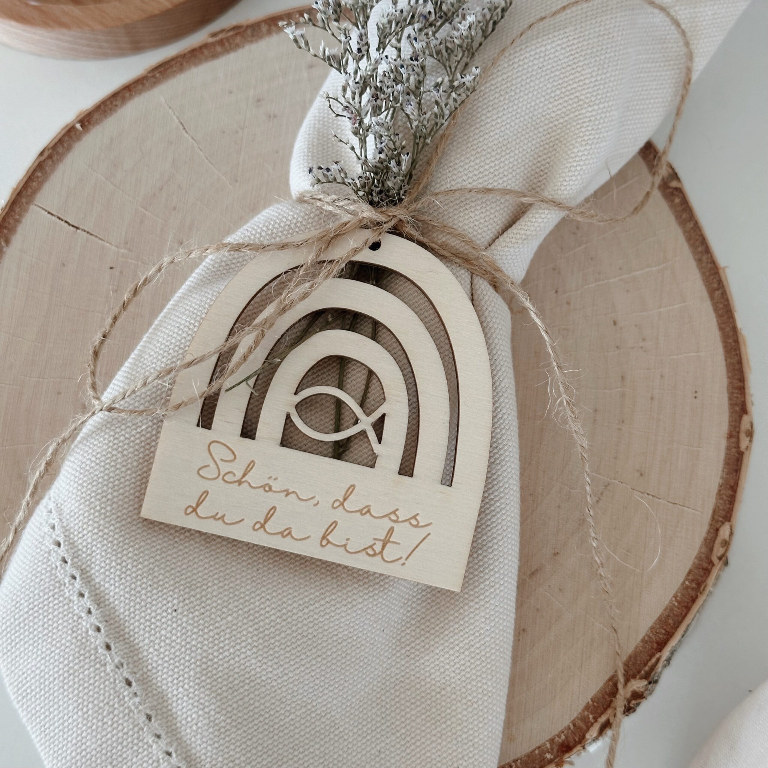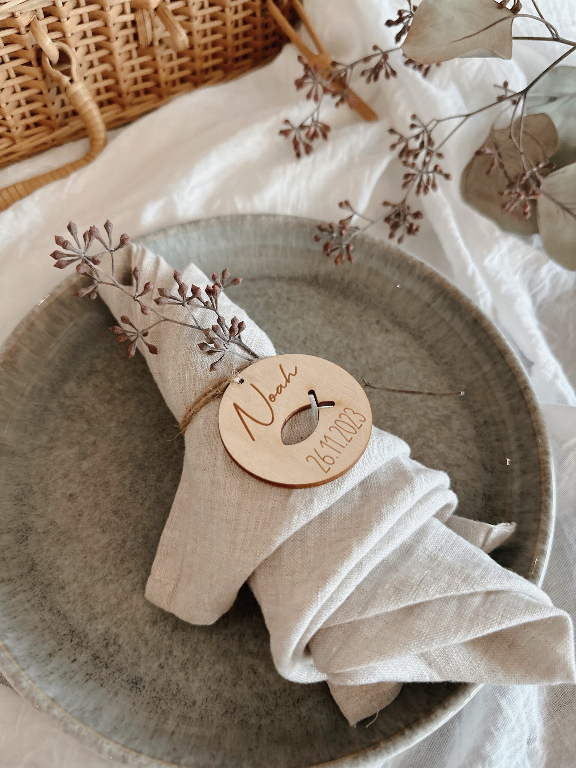 Kreiere im Handumdrehen einen Festtisch, der Deine Gäste begeistern wird! Unsere wunderschönen Servietten-Holzanhänger sind das perfekte Detail, um Deiner Tischdeko (zu Taufe / Kommunion / Konfirmation etc.) das gewisse Etwas zu verleihen.