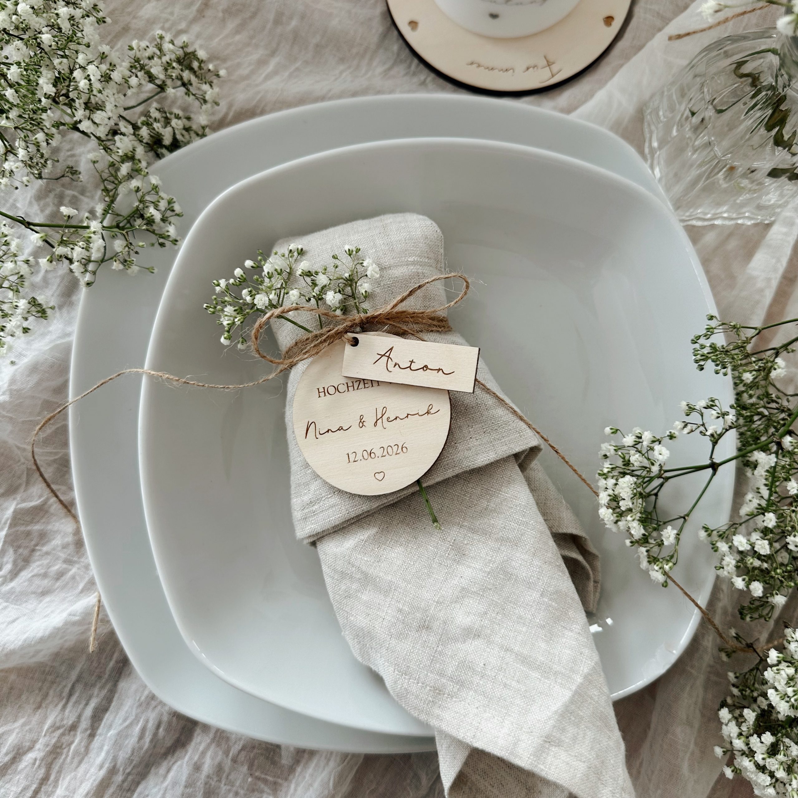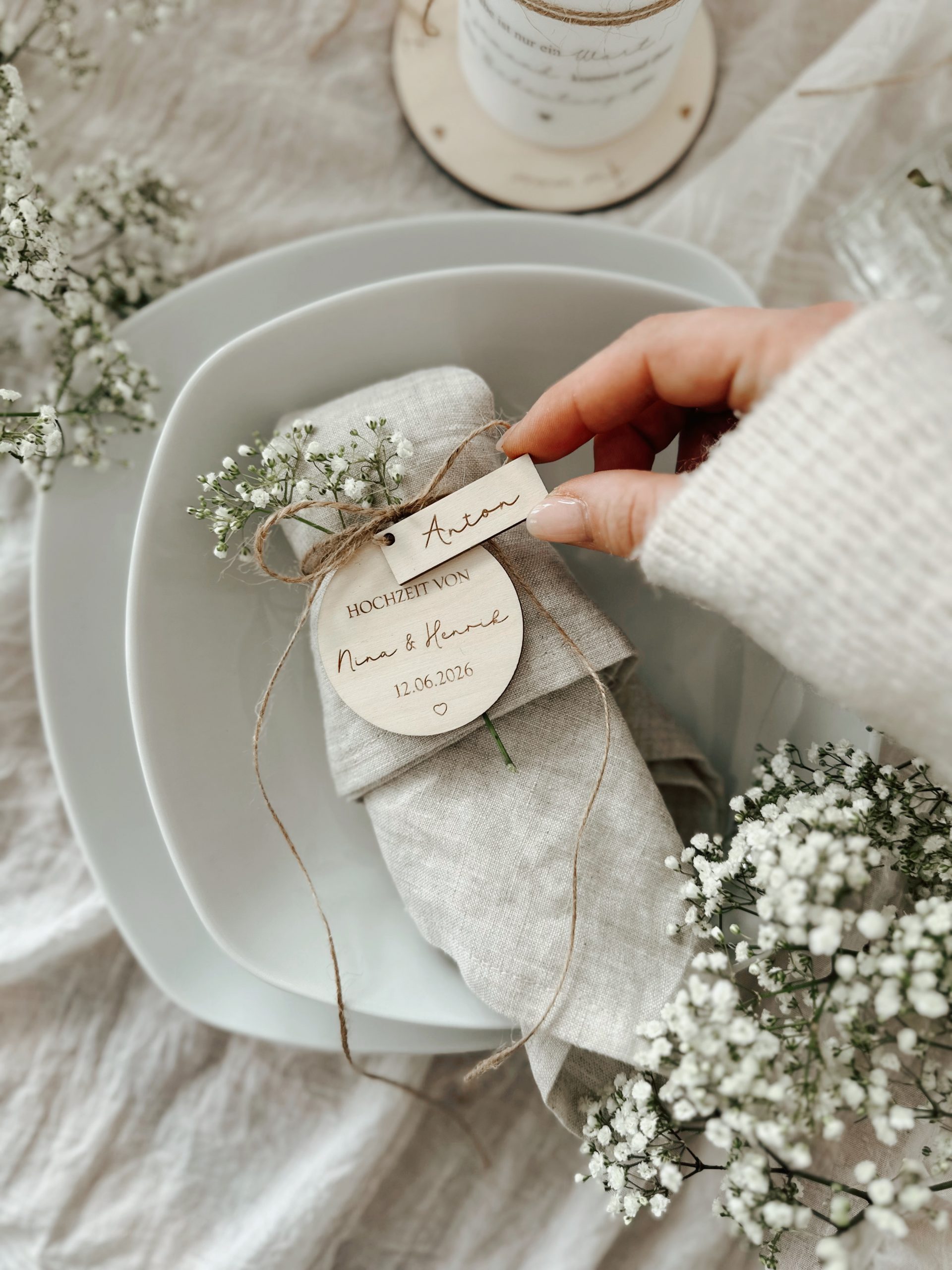 Wunderschöne Platzkarten / Serviettenanhänger zur Hochzeit, Taufe, Kommunion oder Konfirmation – natürlich, liebevoll und personalisierbar.
