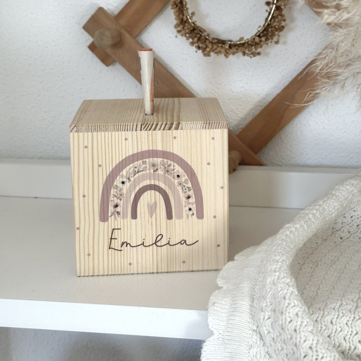 Unsere personalisierte Spardose „Regenbogen“ ist ein liebevolles Geschenk zur Geburt, Taufe oder zum Kindergeburtstag. Das süße Regenbogenmotiv in Altrosa-Tönen wird hochwertig auf das Holz gedruckt und macht jede Spardose zu einem einzigartigen Hingucker im Kinderzimmer. Mit der individuellen Namenspersonalisierung entsteht ein ganz persönliches Erinnerungsstück, das kleine Sparmomente besonders magisch macht.