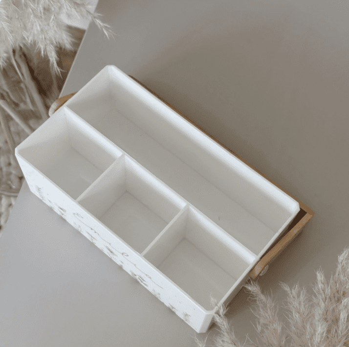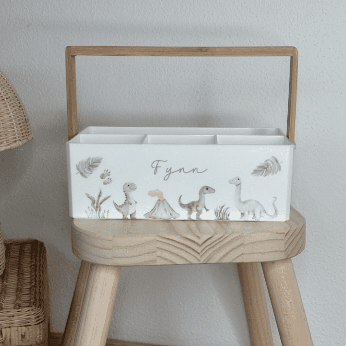 Bringe Ordnung und Freude ins Kinderzimmer mit unserem liebevoll gestalteten Schreibtisch Organizer für Kinder. Mit süßen zarten Dino-Motiven wird der Stiftehalter zum echten Hingucker auf jedem Schreibtisch und kann dank des Griffs an jeden Ort transportiert werden. In den praktischen Fächern finden Stifte, Schere, Lineal und kleine Schätze ihren festen Platz, so bleibt mehr Raum zu malen und basteln. Das Besondere: dein Organizer wird individuell mit dem Namen des Kindes personalisiert. Dadurch wird er nicht nur zu einem nützlichen Helfer im Alltag, sondern auch zu einem ganz persönlichen Lieblingsstück.