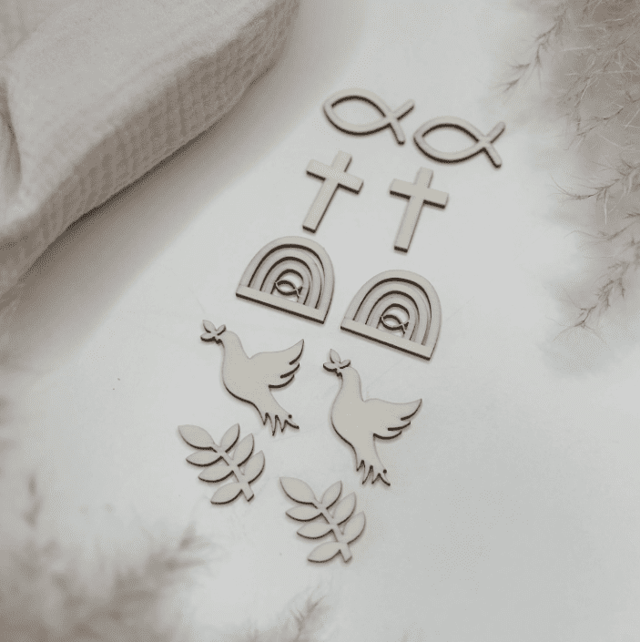 • 1 Set gemischt (10 Stück – enthält je 2 Motive: Regenbögen, Tauben, Fische, Zweige und Kreuze)