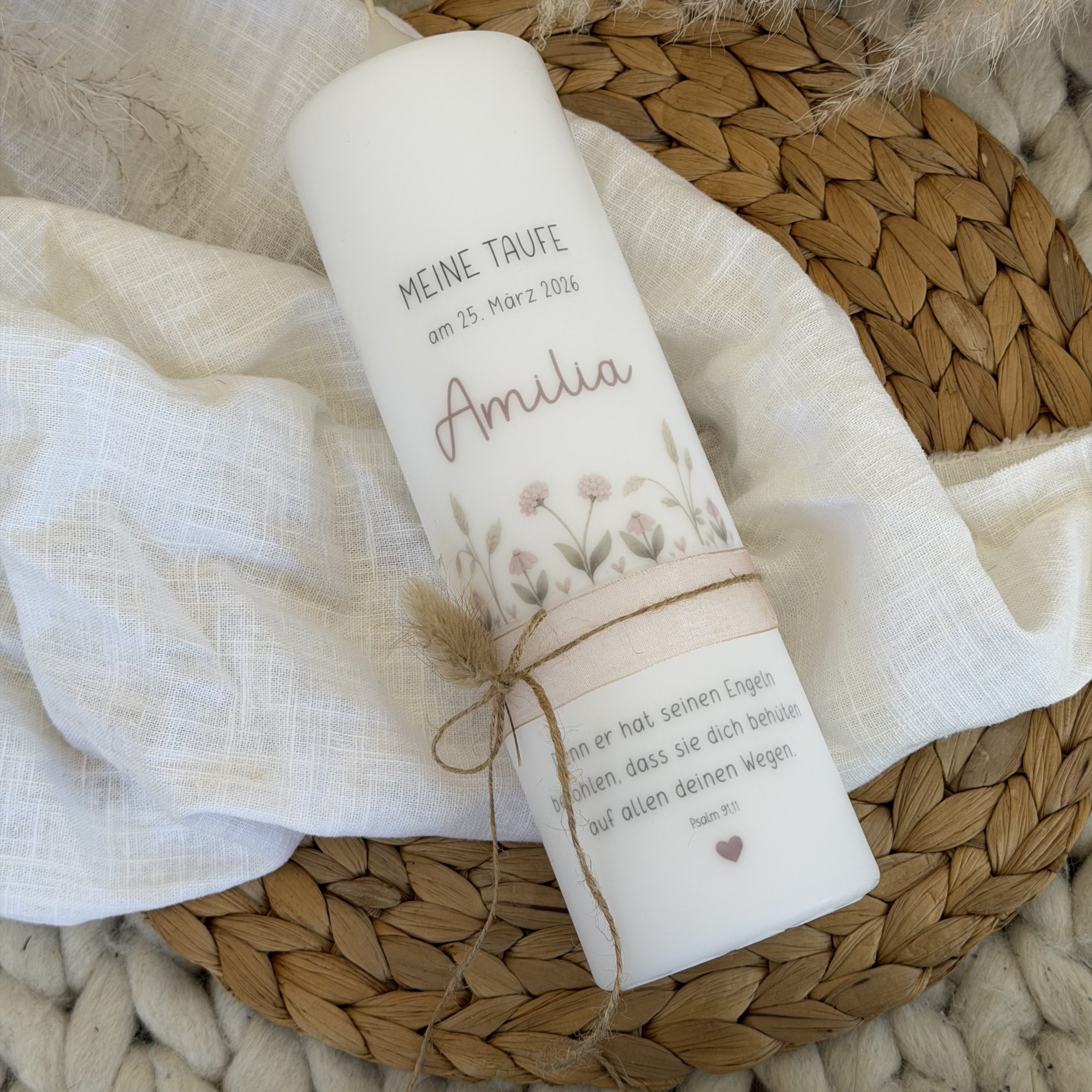 Mit viel Liebe gestalten wir jede Taufkerze personalisiert mit Name und Datum individuell für dich. Die feine Blumenwiese im Boho-Stil wirkt weich, harmonisch und zeitlos – perfekt für eine moderne Mädchen-Taufe.