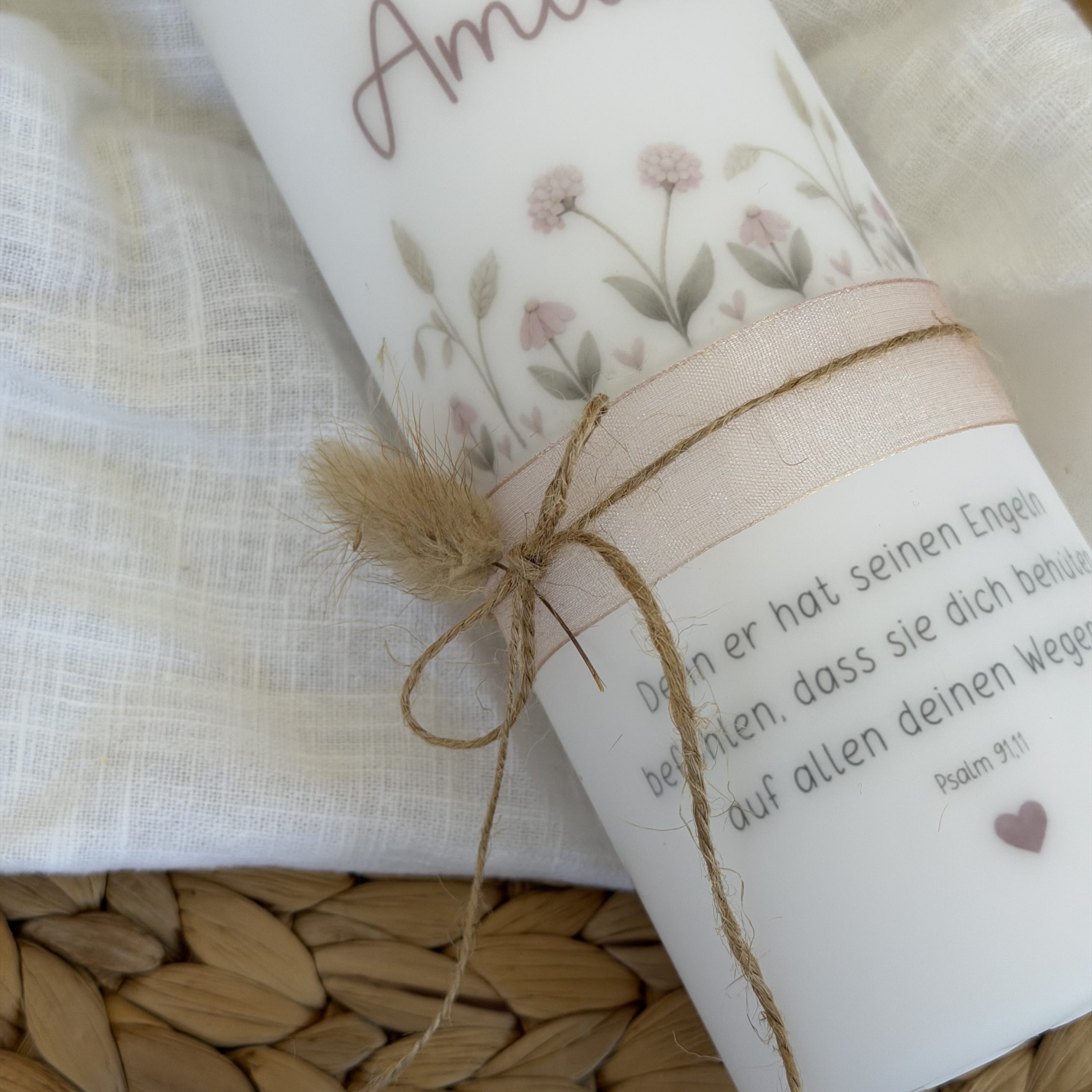 Bitte beachte: Jede Kerze entsteht in sorgfältiger Handarbeit. Kleine Abweichungen zu den Fotos sowie leichte Unterschiede bei den Trockenblumen sind völlig normal – und machen deine Taufkerze zu einem einzigartigen Unikat, genauso besonders wie euer Kind.