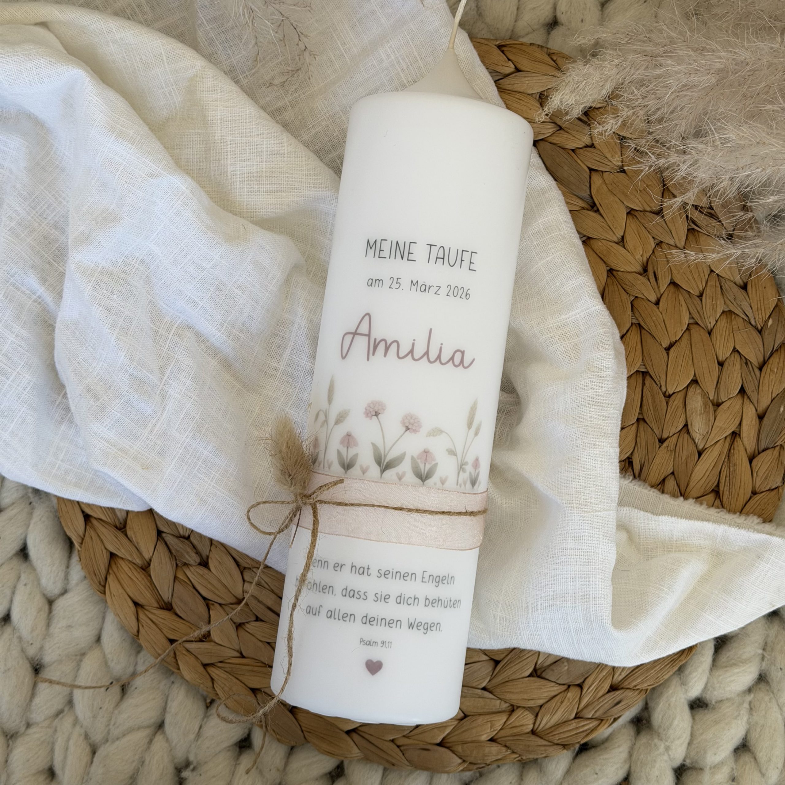 Unsere personalisierte Taufkerze „Blumenzauber“ begleitet diesen besonderen Tag mit zarten aquarelligen Wildblumen in sanften Rosatönen, liebevollen Details und dem Namen deines Kindes im Mittelpunkt. Ein Herzenslicht, das Geborgenheit schenkt – am Tag der Taufe und weit darüber hinaus.