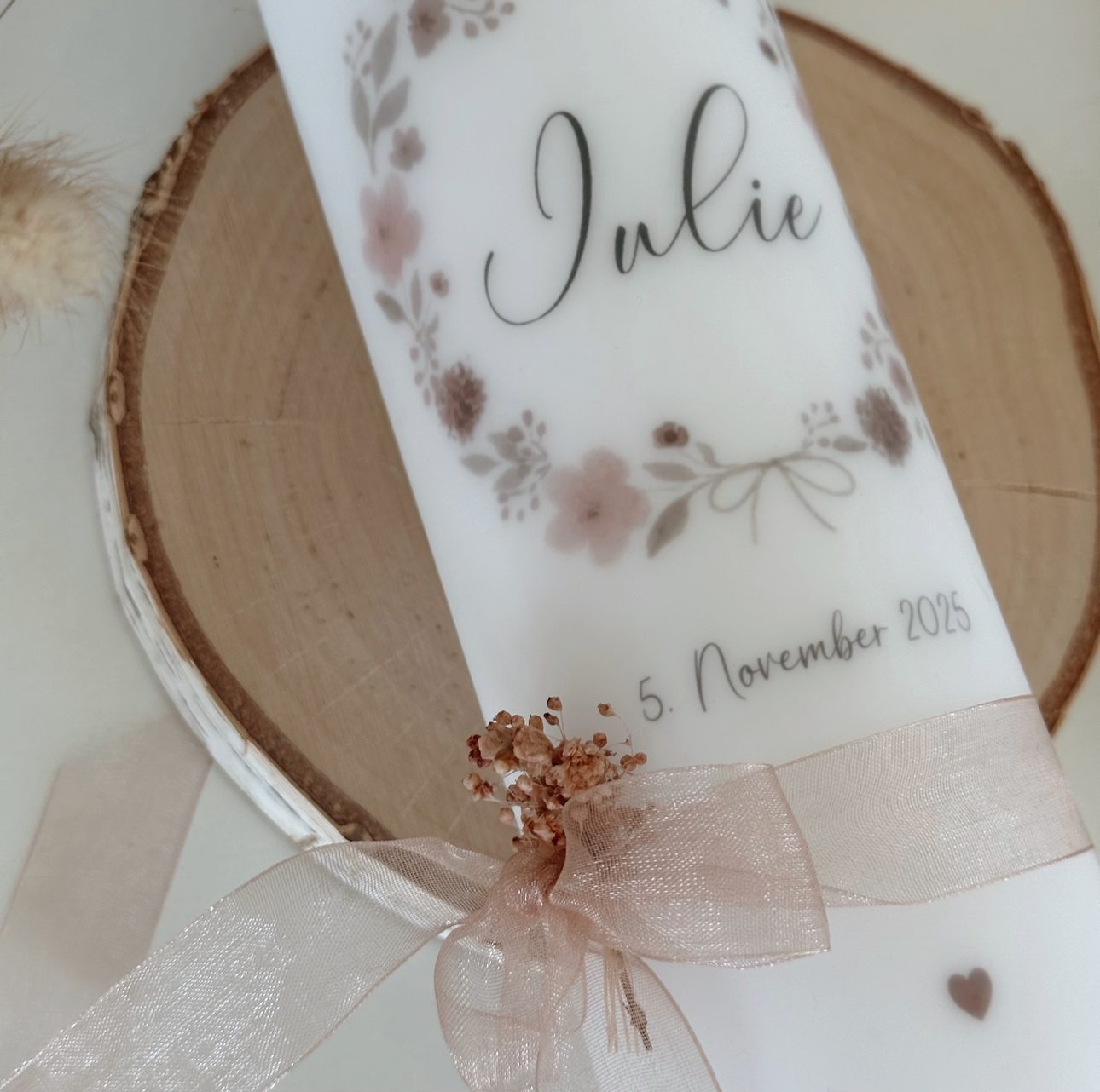 Die Taufkerze „Julie“ ist mit seinem rosafarbenen Blumenkanz, mit schönen Zweigen und Blüten und Kreuz, ein echter zeitloser, wunderschöner Wegbegleiter. Die Häkelborte und die Trockenblumen machen Kerze zu etwas ganz Besonderem.