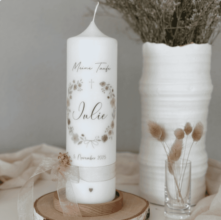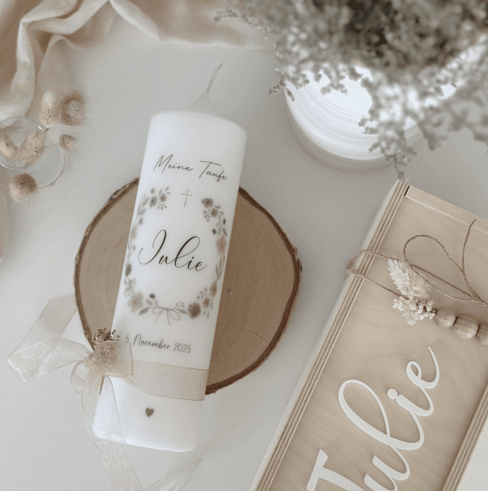 Unsere wunderschöne, personalisierte Taufkerze ist nicht nur ein wichtiges Symbol der Taufe, das das Licht Christi repräsentiert. Sie soll das Taufkind auf seinem Lebensweg begleiten. Jede Taufkerze ist ein Unikat und wird in unserer kleinen Freudenkaefer-Manufaktur in Deutschland mit viel Herz, Sorgfalt und Liebe zum Detail gestaltet – handgefertigt, hochwertig und individuell.