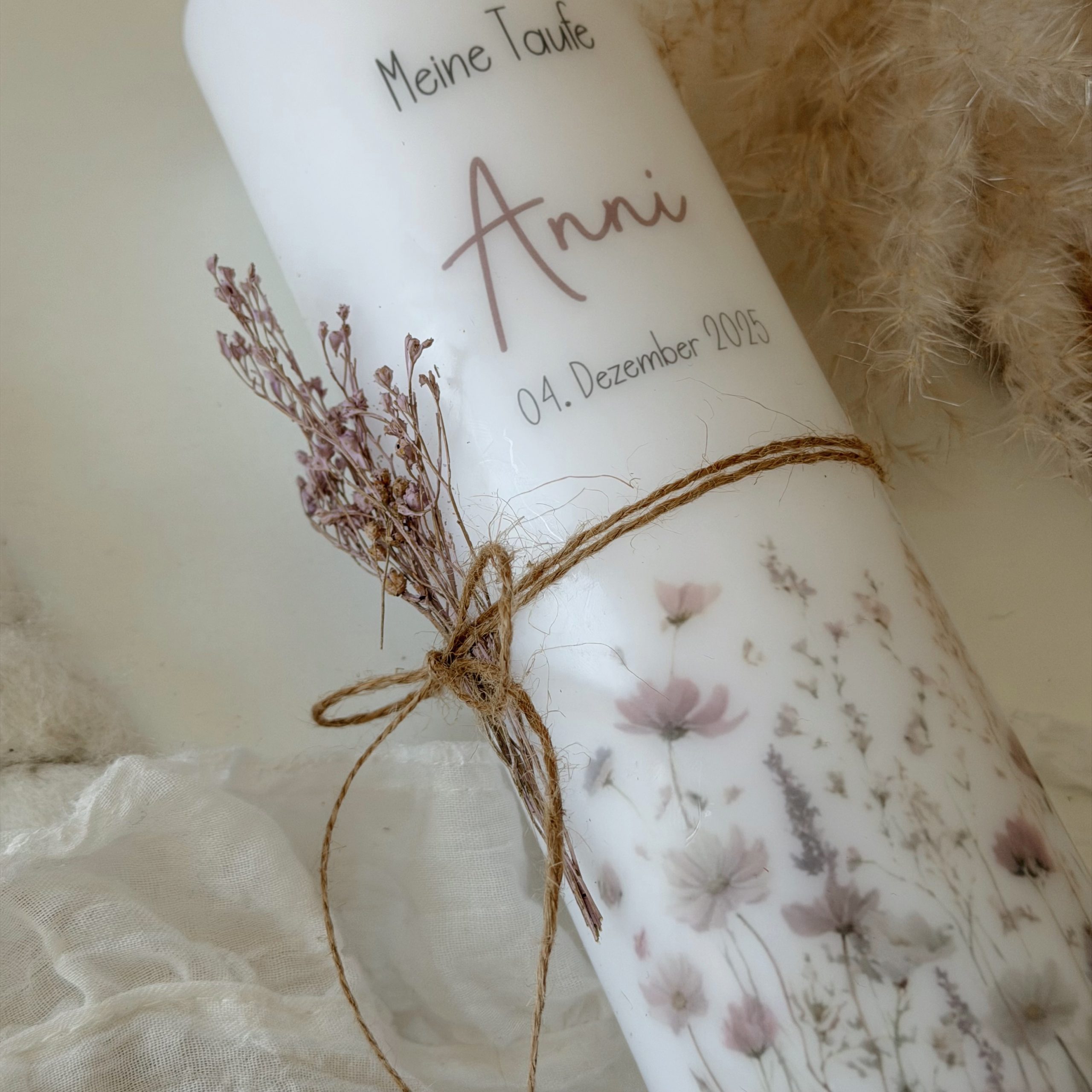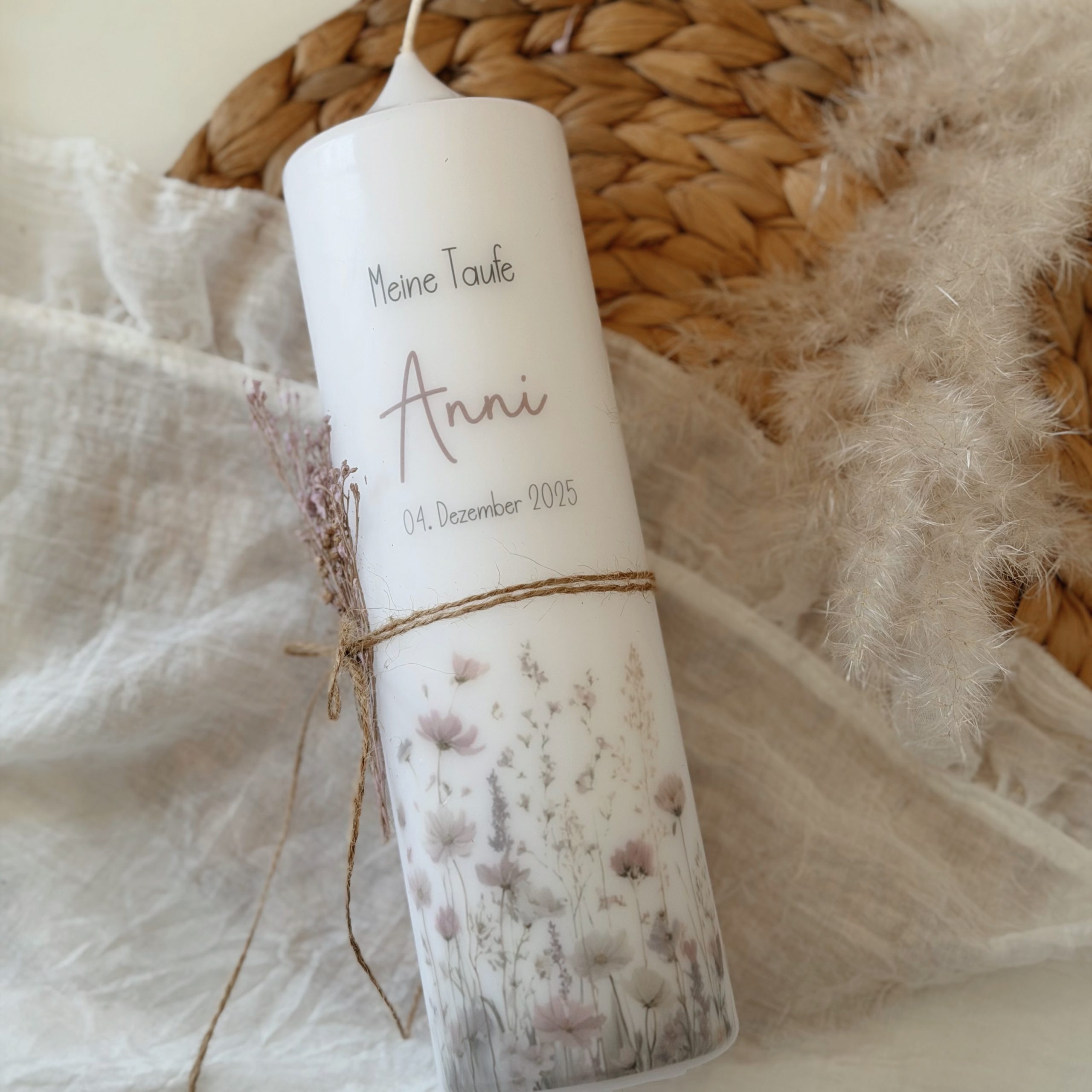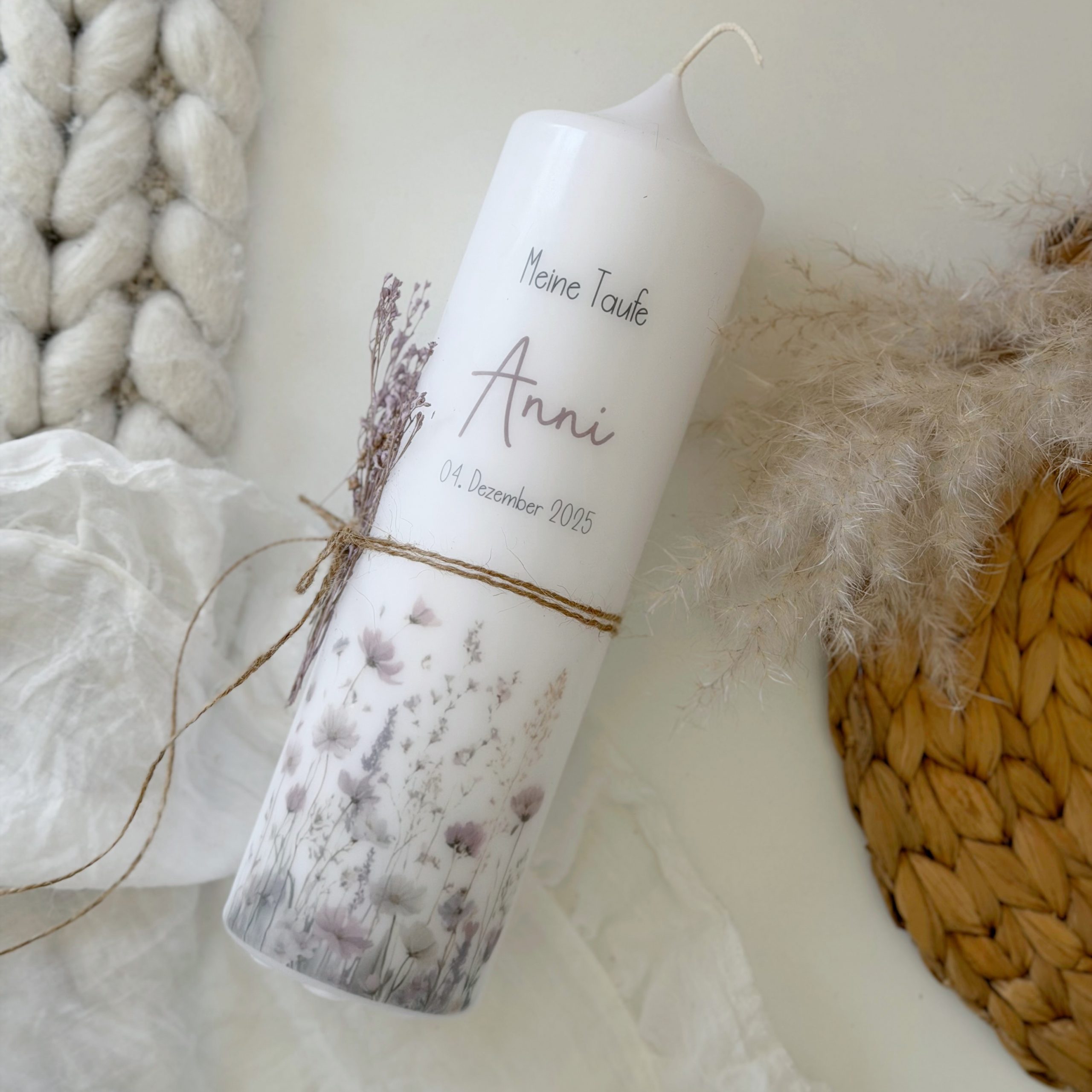Die Taufkerze „Lila Blumenwiese“ mit ihren zarten Aquarellblumen in sanften lila-rosa-Pastellfarben passt perfekt zu modernen und klassischen Tauffesten gleichermaßen. Unsere Kerzen sind ein besonderes Erinnerungsstück an diesen einmaligen Tag und bleiben als Andenken an die Taufe ein wertvoller Begleiter fürs Leben.