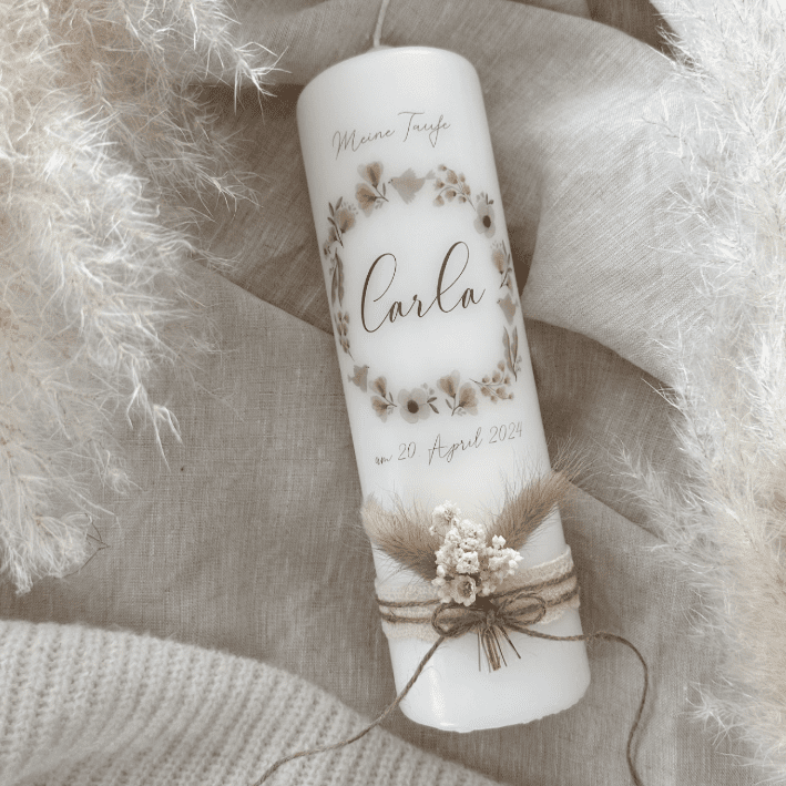 Unsere liebevoll gestaltete Taufkerze mit ihrem zarten Blumenkranz Motiv mit zarten Tauben in warmen Erdfarben – beige, braun – ist ein echtes Herzensstück für diesen besonderen Tag. Die feine Spitzenborte, das natürliche Jutegarn und die sanften Trockenblümchen verleihen der Kerze einen einzigartigen, zeitlosen Charme, der jede Taufe zu etwas ganz Besonderem macht.