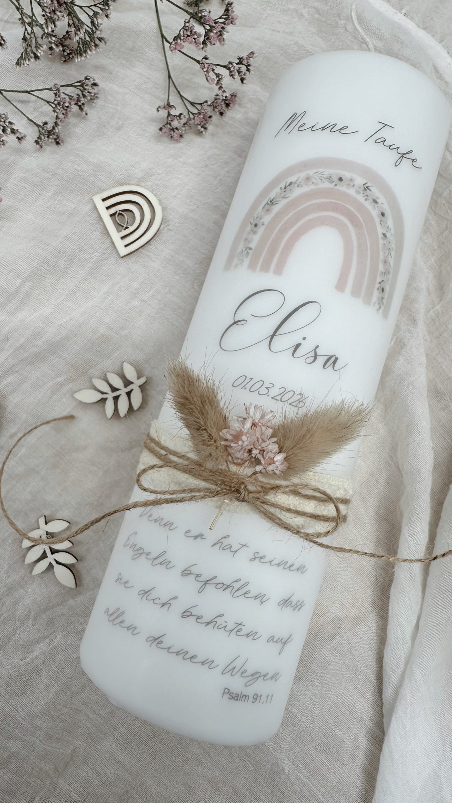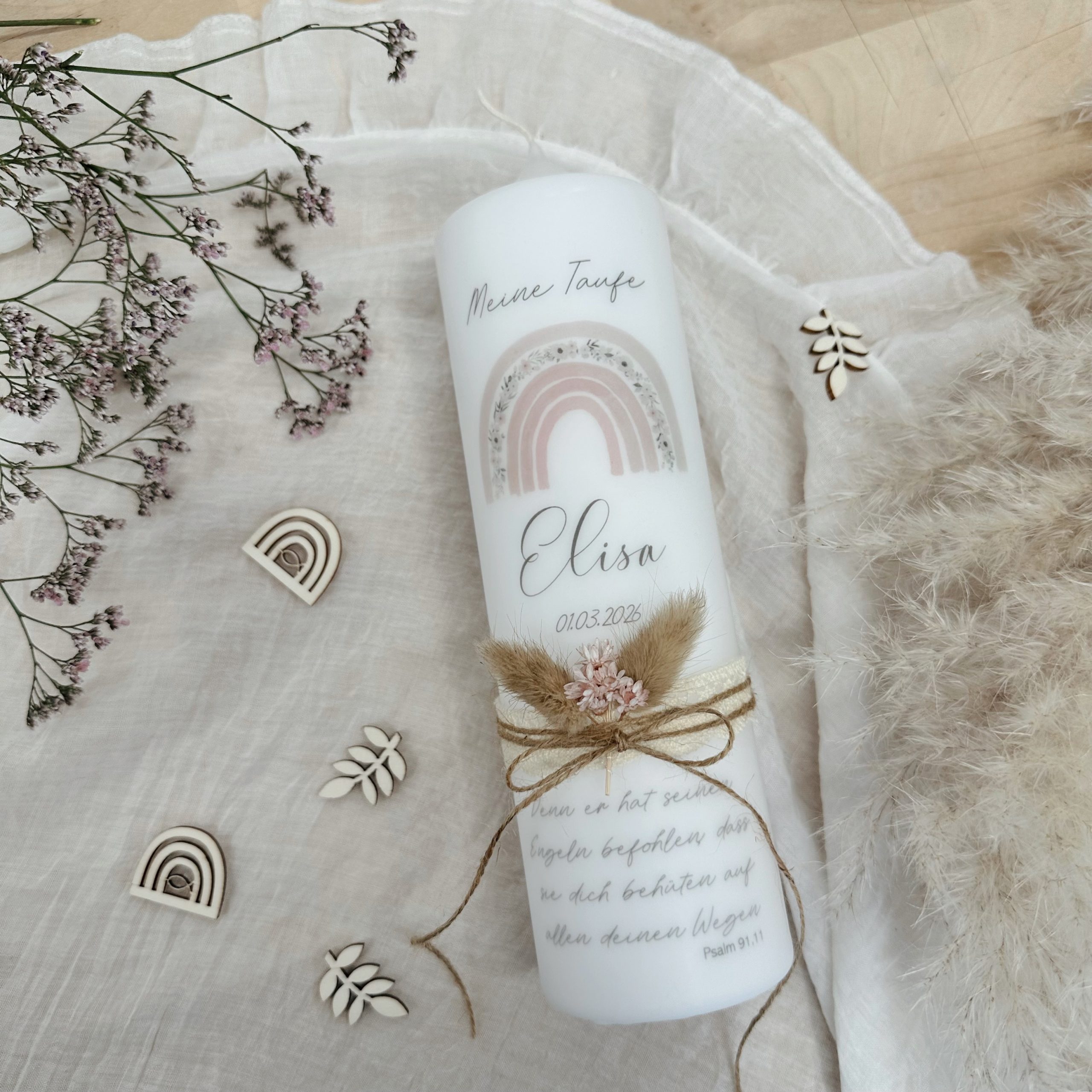 Unsere liebevoll gestaltete Taufkerze mit ihrem zarten Regenbogen-Motiv in süßen Rosa-Tönen – ist ein echtes Herzensstück für diesen besonderen Tag. Die feine Spitzenborte, das natürliche Jutegarn und die sanften Trockenblümchen verleihen der Kerze einen einzigartigen, zeitlosen Charme, der jede Taufe zu etwas ganz Besonderem macht.