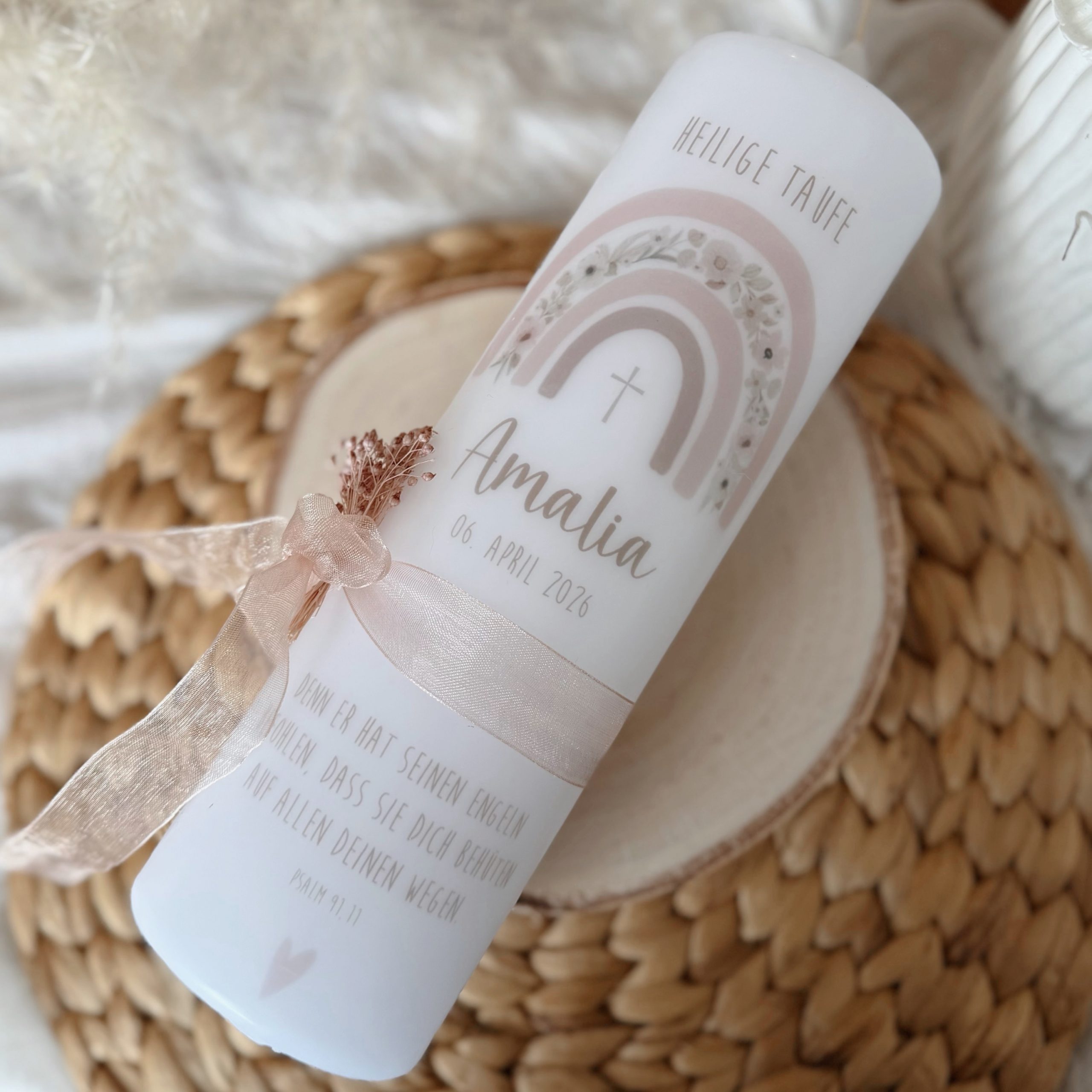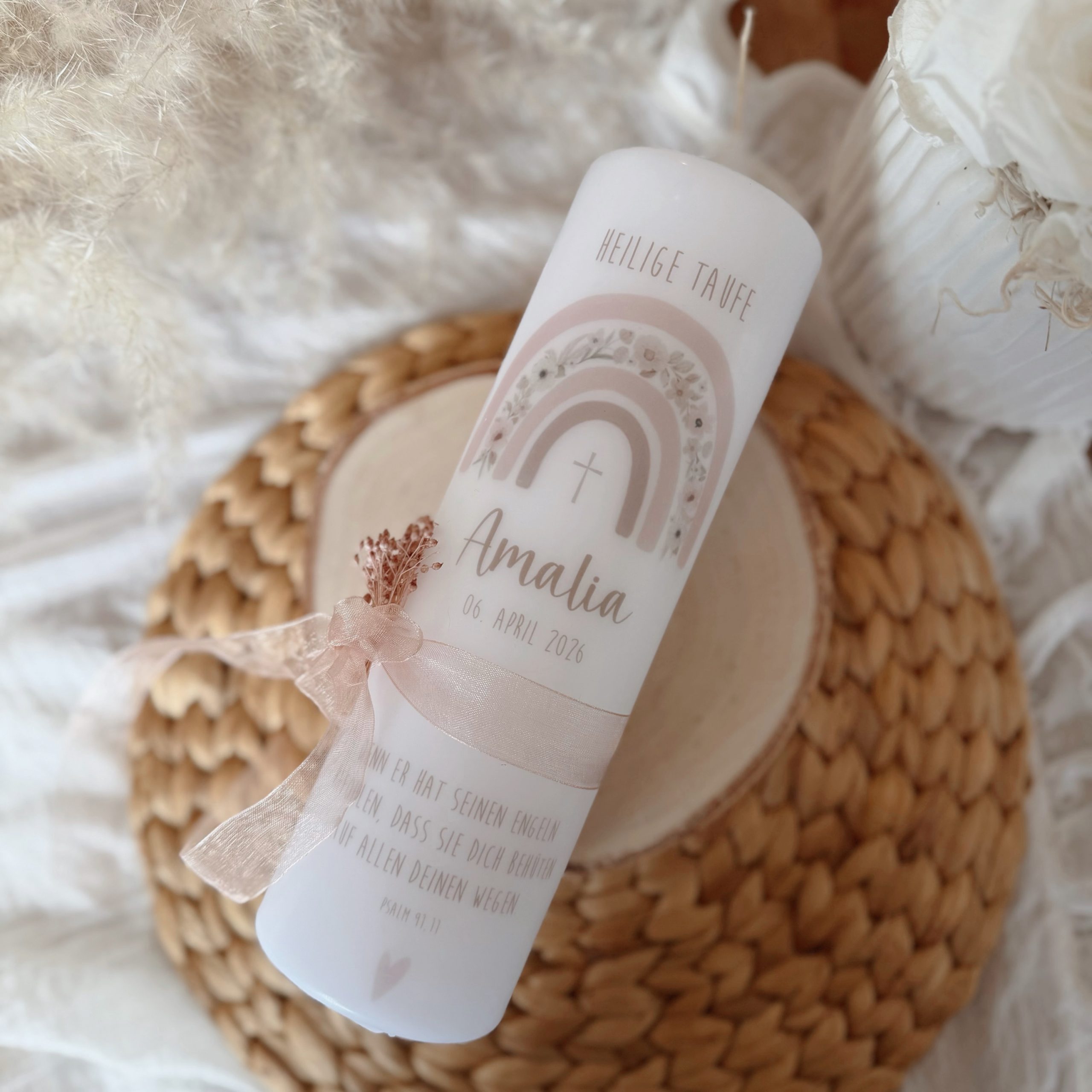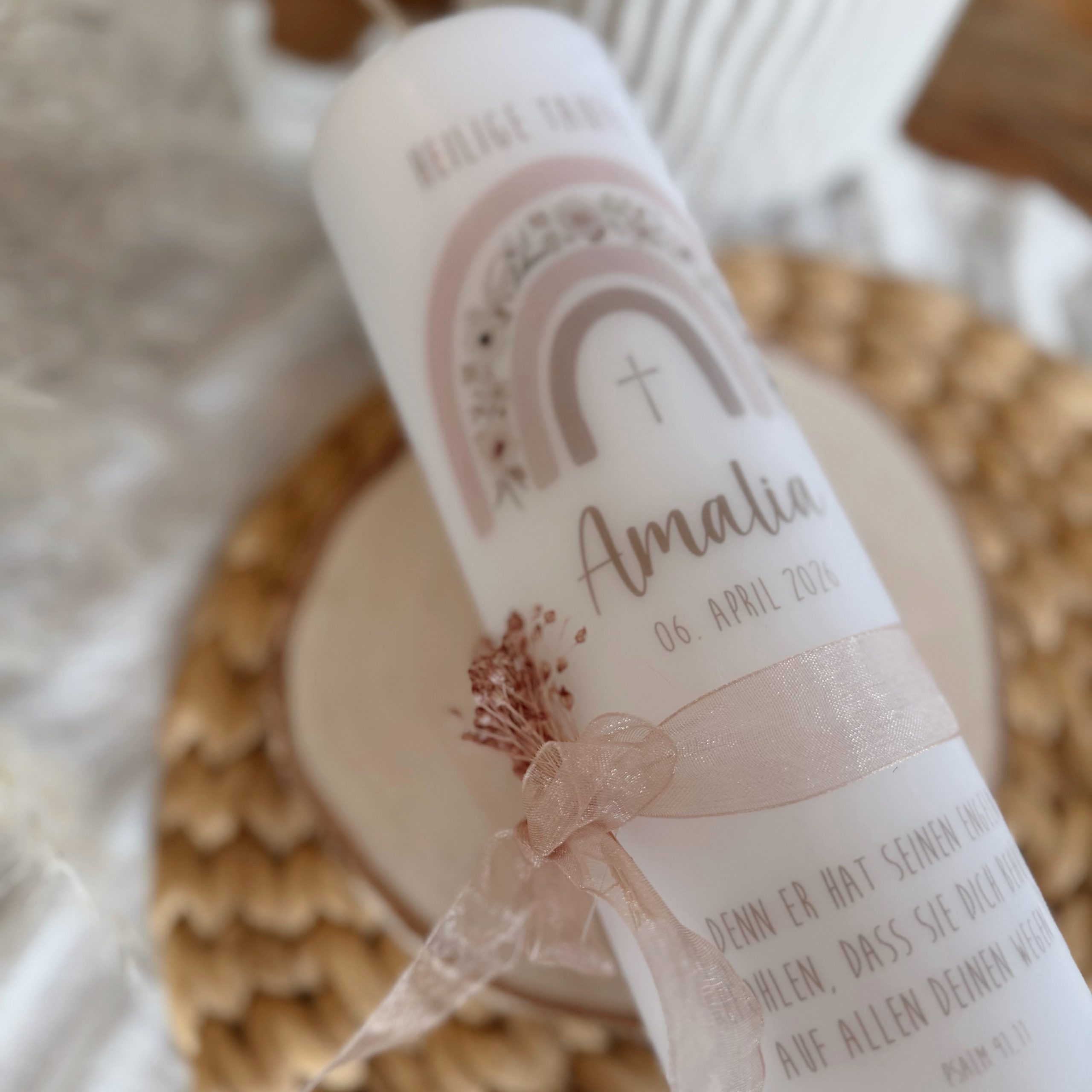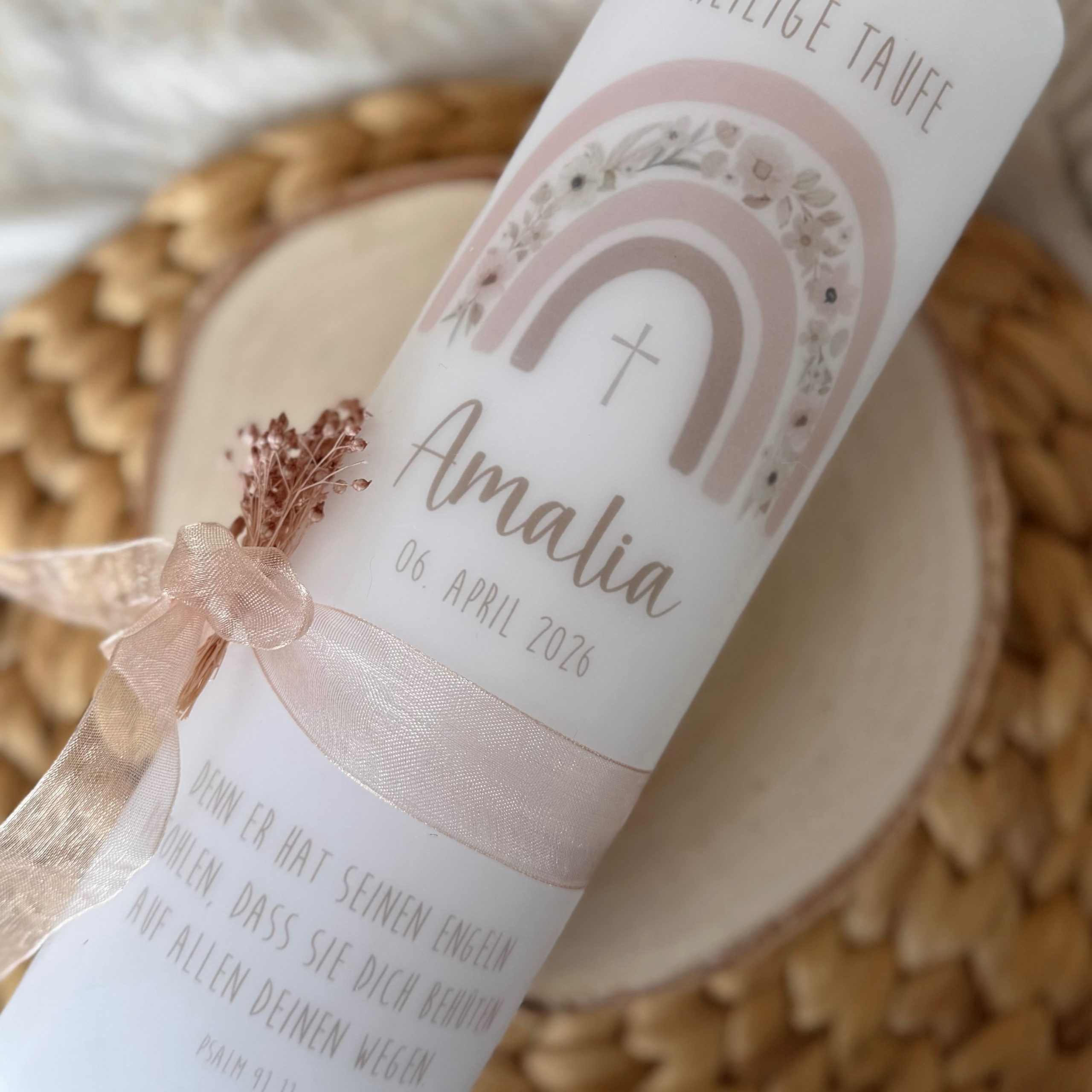 Die Taufkerze „ROSA“ bezaubert mit einem wunderschönen Regenbogen-Motiv in zarten Rosa-, Hellrosa- und Brauntönen. Das elegante Satinband, die feinen Trockenblumen und die liebevollen Details – ein Herz und ein Kreuz als zarte Symbole für Liebe und Segen – machen diese Kerze zu etwas ganz Besonderem.