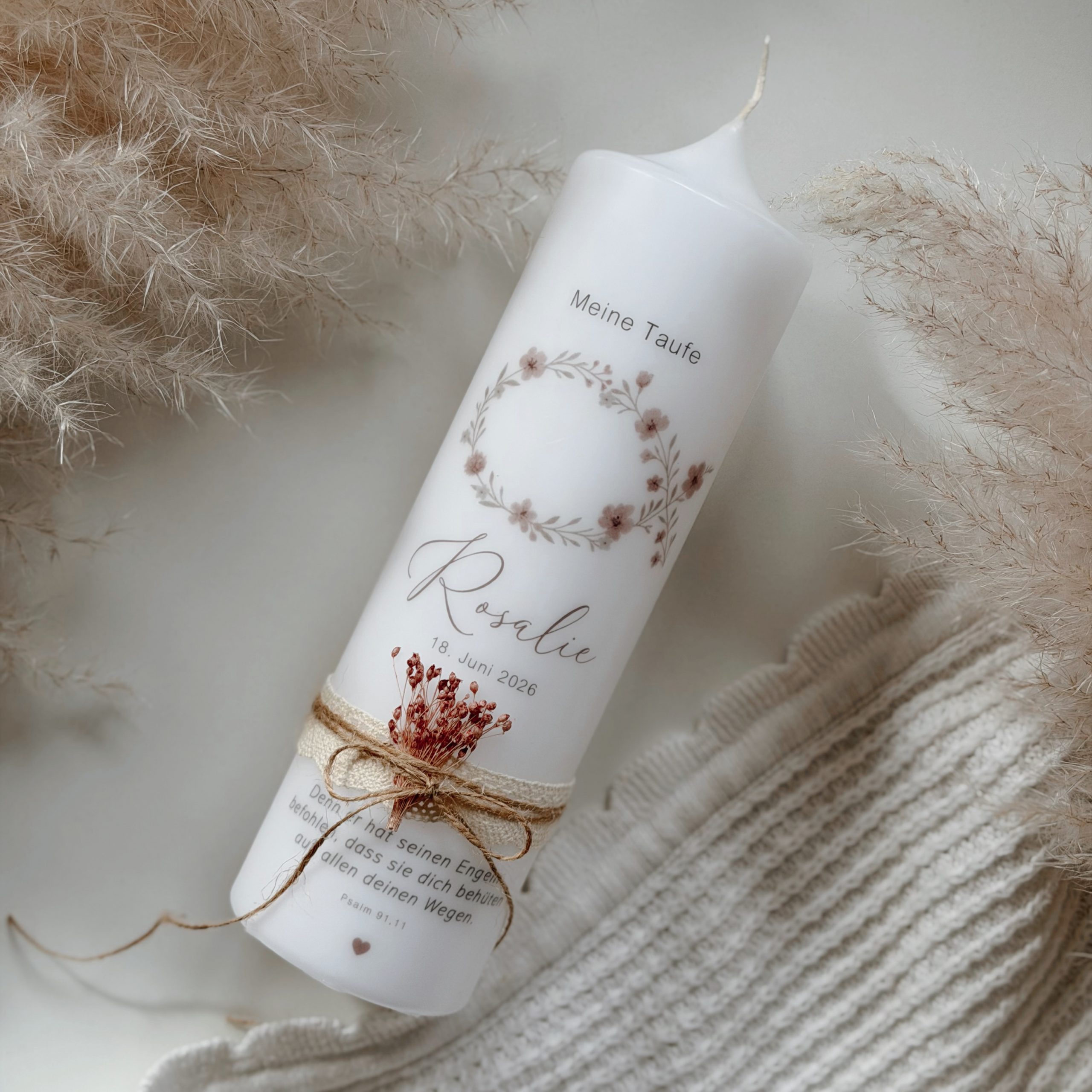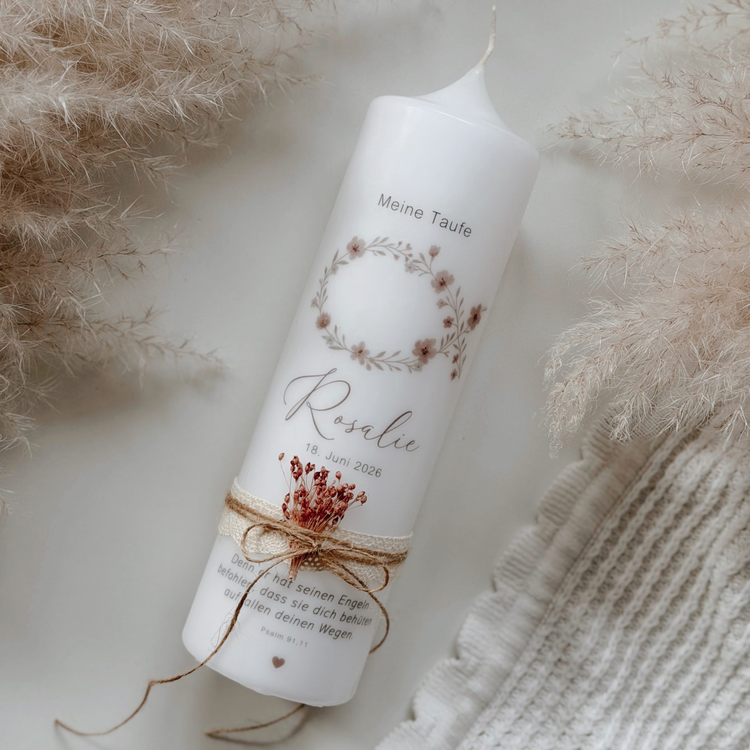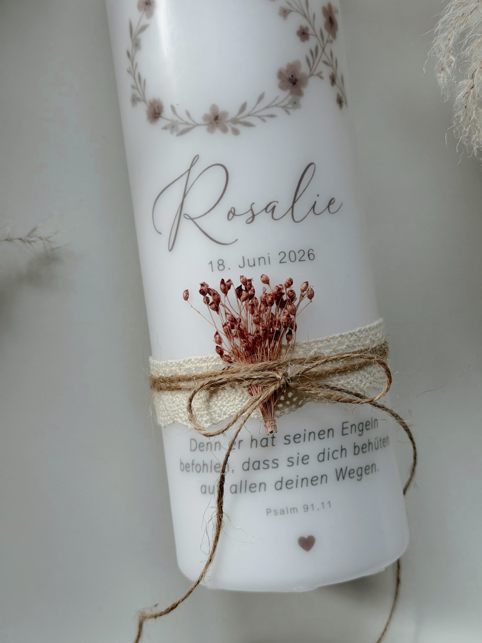 Bitte beachte: Jede Kerze entsteht in sorgfältiger Handarbeit. Kleine Abweichungen zu den Fotos sowie leichte Unterschiede bei den Trockenblumen sind völlig normal – und machen deine Taufkerze zu einem einzigartigen Unikat, genauso besonders wie euer Kind.