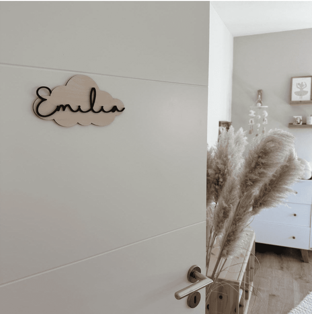 Das Türschild wird mit dem Namen deines Kindes personalisiert (wahlweise Schrift in schwarz oder weiß) und verwandelt sich so in ein einzigartiges Unikat. Mit seiner weichen Wolkenform passt es perfekt an jede Kinderzimmertür – egal ob verspielt, modern oder im skandinavischen Stil eingerichtet.