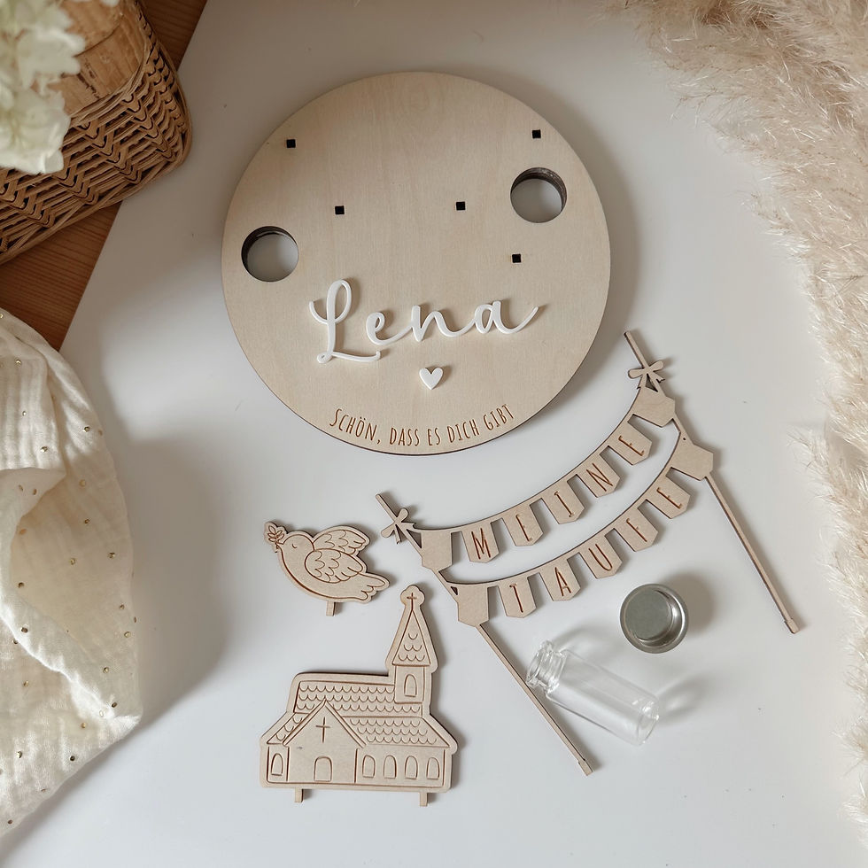 Süßer Kerzenteller zur Taufe personalisiert mit Kirchenmotiv, Taube und Vase