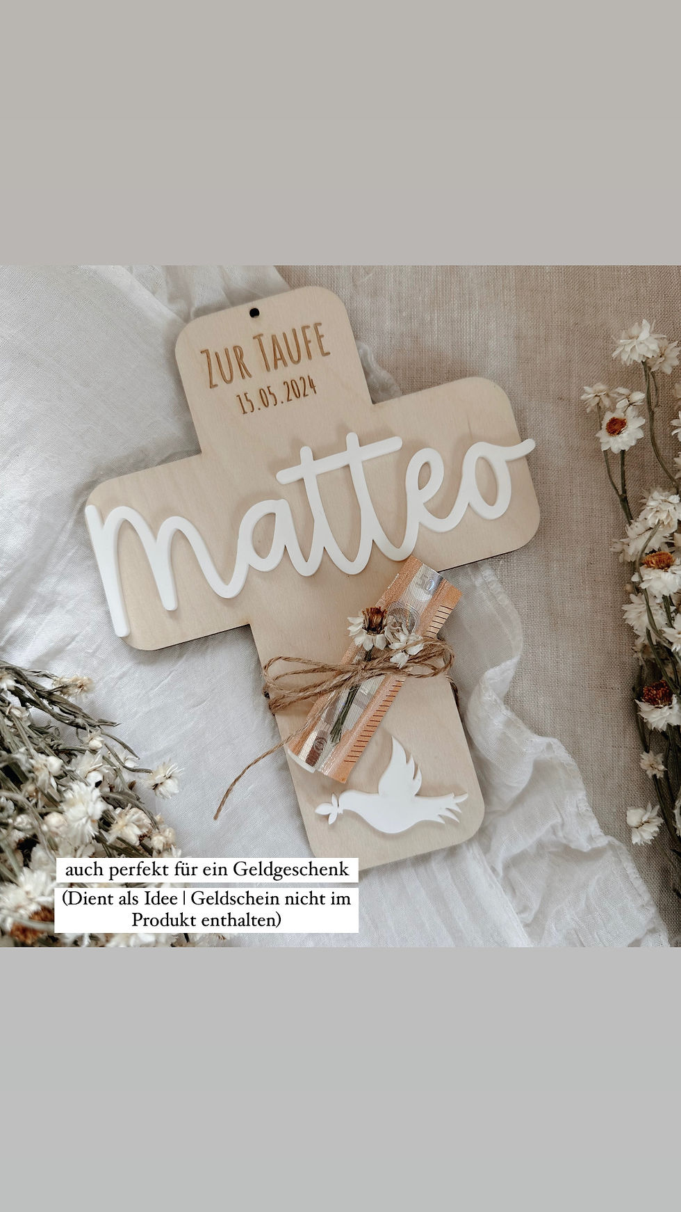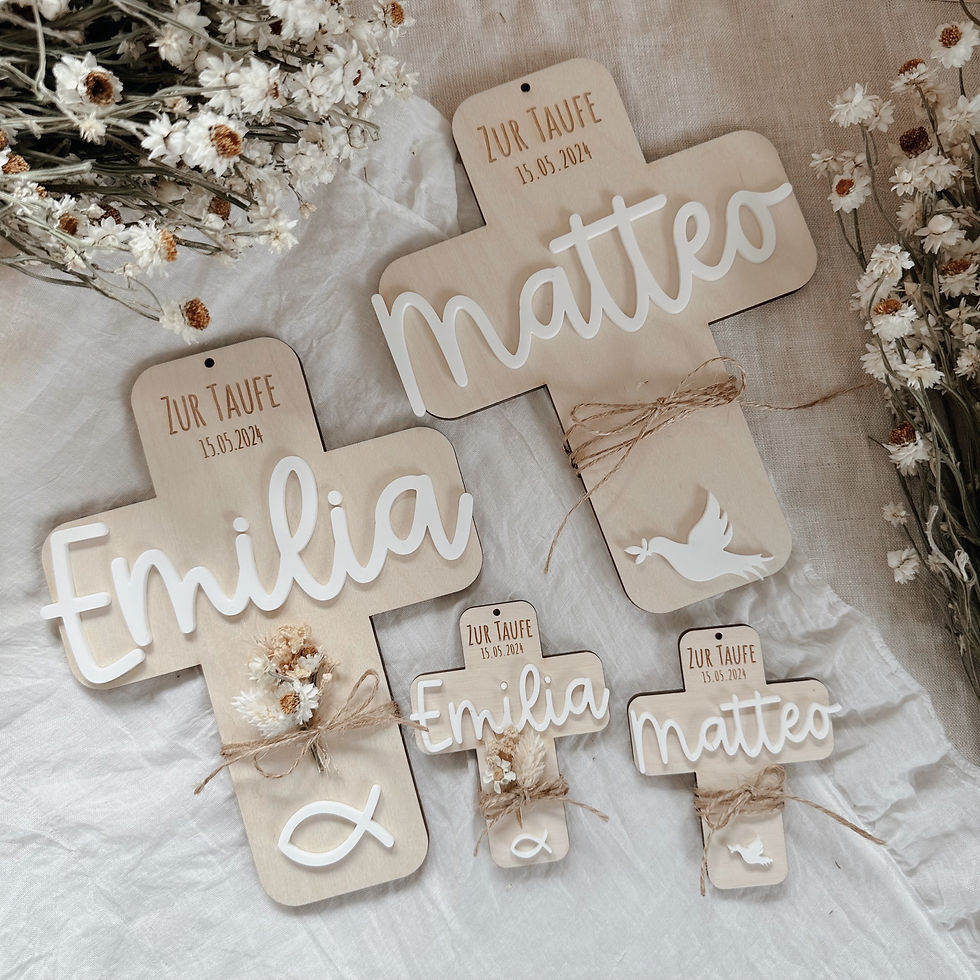 Personalisierbares Kreuz zur Taufe mit Name und Taufdatum in unterschiedlichen A