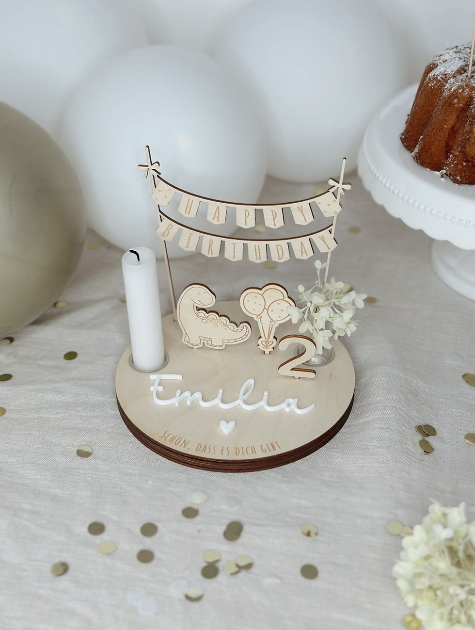 Süßer Geburtstagsteller mit Dinosaurier, Girlande / Kerze / Kindergeburtstag